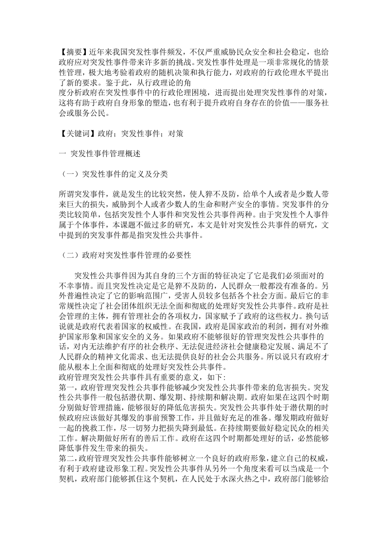 【摘要】近年来我国突发性事件频发,不仅严重威胁民众安全和社会稳定,也给政府应对突发性事件带来许多新的挑战。突发性事件处理是一项非常规化的情景性管理,极大地考验着政府的随机决策和执行能力,对政府的行政伦理水平提出了新的要求。鉴于此,从行政理论的角度分析政府在突发性事件中的行政伦理困境,进而提出处理突发性事件的对策,这将有助于政府自身形象的塑造,也有利于提升政府自身存在的价值一一服务社会或服务公民。【关键词】政府:突发性事件:对策一突发性事件管理概述(一)突发性事件的定义及分类所谓突发事件,就是发生的比较突然,使人猝不及防,给单个人或者是少数人带来巨大的损失,威肋胁到个人或者少数人的生命和财产安全的事情。突发事件的分类比较简单,包括突发性个人事件和突发性公共事件两种。由于突发性个人事件属于个体事件,本课题不做过多的研究,本文是针对突发性公共事件的研究,文中提到的突发事件都是指突发性公共事件。(二)政府对突发性事件管理的必要性突发性公共事件因为其自身的三个方面的特征决定了它是我们必须面对的不幸事情。而且突发性决定是它是猝不及防的,人民群众一般都没有准备的。另外普遍性决定了它的影响范围广,受害人员较多包括各个社会方面。最后它的非常规性决定了社会团体组织无法全面和彻底的处理好突发性公共事件。政府是社会管理的主体,拥有管理社会的各项权力,国家赋予了政府的这些权力。换句话说就是政府代表着国家的权威性。在我国,政府是国家政治的利剑,拥有对外维护国家形象和国家安全的义务。如果政府不能够很好的管理突发性公共事件的话,对内无法维护有序的社会秩序、无法促进经济社会健康稳定发展、满足不了人民群众的精神文化需求、也无法提供良好的社会公共服务。所以说只有政府才能从根本上全面和彻底的处理好突发性公共事件。政府管理突发性公共事件具有重要的意义,如下:第一,政府管理突发性公共事件能够减少突发性公共事件带来的危害损失。突发性公共事件一般包括潜伏期、爆发期、持续期和解决期。政府如果在这四个时期分别做好管理措施,能够很好的降低危害损失。突发性公共事件处于潜伏期的时候政府应该做好其爆发的事前预警工作,并且做好充足的准备。爆发期政府做好一起的挽救工作,尽一切努力把损失降到最低。在持续期要做好稳定民众的相关工作。解决期做好所有的善后工作。政府在这四个时期都处理好的话,必然能够降低事件发生带来的损失。第二,政府管理突发性公共事件能够树立一个良好的政府形象,建立自己的权威,有利于政府建设形象工程。突发性公共事件从另外一个角度来看可以当成是一个契机,政府部门能够抓住这个契机,在人民处于水深火热之中,政府部门能够给予他们帮助让他们安居乐业,这样政府部门必然能够提升形象、树立权威和巩固地位。第三,政府管理突发性公共事件有助于贯彻落实科学发展观、构建社会主义和谐社会。而突发性公共事件对人民群众造成极大地伤害,不利于社会的稳定和谐,所以说政府管理突发性公共事件不仅仅是贯彻落实科学发展的要求,而且还是构建和谐社会的必经之路。第四,政府管理突发性公共事件有利于我国在国际上塑造一个良好的负责任的大国形象。在当前复杂的国际环境下,我国经济发展迅猛,很容易被国外“人权主义”的名义干涉我国内政。当突发性公共事件发生了,人民的生命和财产安全受到威胁,如果政府不能有效的应对,或者是束手无策和袖手旁观,外国政府必然会以“人权主义”为借口干涉我国内政。所以说只有政府有效的应对和处理突发性公共事件,我国才能在世界舞台上塑造一个负责任的大国形象。(三)政府对突发性事件管理的理论基础第一,公共安全理论。所谓公共安全就是指每一个社会公民在过自己正常的生活的时候能够有一个有序的社会秩序和稳定和谐的公共社会。换句话说,即大多数人的生命和财产安全可以得到保障。公共安全管理,即政府为了维护社会治安,保护每一个公民的合法权益所进行的各项措施的总体。从政府所拥有的职能和权利来看,政府维护公共安全是固有的职责。在“夜警政府”年代,即使以“斯密”为代表的古典自由主义者坚持认为完全的市场竞争即可解决一切问题,但公共安全管理的管理行为必须是要由政府来执行。从理论上来看这是霍布斯等人对“自然状态”极其恐惧的表述,在现实生活方面,政府维护公共安全已经成为历史所趋。当突发性公共事件发生时,人民的生命和财产安全受到极大地威胁,这个时候个人和社会的能力是远远不够的,根本没有办法自行处理好突发性公共事件。而政府拥有很多资源,包括物资、能源、财力等各项权力,因此政府必须要积极做好预警预防,管理好突发性公共事件,维护正常有序的社会公共秩序,构建一个人们满意巅峰和谐社会。第二,社会救助理论。英国女皇伊丽莎白的《救济法》是社会救助制度的起源,但是我国早些时候就有类似的社会救助体系与之相同,不过是简单的社会救助,是指家庭成员之间的互相帮助和邻里乡亲之间的帮助,这种家庭成员或者邻居之间的救助体系维护我我国古代农业社会经济的平稳发展。这种救助体系的有很大的现实局