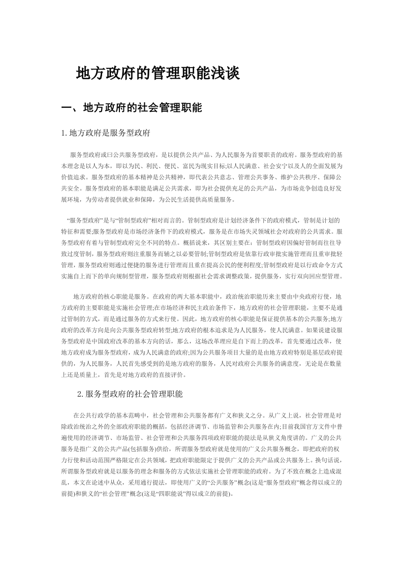 地方政府的管理职能浅谈一、地方政府的社会管理职能1.地方政府是服务型政府服务型政府或曰公共服务型政府,是以提供公共产品、为人民服务为首要职责的政府。服务型政府的基本理念是以人为本,即以为民、利民、便民、富民为现实目标:以人民满意、社会安宁以及人的全面发展为价值追求。服务型政府的基本精神是公共精神,即代表公共意志、管理公共事务、维护公共秩序、保障公共安全。服务型政府的基本职能是满足公共需求,即为社会提供充足的公共产品,为市场竞争创造良好发展环境,为劳动者提供就业和保障,为公民生活提供高质量服务。“服务型政府”是与“管制型政府”相对而言的。管制型政府是计划经济条件下的政府模式,管制是计划的特征和需要:服务型政府是市场经济条件下的政府模式,服务是在市场失灵领域社会对政府的公共需求。服务型政府有着与管制型政府完全不同的特点。概括说来,其区别主要在:管制型政府因偏好管制而往往导致过度管制,服务型政府则注重服务而辅之以必要管制:管制型政府是依靠行政审批实施管理而且重审批轻管理,服务型政府则通过便捷的服务进行管理而且重在提高公民的便利程度:管制型政府是以行政命令方式实施自上而下的单向规制型管理,服务型政府则根据社会需求调整政策,提供服务,实行双向回应型管理。地方政府的核心职能是服务。在政府的两大基本职能中,政治统治职能历来主要由中央政府行使,地方政府的主要职能是实施社会管理:在市场经济和民主政治条件下,地方政府的社会管理职能,主要不是通过管制的方式,而是通过服务的方式来行使。因此,地方政府的核心职能是保证提供基本的公共服务;地方政府的改革方向是向公共服务型政府转型:地方政府的根本追求是为人民服务,使人民满意。如果说建设服务型政府是中国政府改革的基本方向的话,那么,这场改革理应是自下而上的改革,首先要通过改革,使地方政府成为服务型政府,成为人民满意的政府:因为公共服务项目大量的是由地方政府特别是基层政府提供的,为人民服务,人民首先感受到的是地方政府的服务,人民对政府公共服务的满意度,无论是在数量上还是质量上,首先是对地方政府的直接评价。2.服务型政府的社会管理职能在公共行政学的基本范瞒中,社会管理和公共服务都有广义和狭义之分。从广义上说,社会管理是对除政治统治之外的全部政府职能的概括,包括经济调节、市场监管和公共服务在内:目前我国官方文件中普遍使用的经济调节、市场监管、社会管理和公共服务四项政府职能的提法是从狭义角度讲的。广义的公共服务是指广义的公共产品(包括服务)供给,所谓服务型政府就是使用的广义公共服务概念,即把政府的权力行使和活动范围严格限定在公共领域,把政府职能限定于提供广义的公共产品或公共服务上。换句话说,所谓服务型政府就是以服务的理念和服务的方式依法实施社会管理职能的政府。为了不致在概念上造成混乱,本文在论述中从众,采用通行提法,即使用广义的“公共服务”概念(这是“服务型政府”概念得以成立的前提)和狭义的“社会管理”慨念(这是“四职能说”得以成立的前提)。从狭义角度说,现代服务型政府的社会管理职能主要有四项一建立法制基础:投资于公共基础设施:保护社会弱势群体:保护和优化环境。政府的社会管理功能的有效发挥是坚持全面、协调和可持续发展的科学发展观的基本前提。政府作为社会公共组织,其社会管理职能可以说是千头万绪:但最重要和最主要的是上述四项。在依法治国,建设社会主义法治国家的过程中,建立法律和制度基础,无疑是政府的最基本的职责之一。无论是政府依法行政还是社会依法自治,都必须有法可依;法制化的公共政策和公共制度供给水远是第一位的问题:而这是除立法机关和授权的政府组织外,任何社会组织所无法提供的纯公共产品。投资于公共基础设施建设,是优化环境的重要方面,因而是服务型政府的基本责任。如道路交通、水电枢纽、排污防洪、垃圾处理、公园与城市美化等公共基础设施的建设,都是需要政府来投资的。虽然这些设施的消费在一定条件下可能会因部分的排他性而使私人组织也有投资的冲动,从而也可以部分地实现投资主体的多元化,但不能依赖于社会和私人的投资则是肯定的:即使由非政府组织投资,也必须由政府负责规划和界定产权。倾向于保护社会弱势群体和对穷人提供帮助,是世界上所有民主政府的基本特征。以为人民服务为宗台的中国政府更应当将其视之为自己的神圣义务:坚持权为民所用、情为民所系、利为民所谋,为处于社会最底层的普通百姓排忧解难办实事:特别是在社会主义初级阶段和市场经济发有尚不成熟的社会转型期,关注社会弱势群体的生活状态,保护弱势者和贫困者的基本权利不受剥夺和侵害,通过公共政策倾向、司法援助、社会牧济、财政转移支付、社会保障制度以及扶贫开发等多项措施,为社会弱势群体和贫困阶层提供多方面的帮助和救援,从而保持政治稳定和社会公正,实现共同富裕和全面协调发展,是人民政府义不容辞的一项天职。社会全面进步的一个重要标志是人的生活环境的不断改普。因此,政府的一项重要社会管理职能就是保护环境并不断地优化环境。保护环境包