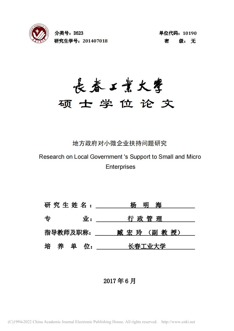 分类号:D523单位代码:10190研究生学号:201407018密级:无硕士学位论文地方政府对小微企业扶持问题研究Research on Local Government 's Support to Small and MicroEnterprises研究生姓名:杨明海专业:行政管理指导教师及职称:臧宏玲(副教授)培养单位:长春工业大学2017年6月(C)1994-2022 China Academic Journal Electronic Publishing House.All rights reserved.http://www.cnki.net长春工业大学研究生学位论文原创性声明本人郑重声明:所呈交的研究生学位论文,《地方政府对小微企业扶持问题研究》是本人在指导教师的指导下,独立进行研究工作所取得的成果。除文中已经注明引用的内容外,本论文不包含任何其他个人或集体已经发表或撰写过的作品成果。对本文的研究做出重要贡献的个人和集体,均已在文中以明确方式标明。本人完全意识到本声明的法律结果由本人承担。作者签名:年月日长春工业大学硕士学位论文版权使用授权书本学位论文作者及指导教师完全了解“长春工业大学研究生学位论文版权使用规定”,同意长春工业大学保留并向国家有关部门或机构送交学位论文的复印件和电子版,允许论文被查阅和借阅。本人授权长春工业大学可以将本学位论文的全部或部分内容编入有关数据库进行检索,也可采用影印、缩印或扫描等复制手段保存和汇编学位论文。作者签名:校内指导教师签名:(C)1994-2022 China Academic Journal Electronic Publishing House.All rights reserved.http://www.cnki.net研究生学位论文摘要小和微相对于巨和大,可能并不那么引人注目,但是在经济发展和社会生活中,小微企业的价值却并不比大型企业更低。小微企业广泛分布于一、二、三产业中有效的填补了大中型企业的空白地带,成为了各个行业中不可缺失的润滑剂。但是小微企业迫于自身的规模和能力限制,如果任其自由发展,其结果往往是发展后劲严重不足,或者是被市场的洪流所淹没。所以政府对于小微企业的扶持则显得尤为重要。因为小微企业自身规模的原因一般只局限在一地发展,所以地方政府的扶持对小微企业的发展具有重大的现实意义。本文通过对欧美发达国家和我国发达地区对小微企业的扶持办法,总结分析在其管辖范围内小微企业能够发展壮大的内在原因。总结起来有三个方面,一是组织机构较为完善,有专门的管理机构和中介组织:二是法制健全,扶持工作有法律保障:三是经济支持,在融资、担保等方面对小微企业更加开放。在公共服务领域,政府对于小微企业的知识产权、市场拓展、技术能力、业务水平等方面的教育培训并没有提供有效的平台。而在融资方面小微企业相对于规模以上企业,因其自身规模和担保体系上的欠缺,其融资渠道相对狭窄,融资成本更高。由于小微企业自身对于人才体系的建立普遍不够完善,其在人才上的短板也直接阻碍了其更好的发展,在这些方面政府并没有采取有效措施进行帮助。这些问题有的是政府在管理过程中出现的,需要政府提升执政水平,加大扶持力度,有的是企业自身存在的问题,政府可以通过行政手段对企业进行帮助和引导。面对地方政府对小微企业扶持过程中出现的问题,地方政府应通过完善法律制度、设立专管机构、建立中介平台、解决融资难题、促进企业管理水平进步,补齐人才短板等方式,促进小微企业发展。地方政府对小微企业的帮助和扶持不仅应该体现在政府给予的短期的政策和福利上,更应表现在和企业长期的互动上,让企业走上健康的发展模式,形成有效的人才培养机制,为企业的长期健康发展提供帮助。关键词:小微企业地方政府政府扶持(C)1994-2022 China Academic Journal Electronic Publishing House.All rights reserved.http://www.cnki.net