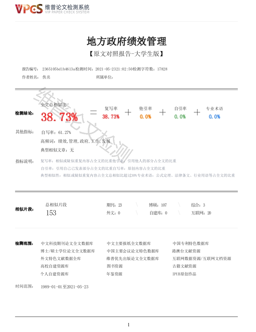 维普论文检测系统VIP PAPER CHECK SYSTEM地方政府绩效管理【原文对照报告-大学生版】报告编号:2365105bd1b4613a检测时间:2021-05-2321:02:50检测字符数:17828作者姓名:佚名所属单位:全文总相似比复写率他引率自引率专业术语检测结论:38.73%38.73%0.0%0.0%0.0%其他指标:自写率:61.27%高频词:绩效,管理,政府,工作,典型相似文章:无指标说明:复写率:相似或疑似重复内容占全文的比重他引率,引用他人的部分占全文的比重自引率:引用自己已发表部分占全文的比重自写率:原创内容占全文的比重典型相似性:相似或疑似重复内容占全文总相似比超过3%专业术语:公式定理、法律条文、行业用语等占全文的比重总相似片段博硕:107相似片段:153外文:0自建库:0互联网:20中文科技期刊论文全文数据库中文主要报纸全文数据库中因专利特色数据库博士/硕士学位论文全文数据库中国主要会议论文特色数据库港澳台文献资源外文特色文献数据全库维普优先出版论文全文数据库互联网数据资源/互联网文档资源高校自建资源库图书资源古籍文献资源个人自建资源库年鉴资源IPUB原创作品时间范围:1989-01-01至2021-05-231VPCS维普论文检测系统VIP PAPER CHECK SYSTEM原文对照颜色标注说明:■自写片段■复写片段(相似或疑似重复)☐引用片段(引用)■专业术语(公式定理、法律条文、行业用语等)地方政府绩效管理问题研究以白山市为例摘要20世纪90年代起,我国开始地方政府试点工作,目的是以绩效为核心,提高政府管理效率,然而,经济的快速发展导致我国社会矛盾剧增,使得多元化主体的利益发生冲突,并且,在深化改革的过程中,我国政府绩效管理在设立目标,管理过程,评估结果和工作反馈等方面暴露问题。所以,在可持续发展战略下,对地方政府绩效管理的研究,具有重要意义。本文以白山市为例,运用文献总结法、综合分析法和标杆对比法,利用理论知识,寻找问题,分析原因,最后提出对策。本文在研究国内外文献的基础上,具体研究了白山市绩效管理的总体情况,从中发现白山市存在的问题,然后结合国内外城市绩效管理的经验,对白山市绩效管理的发展提出改进建议。经研究认为,白山市绩效管理存在的问题主要是管理体系主体多元性不足、绩效文化和理念培养不足和绩效管理综合机制不健全。为此,作者提出改进建议:第一,要突出人民群众的主体地位、健全政府管理人员与领导人员的配置。第二,绩效管理理念要贯穿绩效管理工作全过程,从基层到高层要进行绩效管理理念培养。第三,提高工作透明度,健全政府问责机制,优化绩效管理工作机制。关键词:绩效管理:可持续发展战略:主体多元性:白山市AbstractSincethe1990s,Chinastartedlocalgovernmentpilotworkwiththeaimofimprovingperformanceasthecoreandimprovingtheefficiencyofgovernmentmanagement.However,therapideconomicdevelopmenthasledtoasharpincreaseinsocialcontradictionsinourcountry,whichhasledtotheconflictofinterestsofdiversifiedsubjects.Intheprocessofdeepeningthereform,theperformancemanagementofourgovernmenthasexposedproblemsinsettinggoals,managingprocesses,evaluatingresultsandjobfeedback.Therefore,underthesustainabledevelopmentstrategy,theresearchontheperformancemanagementoflocalgovernmentisofgreatsignificance.TakingGuangdongProvinceasanexample,thispaperusestheliteraturesummarizationmethod,comprehensiveanalysismethod,andbenchmarkcomparisonmethodtousetheoreticalknowledgetofindproblems,analyzecauses,andfinallyproposecountermeasures.Basedontheliteratureathomeandabroad,thisarticlespecificallystudiestheoverallsituationofperformancemanagementinGuangdongProvince,findsproblemsinGuangdongProvince,andthencombinestheexperienceofdomesticandforeigncities'performancemanagementtomakesuggestionsforthedevelopmentofperformancemanagementinGuangdongProvince.Accordingtotheresearch,theproblemsofperformancemanagementinGuangdongProvincearemainlytheinsufficientdiversityofthemainbodyofthemanagementsystem,theinsufficientcultivationofperformancecultureandideas,andtheincompletecomprehensivemechanismofperformancemanagement.Tothisend,suggestionsforimprovementareputforward.First,wemusthighlightthesubjectivestatusofthepeopleandimprovetheallocationofgovernmentmanagersandleaders.Second,theconceptofperformancemanagementmustrunthroughtheentireprocessofperformancemanagement,and2维普论文检测系统VIP PAPER CHECK SYSTEMthetrainingofperformancemanagementconceptsmustbecarriedoutfromthegrassrootstothetop.Third,improveworktransparency,improvegovernmentaccountabilitymechanisms,andoptimizeperformancemanagementmechanisms.Keywords:Performancemanagement:sustainabledevelopmentstrategy:subjectdiversity:GuangdongProvince目录摘要1Abstract21绪论61.1研究背景61.2研究意义61.3国内外研究现状71.3.1国外研究现状71.3.2国内研究现状81.3.3研究述评92地方政府绩效管理的基本理论102.1政府绩效管理的内涵102.1.1绩效管理102.1.2政府绩效102.1.3政府绩效管理112.2地方政府绩效管理的基础是制度建设132.2.1制度的基本内容、特点14检测2.2.2制度在政府绩效管理中的角色142.2.3政府绩效管理制度的基本框架152.3绩效考核的基本方法162.3.1 SSMART考核分析法162.3.2360度社会评价分析法173可持续发展战略下,白山市地方政府绩效管理的具体措施现状183.1白山市政府绩效管理的总体情况183.2白山市政府绩效管理的工作体制193.2.1白山市政府绩效管理工作上的不断改进193.2.2白山市政府绩效管理工作的创新特点194分析白山市政府绩效管理存在的问题214.1主体性与多元性不足214.2绩效文化和理念培养不足214.3绩效管理综合机制不健全215国内外地方政府绩效管理的做法和经