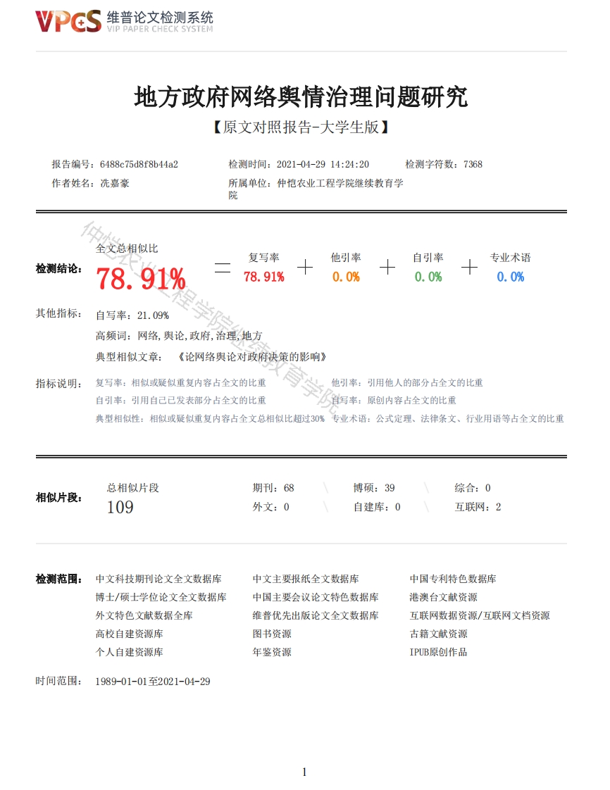 维普论文检测系统VIP PAPER CHECK SYSTEM地方政府网络舆情治理问题研究【原文对照报告-大学生版】报告编号:6488c75d8f8b44a2检测时间:2021-04-2914:24:20检测字符数:7368作者姓名:洗嘉豪所属单位:仲恺农业工程学院继续教育学院全文总相似比复写率他引率自引率专业术语检测结论:78.91%78.91%0.0%0.0%0.0%其他指标:自写率:21.09%高频词:网络,舆论,政府,治理,地方典型相似文章:《论网络奥论对政府决策的影响》指标说明:复写率:相似或疑似重复内容占全文的比重他引率:引用他人的部分占全文的比重自引率:引用自己已发表部分占全文的比重自写率:原创内容占全文的比重典型相似性:相似或疑似重复内容占全文总相似比超过30%专业术语:公式定理、法律条文、行业用语等占全文的比重总相似片段期刊:68博硕:39综合:0相似片段:109外文:0自建库:0互联网:2检测范围:中文科技期刊论文全文数据库中文主要报纸全文数据库中国专利特色数据库博士/硕士学位论文全文数据库中国主要会议论文特色数据库港澳台文献资源外文特色文献数据全库维普优先出版论文全文数据库互联网数据资源/互联网文档资源高校自建资源库图书资源古籍文献资源个人自建资源库年鉴资源IPUB原创作品时间范围:1989-01-01至2021-04-29维普论文检测系统VIP PAPER CHECK SYSTEM原文对照颜色标注说明:■自写片段■复写片段(相似或疑似重复)口引用片段(引用)■专业术语(公式定理、法律条文、行业用语等)仲恺农业工程学院成人高等教育毕业论文论文题目:地方政府网络舆情洽理问题研究姓名:洗嘉豪专业班级:行政管理2019级学号:20195440104005指导教师:华姝姝仲恺农业工程学院继续教育学院制毕业论文承诺书本人承诺:本人已经了解仲恺农业工程学院继续教育学院的毕业论文写作的有关规定;本人的论文是在指导教师指导下独立完成的研究成果。整篇论文除了文中已注明出处或引用的内容外,绝没有侵犯他人知识产权。对本论文所涉及的研究工作做出贡献的个人和集体,均已在文中以明确方式注明。签名:日期:年月日摘要网络民意作为地方网络舆论治理的重要组成部分,对政府管理层有较深刻的影响。地方网络舆论治理是以互联网技术支撑为基础的新形式的舆论,具有便捷,互动,匿名,成本低等特点。使地方网络舆论治理具有传统民意不具备的诸多优点,为公众实现政治参与另辟了蹊径。实际上,舆论对政府管理的影响是“双刃剑”,可以促进科学民主管理,帮助政府科学合理管理。本文通过地方网络舆论治理的界定与特征,对地方网络舆论治理对政府管理的影响进行分析,探讨政府引导地方网络舆论治理的对策。关键词:地方网络舆论治理政府管理影响目录1引言12相关概述12.1地方网络舆论治理的界定12.2地方网络舆论治理的特征12.2.1网络主体的性质12.2.2地方网络舆论治理内容的多样性12.2.3地方网络舆论治理传播的便捷自由性23地方网络舆论治理对政府管理的影响分析22维普论文检测系统VIP PAPER CHECK SYSTEM3.1地方网络舆论治理对政府管理的积极影响23.1.1地方网络舆论治理提高政府管理的科学化23.1.2地方网络舆论治理促进政府管理民主化33.1.3地方网络舆论治理促进政府管理的高效化33.2地方网络舆论治理对政府管理的消极影响33.2.1网民群体不均衡性33.2.2地方网络舆论治理的“群体极化”影响政府管理43.2.3地方网络舆论治理的失真导致政府管理的失误44政府引导地方网络舆论治理的对策思考4.1政府应重视网络监督的作用54.2政府应加快电子政务建设54.3政府应加强网络道德教育引导64.4政府应完善地方网络舆论治理法律法规6结论7参考文献81引言地方网络舆论治理为政府提供了一个新的环境,进一步改善了公民参与的手段和渠道,使公民参与政府管理的广度和深度得到了很大的改善,同时地方网络舆论治理提高政府治理质量,促进政府管理创新。但是,我们也要清醒地认识到,地方网络奥论治理是双方面的,并不完善,还有很多问题,对政府管理也有负面影响。2相关概述2.1地方网络舆论治理的界定从传播的角度来看,传媒有四种形式,首先从古代以来,有纸媒,报纸,期刊等:二是广播媒体,主要是通过无线电传输信息:第三是电视媒体:21世纪前三种媒体传播信息为主要方式,随着互联网技术的兴起,网络媒体逐渐成为第四媒体。网络媒体的出现带来了新媒体时代,大众媒体的地位进一步提高,互联网有了快速的传播,应用范围广泛,涉及范围广泛的特点,已成为公众培训和传播的舆论在主要平台上,在新媒体时代公众可以同时成为信息的受众和传播者。地方网络舆论治理可以解释为“在互联网平台上传播舆论,通过各种网络传播,公众对社会现实的各种现象,问题有一定的影响,有倾向的意见或言论,是一种包含态度,情感,心灵和行为等多层次内涵的概念,是舆论的丰富表达。”2.2地方网络舆论治理的特征2.2.1网络主体的性质主体的匿名性是地方网络舆论治理最重要的特征之一,使用户可以自由,大胆地发表意见,行使发言权。这也是其最重要的功能。由于公民的公民身份尚未建立,网络的主体是匿名的,互联网用户可以利用虚拟身份在网络中进行活动。网络的主体匿名,也为地方网络舆论治理的表达提供了更加宽敞的空间,所以很多真实的想法和建议可以顺利的表达出来。分散性,指网络主体不是的一些机械收集,它们来自社会各个行业