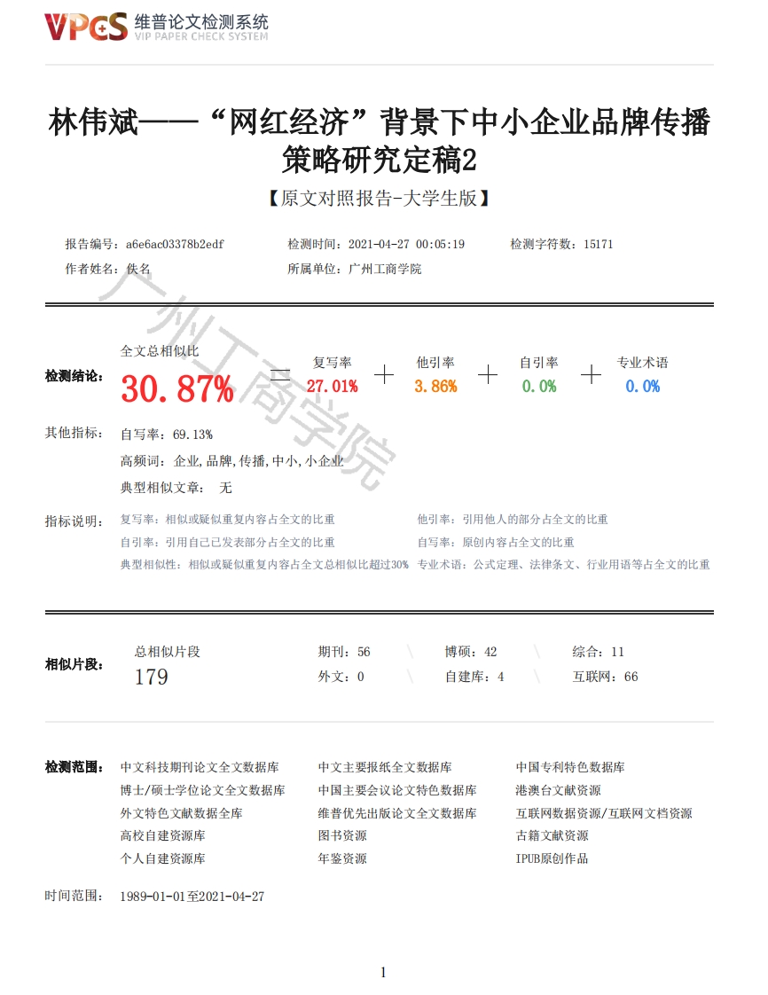 维普论文检测系统VIP PAPER CHECK SYSTEM林伟斌一一“网红经济”背景下中小企业品牌传播策略研究定稿2【原文对照报告-大学生版】报告编号:a6e6ac03378b2edf检测时间:2021-04-2700:05:19检测字符数:15171作者姓名:佚名所属单位:广州工商学院全文总相似比他引率自引率专业术语检测结论:30.87%其他指标:自写率:69.13%复写率27.01%3.86%0.0%0.0%高频词:企业,品牌,传播,中小,小企业典型相似文章:无指标说明:复写率:相似或疑似重复内容占全文的比重他引率:引用他人的部分占全文的比重自引率:引用自己已发表部分占全文的比重自写率:原创内容占全文的比重典型相似性:相似或疑似重复内容占全文总相似比超过30%专业术语:公式定理、法律条文、行业用语等占全文的比重总相似片段期刊:56博硕:42综合:11相似片段:179外文:0自建库:4互联网:66检测范围:中文科技期刊论文全文数据库中文主要报纸全文数据库中国专利特色数据库博士/硕士学位论文全文数据库中国主要会议论文特色数据库港澳台文献资源外文特色文献数据全库维普优先出版论文全文数据库互联网数据资源/互联网文档资源高校自建资源库图书资源古籍文献资源个人自建资源库年鉴资源IPUB原创作品时间范围:1989-01-01至2021-04-27维普论文检测系统VIP PAPER CHECK SYSTEM原文对照颜色标注说明:■自写片段■复写片段(相似或疑似重复)口引用片段(引用)■专业术语(公式定理、法律条文、行业用语等)廣州工商粤院Guangzhou College of Technology and Business本科毕业论文(设计)题目:“网红经济”背景下中小企业品牌传播策略研究院系:工商管理系专业班级:2017级工商管理B8班学生姓名:林伟斌学号:201723410836指导教师:杨学富完成日期:2021年5月20日广州工商学院学位论文写作声明和使用授权说明学位论文写作声明本人郑重声明:所呈交的学位论文,是本人在导师的指导下,独立进行研究工作所取得的成果。除文中已经注明引用的内容外,本论文不含任何其他个人或集体已经发表或撰写过的作品或成果。对本文的研究做出重要贡献的个人和集体,均已在文中以明确方式标明。本声明的法律结果由本人承担。论文作者签名:日期:年月日学位论文使用授权说明本人完全了解广州工商学院关于收集、保存、使用学位论文的规定,即:按照学校要求提交学位论文的印刷本和电子版本:学校有权保存学位论文的印刷本和电子版,并提供目录检索与阅览服务:学校可以采用影印、缩印、数字化或其它复制手段保存论文:在不以赢利为目的的前提下,学校可以将学位论文编入有关数据库,提供网上服务。(保密论文在解密后遵守此规定)论文作者签名:导师签名:日期:年月日“网红经济”背景下中小企业品牌传播策略研究内容摘要2维普论文检测系统VIP PAPER CHECK SYSTEM作为我国国民经济发展的重要组成部分,中小企业在我国经济社会发展中发挥着至关重要的作用。同时,中小企业也被公认为富民企业和民本企业。面对日益激烈的市场竞争环境,各地方政府纷纷出台相关政策扶持中小企业发展,为中小企业的发展提供了良好的外部环境。与此同时,许多中小企业也在不断探索使企业发展壮大的途径,而树立知名企业品牌成为大多数中小企业家的首选。在自媒体时代下,“网红市场”和“网红经济”已经形成了明确分工和完善的产业链,在电商和网络消费的借助下,通过各种方式实现了流量变现,创造出了惊人的经济价值。中小企业如何通过“网红经济”模式进行企业品牌传播推广,提升企业的品牌知名度也成了许多企业家们思考的问题。本文阐述了网络媒体的特性以及当下的中小企业品牌传播困境,通过对我国“网红经济”市场规模以及网民的消费方式,提出了利用网络媒体进行中小企业品牌传播的必要性,并通过综合分析,提出了如何完善中小企业品牌传播策略的建议。关键词:网红经济:中小企业;品牌传播:Research on the Brand Communication Strategy of Small and Medium-sized Enterprises under theBackground of "Internet Celebrity Economy"AbstractAs an important part of my country's national economic development,small and medium-sizedenterprises have played a vital role in my country's economic and social development.At the sametime,small and medium-sized enterprises have been recognized by the society as rich people-orientedenterprises and people-oriented enterprises.In the face of increasingly fierce competition in themarket environment,local governments have successively introduced relevant policies to support thedevelopment of small and medium-sized enterprises,providing a good external environment for thedevelopment of small and medium-sized enterprises,At the same time,many small and medium-sizedenterprises are constantly exploring ways to develop and grow their enterprises,and theestablishment of a well-known corporate brand has become the first choice for most small and medium-sized enterprises.In the era of self-media,the "Internet celebrity market"and "Internet celebrity economy"haveformed an industrial chain with a clear division of labor.With the help of e-commerce and onlineconsumption,traffic has been monetized in various ways,creating an amazing Economic value.Howsmall and medium-sized enterprises can use the "net celebrity economy"model to promote theircorporate brands and enhance their brand awareness has become a question that many entrepreneursthink about.This article explains the characteristics of online media and the current SME brandcommunication dilemma.Through the market scale of my country's "Internet celeb