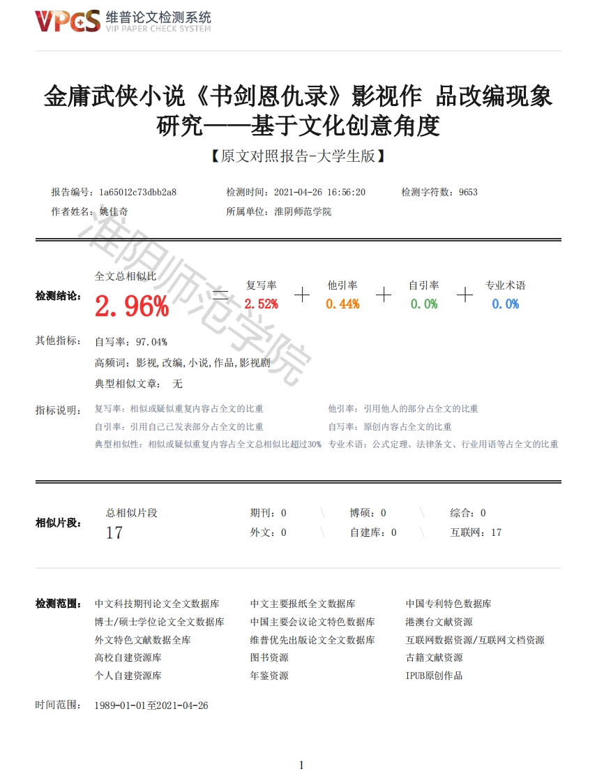 维普论文检测系统/IP PAPER CHECK SYSTEM金庸武侠小说《书剑恩仇录》影视作品改编现象研究一一基于文化创意角度【原文对照报告-大学生版】报告编号:1a65012c73dbb2a8检测时间:2021-04-2616:56:20检测字符数:9653作者姓名:姚佳奇所属单位:淮阴师范学院全文总相似比检测结论:2.96%其他指标:自写率:97.04%复写率他引率自引率专业术语.52%0.44%0.0%0.0%高频词:影视,改编,小说,作品,影视剧典型相似文章:无指标说明:复写率:相似或疑似重复内容占全文的比重他引率:引用他人的部分占全文的比重自引率:引用自己已发表部分占全文的比重自写率:原创内容占全文的比重典型相似性:相似或疑似重复内容占全文总相似比超过30%专业术语:公式定理、法律条文、行业用语等占全文的比重总相似片段期刊:0博硕:0综合:0相似片段:17外文:0自建库:0互联网:17检测范围:中文科技期刊论文全文数据库中文主要报纸全文数据库中国专利特色数据库博士/硕士学位论文全文数据库中国主要会议论文特色数据库港澳台文献资源外文特色文献数据全库维普优先出版论文全文数据库互联网数据资源/互联网文档资源高校自建资源库图书资源古籍文献资源个人自建资源库年鉴资源IPUB原创作品时间范围:1989-01-01至2021-04-26维普论文检测系统VIP PAPER CHECK SYSTEM原文对照颜色标注说明:■自写片段■复写片段(相似或疑似重复)引用片段(引用)■专业术语(公式定理、法律条文、行业用语等)毕业论文学生姓名姚佳奇学号0112170046院属文学院专业汉语言文学班级1704题目金庸武侠小说《书剑恩仇录》影视作品改编现象研究一一基于文化创意角度指导老师陈年高职称副教授2021年4毕业论文独创性声明本人郑重声明:本论文是我个人在导师指导下进行的研究工作及取得的研究成果。本论文除引文外所有实验、数据和有关材料均是真实的。尽我所知,除了文中特别加以标注和致谢的地方外,论文中不包含其他人已经发表或撰写过的研究成果。作者签名:日期:2维普论文检测系统VIP PAPER CHECK SYSTEM摘要:本文从文化创意的角度出发,研究把握影视作品改编中的创新与创意。针对金庸先生的作品《书剑恩仇录》,分析目前影视剧改编作品中的差异,比较改编作品与原著中的差异与现代化的表现,得出改编创意的范式,研究挖掘改编创意的过程与文化产业之间的交流联系与发展,促进文化创意产业的发展,延长作品的生命周期。关键词:书剑恩仇录,影视,改编,创意Abstract:From the perspective of Cultural Creativity,this paper studies the Innovation andcreativity in the adaptation of film and Television Works.In the light of Mr.Jin Yong's work TheBook and the Sword,this paper analyzes the differences in the adapted works of films and TV series,compares the differences between the adapted works and the original works and the performance ofmodernization,and obtains the paradigm of the adapted creativity,this paper studies thecommunication and development between the creative process of adaptation and the Cultural Industry,promotes the development of the cultural creative industry and prolongs the life cycle of the filmand TV play.Keywords:The Book and the Sword,film,adaptation,creativity目录(二)人物塑造上的变动……………6三、影响影视剧的因素…………9(二)影视改编理论与实践……10四、借鉴意义…10参考文献…2一、引言《书剑恩仇录》的改编性首先在于贴合历史,其次小说结构分明,三大势力构成故事整体,第三情节跌宕起伏,围绕解救文泰来与反清复明展开,第四人物形象丰满,心理刻画独具匠心。小说也具有典型意义,陈家洛在面临国家大事时内心的挣扎实际上是个人与家国之间选择的缩影,金庸塑造了这样一个形象引起大家思考。当一部作品想传递给受众某种想法与思考,引起共鸣时它也就有了改编的必要性与价值。《书剑恩仇录》作为开篇之作,翻拍的影视作品也颇受大众喜爱。翻看期刊网,超星图书等文献后可以发现,研究金庸武侠小说的文章有很多,如《天龙八部》对莎士比亚戏剧的借鉴与化用,金庸武侠小说对我国古典小说元素的传承与创新,但是对金庸武侠小说改编成的影视剧的研究较少。对于金庸武侠小说的电影改编研究的文章主要分为两类,一类是分析金庸武侠小说改编成电影的可能性与意义,如张玉霞先生与王瑞光先生指出,金庸小说改编成电影的可能性在“武侠小说具有特定的价值”“金庸的武侠小说具有广泛的读者群和品牌效应”,“意义在于能够满足大众的审美”“弘扬民族文化”[1](p44)。同样王文参先生认为小说改编为电影能够“弘扬民族文化,开拓全球化背景下的公众精神空间,重建现代人文传统,促进影视艺术长足发展”[2](如13)。这两篇著作虽然很好的说明了金庸武侠小说所具有的当代意义,但是文章并没有结合具体的作品来谈论相关改编带来的影响与特色,也没有提出影响改编的因素有哪些以及采取哪些措施能够更好的对武侠小说进行再造。第二类是分析研究金庸武侠小说改编影视剧中的艺术魅力,如周凤教授认为影视剧中的武打描写通过镜头动作与蒙太奇的剪辑手法而获得更好的艺术展现,但是文章仅限于武打动作的研究,缺少对于人物形象和故事情节的把握,没有比较分析各版本的差异和影响影视改编的因素。因此本文将以出版时间顺序为对由王天林执导,郑少秋领衔主演的1976年版的《书剑恩仇录》:李添胜监制,由香港电视广播有限公司拍摄制作