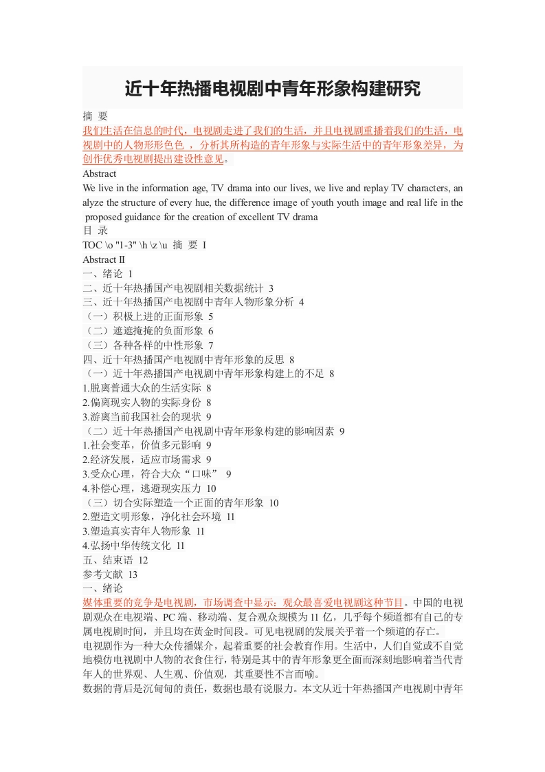 近十年热播电视剧中青年形象构建研究摘要我们生活在信息的时代,电视剧走进了我们的生活,并且电视剧重播着我们的生活,电视剧中的人物形形色色,分析其所构造的青年形象与实际生活中的青年形象差异,为创作优秀电视剧提出建设性意见。AbstractWe live in the information age,TV drama into our lives,we live and replay TV characters,analyze the structure of every hue,the difference image of youth youth image and real life in theproposed guidance for the creation of excellent TV drama目录TOCo"I-3"hzu摘要IAbstractⅡ一、绪论1二、近十年热播国产电视剧相关数据统计3三、近十年热播国产电视剧中青年人物形象分析4(一)积极上进的正面形象5(二)遮遮掩掩的负面形象6(三)各种各样的中性形象7四、近十年热播国产电视刷中青年形象的反思8(一)近十年热播国产电视剧中青年形象构建上的不足81.脱离普通大众的生活实际82.偏离现实人物的实际身份83.游离当前我国社会的现状9(二)近十年热播国产电视剧中青年形象构建的影响因素91.社会变革,价值多元影响92.经济发展,适应市场需求93.受众心理,符合大众“口味”94.补偿心理,逃避现实压力10(三)切合实际塑造一个正面的青年形象102.塑造文明形象,净化社会环境113.塑造真实青年人物形象114.弘扬中华传统文化11五、结束语12参考文献13一、绪论媒体重要的竞争是电视剧,市场调查中显示:观众最喜爱电视剧这种节目。中国的电视剧观众在电视端、PC端、移动端、复合观众规模为1】亿,几乎每个频道都有自己的专属电视剧时间,并且均在黄金时间段。可见电视剧的发展关乎着一个频道的存亡。电视剧作为一种大众传播媒介,起着重要的社会教育作用。生活中,人们自觉或不自觉地模仿电视剧中人物的衣食住行,特别是其中的青年形象更全面而深刻地影响着当代青年人的世界观、人生观、价值观,其重要性不言而喻。数据的背后是沉甸甸的责任,数据也最有说服力。本文从近十年热播国产电视剧中青年形象构建分析入手,查找存在问题,提出意见建议。人物形象作为电视剧的灵魂,是电视剧为反映社会现实、阐释价值观念、传播生活理念、引导社会风尚而塑造的典型。现实中越来越多国产电视剧惨遭批判,特别是其中的青年形象饱受诟病。为了促进国产电视剧的发展,引导传播积极向上的青年形象,本文通过对近十年来有代表性的电视剧青年形象构建进行分析研究,总结青年形象构建的影响因素,为如何改进提供一定的意见及建议。电视剧作为当前普通大众的主要娱乐休闲方式,丰富着我们的生活,同时也在演绎着我们现实生活中的点点滴滴首先,电视剧是一定社会生活的反映和表达。人物形象是电视剧的灵魂与核心。研究热播电视剧中青年形象的构建,有助于强化电视剧发挥其教育引导作用,在宣扬社会主义核心价值观、营造良好社会风气上作用重大。其次,电视剧中的人物形象带给大众内心的满足,青少年极易将自己带入到所喜爱的人物中去,或者将自己与电视剧中的人物进行对比,甚至将虚拟的人物当成自己话语权的输出者,对自己实际形象的表达。同样,如果一些负面的、不切实际的人物形象被塑造、传播,如“拜金”、“酗酒”、“富二代”等负面形象,给社会带来的影响也是巨大的。所以积极向上、符合实际的青年形象应该是电视剧必需塑造的形象。第三,“内容为王”在电视剧领域同样具有重要意义。接近生活实际、贴近社会需要、真实饱满的人物形象,也有助于电视剧本身的传播,对于提高收视率,增加竞争力有重要作用。本文以近十年热播电视剧中的青年形象构建为研究对象,采取理论与文本相结合的方法,在汲取前人研究的基础上,收集近十年热播电视剧进行文本分析,分析其所构造的青年形象与实际中青年形象的差异,为创作优秀国产电视剧提出建设性意见。青年时祖国的花朵,社会各界对于青年的定义也不尽相同。在我们眼里青年就是朝气蓬勃年轻的象征。二、近十年热播国产电视剧相关数据统计1.热播电视剧(一)中国电视剧的发展历程(TV play;teleplay;TV drama;TV serial;:)一种专为在电视或互联网上播的演剧形式。所谓什么是热播电视剧,就是受人们喜爱,多次播放的就是热播。1958年6月15日,北京电视台(中央电视台前身)以直播形式播出了电视剧《一口菜饼子》,这标志着中国电视剧的诞生。迄今中国电视剧已经走过了半个世纪的历程。其间,在历史发展的纵向纬度,按照电视剧艺术形式在社会系统中功能角色定位及其艺术自觉与生产规模,大致可以划分为三个发展阶段:一,宣传工具阶段(1958年一1977年):二,审美自觉阶段(1978年一1989年):三,文化产业阶段(1990年至今)。在电视剧艺术系统的横向纬度,按照电视剧艺术的类型发展实际,中国电视剧又可以分为革命历史题材剧、古装戏(历史题材电视剧)、农村题材剧、军事题材剧、城市社会生活剧(家庭伦理剧)、都市言情与青春浪漫剧、情境喜剧等类型。随着时代的变迁,多元文化的影响,人们的精神生活变得越来越丰富多彩,电视剧的类型也越来越奇异瑰丽。(二)近十年热播国产电视剧初步统计近十年的热播电视剧很多,根据央视和各地方卫视的播出收视率统计、网络搜索热度和广大网友的关注程度,列出比较有代表性的部分电视剧。这些作品产生的影响广泛而深刻,但其效果却喜忧参半。2008年,《丑女无敌》《闯关