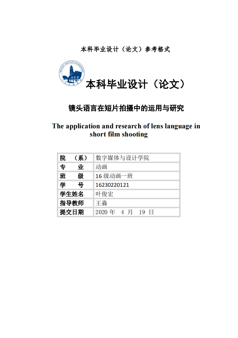 本科毕业设计(论文)参考格式本科毕业设计(论文)镜头语言在短片拍摄中的运用与研究The application and research of lens language inshort film shooting院(系)数字媒体与设计学院专业动画班级16级动画一班学号16230220121学生姓名叶俊宏指导教师王淼提交日期2020年4月19日毕业设计(论文)原创性声明本人郑重声明:所呈交的毕业设计(论文),是本人在指导老师的指导下,独立进行的设计(研究)工作及取得的成果,论文中引用他人的文献、数据、图件、资料均已明确标注出,论文中的结论和结果为本人独立完成,不包含他人已经发表或撰写的作品及成果。对本文的研究作出贡献的个人和集体,均已在论文中作了明确的说明。本人完全意识到本声明的法律结果由本人承担。毕业论文作者(签字):叶俊宏签字日期:2020年4月10日指导教师评分:评阅教师评分:答辩小组评分:总评成绩:系主任签字(盖章):年月