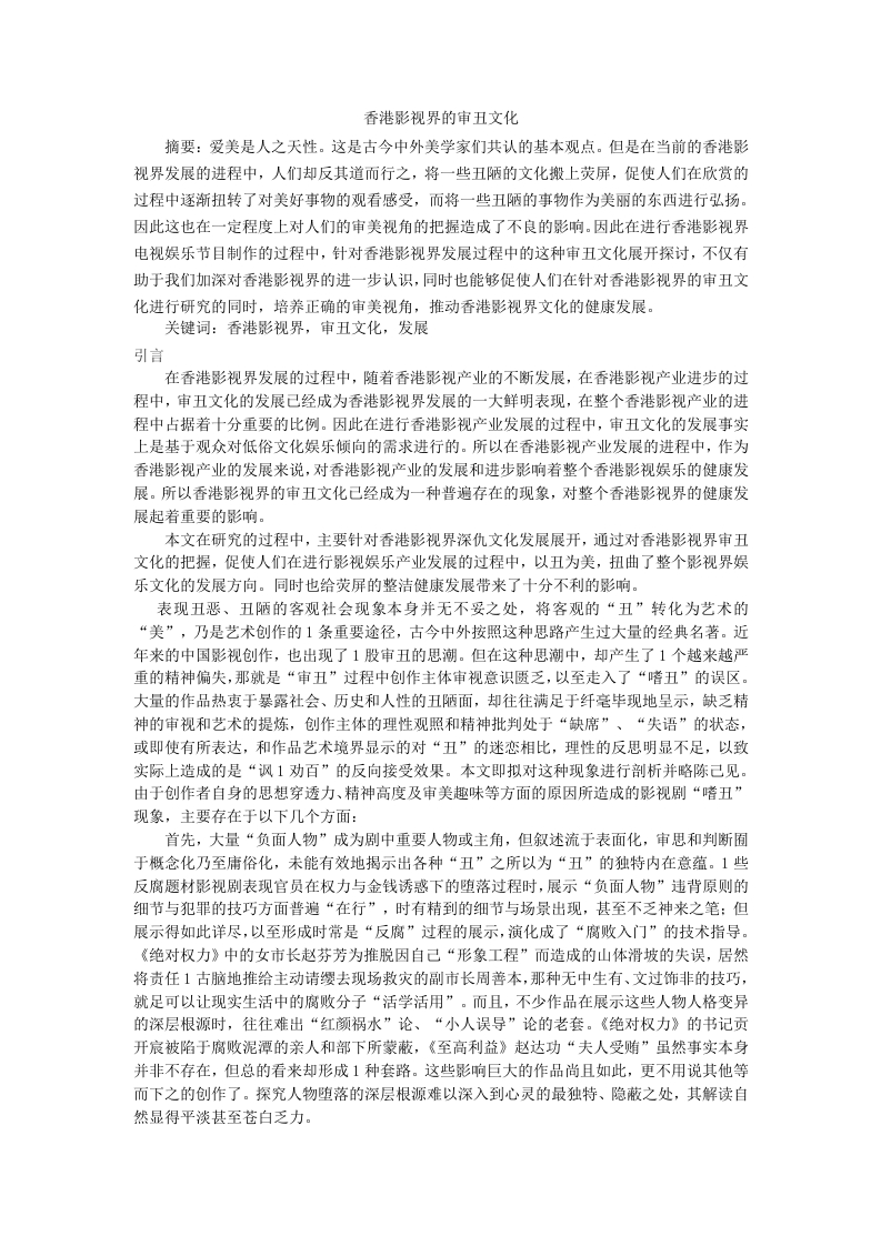 香港影视界的审丑文化摘要:爱美是人之天性。这是古今中外美学家们共认的基本观点。但是在当前的香港影视界发展的进程中,人们却反其道而行之,将一些丑陋的文化般上荧屏,促使人们在欣赏的过程中逐渐扭转了对美好事物的观看感受,而将一些丑陋的事物作为美丽的东西进行弘扬。因此这也在一定程度上对人们的审美视角的把握造成了不良的影响。因此在进行香港影视界电视娱乐节目制作的过程中,针对香港影视界发展过程中的这种审丑文化展开探讨,不仅有助于我们加深对香港影视界的进一步认识,同时也能够促使人们在针对香港影视界的审丑文化进行研究的同时,培养正确的审美视角,推动香港影视界文化的健康发展。关键词:香港影视界,审丑文化,发展引言在香港影视界发展的过程中,随着香港影视产业的不新发展,在香港影视产业进步的过程中,审丑文化的发展己经成为香港影视界发展的一大鲜明表现,在整个香港影视产业的进程中占据着十分重要的比例。因此在进行香港影视产业发展的过程中,审丑文化的发展事实上是基于观众对低俗文化娱乐倾向的需求进行的。所以在香港影视产业发展的进程中,作为香港影视产业的发展来说,对香港影视产业的发展和进步影向着整个香港影视娱乐的健康发展。所以香港影视界的审丑文化已经成为一种普遍存在的现象,对整个香港影视界的健康发展起着重要的影响。本文在研究的过程中,主要针对香港影视界深仇文化发展展开,通过对香港影视界审丑文化的把握,促使人们在进行影视娱乐产业发展的过程中,以丑为美,扭曲了整个影视界娱乐文化的发展方向。同时也给荧屏的整洁健康发展带来了十分不利的影向。表现丑恶、丑陋的客观社会现象本身并无不妥之处,将客观的“丑”转化为艺术的“美”,乃是艺术创作的1条重要途径,古今中外按照这种思路产生过大量的经典名著。近年来的中国影视创作,也出现了1股审丑的思潮。但在这种思潮中,却产生了1个越来越严重的精神偏失,那就是“审丑”过程中创作主体审视意识匮乏,以至走入了“嗜丑”的误区。大量的作品热衷于暴露社会、历史和人性的丑陋面,却往往满足于纤毫毕现地呈示,缺乏精神的审视和艺术的提炼,创作主体的理性观照和精神批判处于“缺席”、“失语”的状态,或即使有所表达,和作品艺术境界显示的对“丑”的迷恋相比,理性的反思明显不足,以致实际上造成的是“讽1劝百”的反向接受效果。本文即拟对这种现象进行剖析并略陈己见。由于创作者自身的思想穿透力、精神高度及审美趣味等方面的原因所造成的影视剧“嗜丑”现象,主要存在于以下几个方面:首先,大量“负面人物”成为剧中重要人物或主角,但叙述流于表面化,审思和判断囿于概念化乃至庸俗化,未能有效地揭示出各种“丑”之所以为“丑”的独特内在意蕴。1些反腐题材影视剧表现官员在权力与金钱诱惑下的堕落过程时,展示“负面人物”违背原则的细节与犯罪的技巧方面普遍“在行”,时有精到的细节与场景出现,甚至不乏神来之笔:但展示得如此详尽,以至形成时常是“反腐”过程的展示,演化成了“腐败入门”的技术指导。《绝对权力》中的女市长赵芬芳为推脱因自己“形象工程”而造成的山体滑坡的失误,居然将责任1古脑地推给主动请缨去现场救灾的副市长周善本,那种无中生有、文过饰非的技巧,就足可以让现实生活中的腐败分子“活学活用”。而且,不少作品在展示这些人物人格变异的深层根源时,往往难出“红颜祸水”论、“小人误导”论的老套。《绝对权力》的书记贡开宸被陷于腐败泥潭的亲人和部下所蒙蔽,《至高利益》赵达功“夫人受贿”虽然事实本身并非不存在,但总的看来却形成1种套路。这些影响巨大的作品尚且如此,更不用说其他等而下之的创作了。探究人物堕落的深层根源难以深入到心灵的最独特、隐蔽之处,其解读自然显得平淡甚至苍白乏力。而在表现“负面人物”悔过自新的内在逻辑方面,不少作品也常常只是借助于1些概念化、神秘化的东西,如遥远的记忆、傻子式的人物、无实际性内容的宗教等等,剖析实在难以使人真正信服。贺岁片《手机》直击当前“包2奶”的丑恶现象,并力图揭示其社会根源。但最后唤起主人公严守1良心悔悟的,是其没有什么文化的老奶奶。老奶奶撒手尘寰时严守1回到乡村,就极其轻易地将惹事生非的手机扔进了化灵的火堆中。似乎造成婚外恋的罪魁祸首不过是现代科技产品“手机”,远离它就能够使现代人重返理想的“古道人心”。这是多么苍白而荒谬的解决方案!因为创作主体审思的力度明显不足,作品就表现出思想深度不够的缺陷。“负面人物”的阴暗心理与丑陋行动就凌驾于主题之上,批判性主题因素在作品情节内涵中难以坐实和显露,结果构成了1种独特的反面意义大于正面意义的“形象大于思想”。而且,不少的影视剧往往都是“负面人物”生气灌注、栩栩如生,戏分多而生动,同“负面人物”抗衡的“正面人物”却戏分少而生硬,简单化、平面化,常有充当“时代精神传声筒”的脸谱化之嫌。我们可以对比1下《天下无贼》中的胡黎(众称“黎叔”)与“人民警察”的形象。“贼头”胡黎显得颇有领导风范与组织才能,“工作经验”丰富,何时“打猎”(出手行窃)、何时“收工”都胸有成竹: