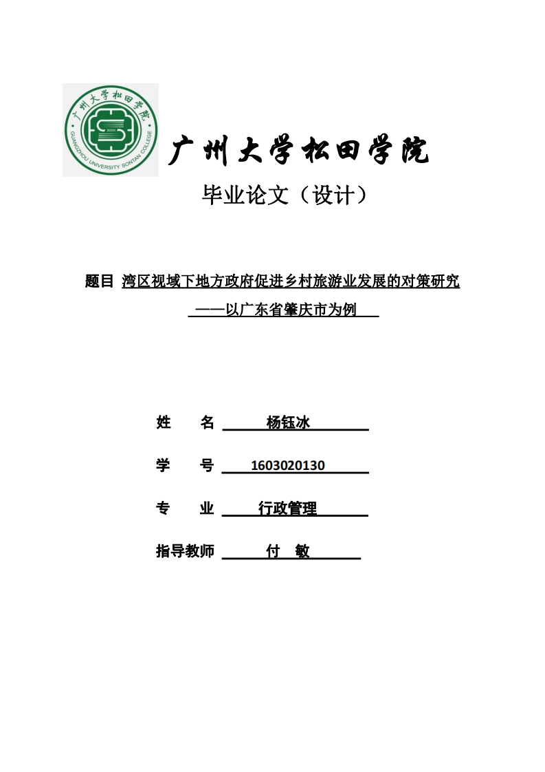 COLLEGE广州大学松田学院毕业论文(设计)题目湾区视域下地方政府促进乡村旅游业发展的对策研究一一以广东省肇庆市为例姓名杨钰冰学号1603020130专业行政管理指导教师付敏毕业论文原创性声明本人郑重声明:所呈交的毕业论文是本人在导师的指导下独立进行研究所取得的研究成果。除了文中特别加以标注引用的内容外,本毕业论文不包括任何其他个人或集体已经发表或撰写的成果作品。本人完全意识到本声明的法律后果由本人承担。作者签名:20年月日毕业论文版权使用授权书本毕业论文作者完全了解学校有关保障、使用毕业论文的规定,同意学校保留并向有关毕业论文管理部门或机构送交毕业论文的复印件和电子版,允许毕业论文被查阅和借阅。本人授权优秀毕业论文评选机构将本毕业论文的全部或部分内容编入有关数据进行检索,可以采用影印、缩印或扫描等复制手段保存和汇编本毕业论文。本毕业论文属于1.保密口,在10年解密后适用本授权书2.不保密口。(请在以上相应方框内打“√”)作者签名:20年月日导师签名:20年月日湾区视域下地方政府促进乡村旅游业发展的对策研究一以广东省肇庆市为例摘要:随着经济的快速发展,粤港澳大湾区的建设被上升为国家战略,标志着我国大湾区时代的来临。根据中华人民共和国文化与旅游部、农业农村部等数据显示,我国近几年的乡村旅游游客人数逐年上升,营业收入可观,人们对乡村旅游的关注度越来越高。乡村旅游有着拉动经济发展、带动社会就业的作用,它的发展顺应乡村振兴战略,助力脱贫攻坚战。湾区建设给湾区内的城市旅游发展带来新的发展机会和挑战。本文着眼于湾区视域下地方政府促进乡村旅游业发展的对策研究,以广东省肇庆市为例,采用文献研究法、实地观察法、个案分析法等方法,分析肇庆市乡村旅游业目前在湾区时代下发展的问题,如乡村旅游资源有待升级整合、旅游产品类型单一、人才队伍建设乏力等问题。虽然在各项文件中可以看出肇庆市政府重视乡村旅游的发展,但由于旅游发展定位不能统一明确、人才培养机制不健全、管理水平低等原因,使得乡村旅游业的发展难以向前。基于上述现状,本文提出了政府要发挥核心作用引领发展、建立健全人才培养机制、整合乡村旅游资源获得最优发展等对策。关键词:粤港澳大湾区:地方政府:乡村旅游:发展对策:肇庆市
