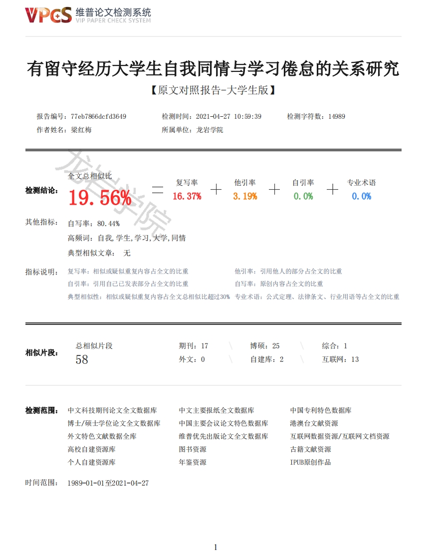 维普论文检测系统/IP PAPER CHECK SYSTEM有留守经历大学生自我同情与学习倦怠的关系研究【原文对照报告-大学生版】报告编号:77eb7866dcfd3649检测时间:2021-04-2710:59:39检测字符数:14989作者姓名:梁红梅所属单位:龙岩学院全文总相似比复写率他引率自引率专业术语检测结论:19.56%16.37%3.19%0.0%0.0%其他指标:自写率:80.44%高频词:自我学生,学习,大学,同情典型相似文章:无指标说明:复写率:相似或疑似重复内容占全文的比重他引率:引用他人的部分占全文的比重自引率:引用自己已发表部分占全文的比重自写率:原创内容占全文的比重典型相似性:相似或疑似重复内容占全文总相似比超过30%专业术语:公式定理、法律条文、行业用语等占全文的比重总相似片段期刊:17博硕:25综合:1相似片段:58外文:0自建库:2互联网:13检测范围:中文科技期刊论文全文数据库中文主要报纸全文数据库中国专利特色数据库博士/硕士学位论文全文数据库中国主要会议论文特色数据库港澳台文献资源外文特色文献数据全库维普优先出版论文全文数据库互联网数据资源/互联网文档资源高校自建资源库图书资源古籍文献资源个人自建资源库年鉴资源IPUB原创作品时间范围:1989-01-01至2021-04-27维普论文检测系统VIP PAPER CHECK SYSTEM原文对照颜色标注说明:■自写片段■复写片段(相似或疑似重复)口引用片段(引用)■专业术语(公式定理、法律条文、行业用语等)岩学院龙岩学院本科生毕业论文(设计)有留守经历大学生、学习倦怠与自我同情的关系研究学院师范教育学院专业心理学姓名梁红梅学号2017111132指导老师赖运成职称年月龙岩学院师范教育学院本科毕业论文(设计)作者承诺保证书本人郑重承诺:本篇毕业论文(设计)的内容真实、可靠。如果存在弄虚作假、抄袭的情况,本人愿承担全部责任。签名:年月日龙岩学院师范教育学院本科毕业论文(设计)指导教师承诺保证书本人郑重承诺:我已按有关规定对本篇毕业论文(设计)的选题与内容进行了指导和审核,坚持一人一题制,确认由作者独立完成。如果存在学风问题,本人愿承担指导教师的相关责任。签名:2维普论文检测系统VIP PAPER CHECK SYSTEM年月◇有留守经历大学生、自我同情与学习倦怠的关系研究师范教育学院心理学2017111132梁红梅指导教师赖运成【摘要】:对福建、贵州两省306名大学生进行了网上问卷调查。采用独立样本t检验、单因素方差分析、相关分析和回归分析。目的了解留守大学生自我同情与学习倦怠的现状,分析二者之间的关系。结果表明:在性别、年级等方面无显著性差异,但在独生子女与否方面有显著性差异;留守大学生的学习倦怠存在显著差异;有留守经历的大学生自我同情与学习倦怠呈显著正相关。自我同情对有留守经历大学生的学习倦怠倾向有正向预测作用。【关键词】有留守经历大学生:学习倦怠:自我同情A study on the relationship among college students with left-behind experience,self-compassionand learning burnoutCollege of Normal Education Psychology2017111132 Liang Hongmei Instructor Lai Yuncheng[Abstrac]Using online questionnaire survey method to test 306 college students in Fujian andGuizhou provinces,using independent sample test,one-way analysis of variance,correlationanalysis,regression analysis.Tounderstand the self compassion and study impatience of college student with left behindexperience,and analyze the relationship between them.The results showed that there is nosignificant difference in self-compassion among college students with left-behind experiencein termsof gender,grade.etc,but there is a significant difference in whether they are the only child.Thereare significant differences in the learning status of college students with left-behind experience.There is a significant positive correlation between self-compassion and learning impatienceamong college students with left-behind experience.The score of self-compassion can positivelypredict the tendency of learning impatience among college students.[Key words college students with left-behind experience:learning burnout:self-compassion1引言在中国社会、经济发展的进程中,大量家在农村或镇的父母离开年幼的孩子到家乡之外的地方谋求经济收入,留守注定是这个时代不可忽视的一种现象,曾经留守的儿童一些长大成人进入大学,在大学里他们的思想,行动都会引起各界的关注,尤其在心理健康这一方面,以留守大学生为对象展开各种研究,前人研究了关于有留守经历大学生心理健康,主观幸福感,情绪控制,社会适应、自我控制等方面的内容,此次研究主要关于留守大学生的学习倦怠与自我同情间的关系。有留守经历大学生因为童年或中学时缺乏父母的陪伴与亲身教导,探讨留守经历造成的影响在自我同情和学习倦怠中是否会显示出与普通大学生的差异,在前人研究大学生学习倦怠的基础上增加留守大学生的自我同情的研究。且目前国内对于这三者的研究较少,值得深入拓展,找到留守经历大学生与无留守经历大学生间自我同情的差异以及原因,学习倦怠与自我同情的关系,帮助大学生心理健康的发展和学习生活,以便帮助他们更好地适应社会。1.1自我同情1.1.1自我同情的概念2003年,心理学家Nff将自我同情定义为“一种积极的情绪调节策略和情绪唤起状态,使个体以开放、宽容的态度去理解和接受自己,客观、冷静地对待自己的处境,把自己的痛苦和消极情绪当作全人类的共同经历,认识到每个人都值得同情”[3]。从现有文献来看,这