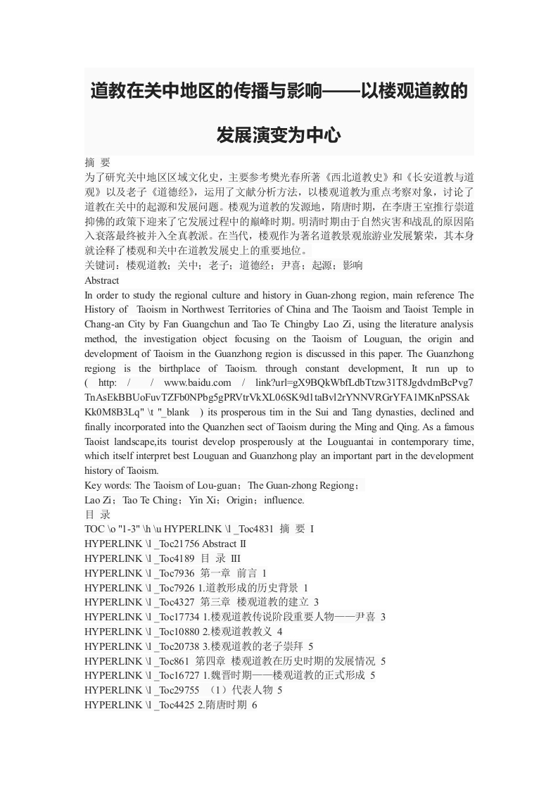 道教在关中地区的传播与影响以楼观道教的发展演变为中心摘要为了研究关中地区区域文化史,主要参考樊光春所著《西北道教史》和《长安道教与道观》以及老子《道德经》,运用了文献分析方法,以楼观道教为重点考察对象,讨论了道教在关中的起源和发展问题。楼观为道教的发源地,隋唐时期,在李唐王室推行崇道抑佛的政策下迎来了它发展过程中的巅峰时期。明清时期由于自然灾害和战乱的原因陷入衰落最终被并入全真教派。在当代,楼观作为著名道教景观旅游业发展繁荣,其本身就诠释了楼观和关中在道教发展史上的重要地位。关键词:楼观道教:关中:老子:道德经:尹喜:起源:影响AbstractIn order to study the regional culture and history in Guan-zhong region,main reference TheHistory of Taoism in Northwest Territories of China and The Taoism and Taoist Temple inChang-an City by Fan Guangchun and Tao Te Chingby Lao Zi,using the literature analysismethod,the investigation object focusing on the Taoism of Louguan,the origin anddevelopment of Taoism in the Guanzhong region is discussed in this paper.The Guanzhongregiong is the birthplace of Taoism.through constant development,It run up tohttp://www.baidu.com link?url=gX9BQkWbfLdbTtzw31T8JgdvdmBcPvg7KkoM8B3Lq"\t "blank its prosperous tim in the Sui and Tang dynasties,declined andfinally incorporated into the Quanzhen sect of Taoism during the Ming and Qing.As a famousTaoist landscape,its tourist develop prosperously at the Louguantai in contemporary time,which itself interpret best Louguan and Guanzhong play an important part in the developmenthistory of Taoism.Key words:The Taoism of Lou-guan:The Guan-zhong Regiong:Lao☑;Tao Te Ching;Yin Xi;Origin;influence..目录TOCo"I-3"h \u HYPERLINK1Toc4831摘要IHYPERLINK \I Toc21756 Abstract IIHYPERLINK1Toc4189目录IHYPERLINK1Toc7936第一章前言1HYPERLINK1Toc79261.道教形成的历史背景1HYPERLINK1Toc4327第三章楼观道教的建立3HYPERLINK1Tocl77341.楼观道教传说阶段重要人物一一尹喜3HYPERLINK1TocI08802.楼观道教教义4HYPERLINK1Toc207383.楼观道教的老子崇拜5HYPERLINK1Toc861第四章楼观道教在历史时期的发展情况5HYPERLINK1Tocl67271.魏晋时期一一楼观道教的正式形成5HYPERLINK1Toc29755(1)代表人物5HYPERLINK1Toc44252.隋唐时期6HYPERLINK1Toc25691(1)李唐王室内部的崇道政策6HYPERLINK1TocI8980(2)道士地位的提高8HYPERLINK1Toc8897(3)隋唐楼观道教代表人物8HYPERLINK1TocI7966(4)隋唐时期长安著名道观9HYPERLINK1TocI2938第五章楼观道教的衰落10HYPERLINK1Toc3650第六章楼观台现状、结论和若干建议I1HYPERLINK1Toc27302参考文献12HYPERLINK1Toc3267谢辞I3第一章前言1.课题研究现状及意义道教是中国本土传统宗教的重要教派。有关该教派发展史的研究成果较为丰富。其综合性研究有孔令宏《中国道教史话》、卿希泰《道教与中国传统文化》、谢陆军《中国道教文化》、唐大潮《道教史》,任继愈《中国道教史》、李银野《道教图文百科》等著作:其阶段性区域发展的研究成果主要有樊光春《长安道教与道观》、龚杰《唐代道士在长安宫廷的活动及其影响》,李刚《试论隋代道教》,葛刚岩《<老子>流传的相关问题讨论》,哈磊《汉唐道观述略》,刘爱萍、从伊《楼观之观一一论“道”的文史意义》,李刚《隋文帝与道教》,曾召南《尹轨和<楼观先师传>考辨》,辛玉璞《论楼观之为道教圣地》等专著或论文,林林总总,为继续开拓研究奠定了很好的基础。但是,道教究竞是如何起源的?它的发源地在何方?关中地区尽管算得上道观众多,以之为景点的旅游资源繁多丰富,其开发建设的力度和规模亦可谓宏大炫目,但关中道教发展历史脉络究竞如何?楼观和关中在中国道教发展史上居于何种地位?所有这些问题仍有待进行深入研究一这些问题既属于宗教文化史的学术问题,又是当今区域经济文化建设中需要回答解决的现实问题,尤其是在当地自然与人文旅游资源保护利用和开发建设过程中的“软件”及“硬件”成龙配套所必需的涉及到的区域文化特色等基础性问题。2.课题研究目的关中地貌独特,山、水、原、林、野等自然资源齐整完备,历来多种宗教建筑交相辉映,绵延不绝。终南山北麓神话仙迹密布,以自然资源和人文资源保护开发为基础的旅游经济已经悄然兴起,以楼观台为代表的道教旅游景点已经被人们所熟知,其旅游繁荣背后所蕴含的历史文化积淀不容忽视,因为它关系到这些旅游资源的永续开发利用和旅游经济的可持续发展问题。本文研究目的在于对楼观台和楼观道教的起源、发展演变脉络进行廓清梳理,从深层次把握关中文化的区域及时代特征,为该地区物质文明建设和精神文明建设及可持续发展提供文化认识的咨询和借鉴。2.课题研究思路、方法和论文架构本文拟在已有的研究基础上,主要运用文献分析方法和案例考察结合区域时代比较,宏微观相结合,以楼观道教的发展演变为核心,以道教在关中的起源及其影响为题,期望深入研究本前言第一部分所提出的系列问题,从而推动课题研究的继续深入,贡献学术,裨益现实本文的框架结构分为六章,第一章前言部分,交代课题研究的相关学术背景、选题目的及研究思路和方法。第二章写楼观道教的起源,叙述道教形成的历史背景。第三章写楼观道教的建立,分别从重要人物尹喜,楼观道教的教义,老子崇拜三部分来阐明。第四章写楼观道教在不同历史阶段的发展状况,分别从魏晋时期和隋唐时期来重点叙述。第五章写楼观道教的衰落,第六章写楼观