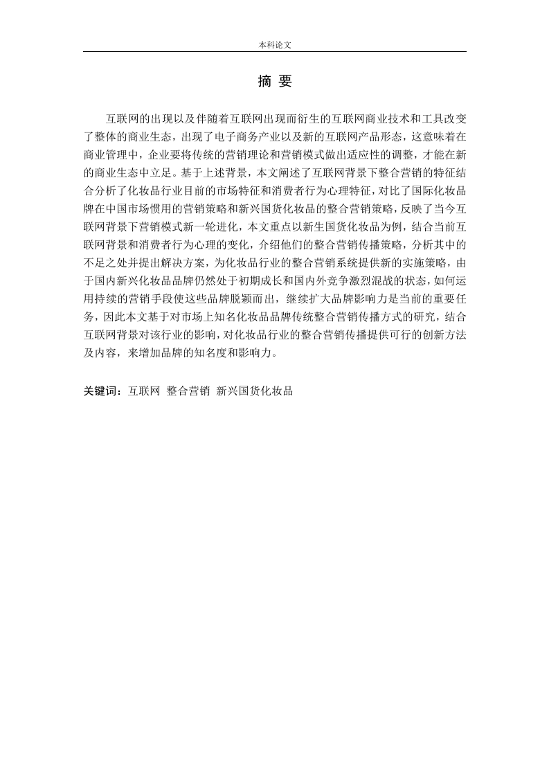 本科论文摘要互联网的出现以及伴随着互联网出现而衍生的互联网商业技术和工具改变了整体的商业生态,出现了电子商务产业以及新的互联网产品形态,这意味着在商业管理中,企业要将传统的营销理论和营销模式做出适应性的调整,才能在新的商业生态中立足。基于上述背景,本文阐述了互联网背景下整合营销的特征结合分析了化妆品行业目前的市场特征和消费者行为心理特征,对比了国际化妆品牌在中国市场惯用的营销策略和新兴国货化妆品的整合营销策略,反映了当今互联网背景下营销模式新一轮进化,本文重点以新生国货化妆品为例,结合当前互联网背景和消费者行为心理的变化,介绍他们的整合营销传播策略,分析其中的不足之处并提出解决方案,为化妆品行业的整合营销系统提供新的实施策略,由于国内新兴化妆品品牌仍然处于初期成长和国内外竞争激烈混战的状态,如何运用持续的营销手段使这些品牌脱颖而出,继续扩大品牌影响力是当前的重要任务,因此本文基于对市场上知名化妆品品牌传统整合营销传播方式的研究,结合互联网背景对该行业的影响,对化妆品行业的整合营销传播提供可行的创新方法及内容,来增加品牌的知名度和影响力。关键词:互联网整合营销新兴国货化妆品本科论文AbstractThe emergence of the Internet and the Internet business technology and toolsderived from the emergence of the Internet have changed the overall business ecology,and the emergence of e-commerce industry and new Internet product forms,whichmeans that in business management,enterprises need to make adaptive adjustments tothe traditional marketing theory and marketing model in order to be based in the newbusiness ecology.Under the background of modern business,the Internet has broughta great wave of information,and marketing has become the top priority of allenterprises'management behaviors.Meanwhile,the cosmetics industry has beenshuffled.The changes in the macro and micro market environment have made the riseof domestic cosmetics brands.With the help of Internet Marketing,the emergingdomestic cosmetics brands have risen rapidly,and with the help of marketing,the pastsemi monopoly of foreign brands has been reversed And become the leader ofdomestic cosmetics market,so their marketing methods have great referencesignificance for the industry.Based on the above background,this paper expounds thecharacteristics of integrated marketing under the background of Internet,analyzes thecurrent market characteristics of cosmetics industry and the psychologicalcharacteristics of consumers'behavior,compares the marketing strategies commonlyused by international cosmetics brands in China market and the integrated marketingstrategies of new domestic cosmetics,and reflects the new round of evolution ofmarketing mode under the background of Internet.This paper focuses on For example,new domestic cosmetics,combined with the current internet background and changesin consumer behavior and psychology,introduce their integrated marketingcommunication strategies,analyze their shortcomings and propose solutions,so as toprovide new implementation strategies for the integrated marketing system of thecosmetics industry,As the domestic emerging cosmetics brands are still in the initialgrowth and fierce competition at home and abroad,how to use continuous marketingmeans to make these brands stand out and continue to expand the brand influence isan important task at present.Therefore,based on the research on the traditionalintegrated marketing communication mode of famous cosmetics brands in the market,this paper combines the internet background with the impact of the industry Toprovide feasible innovative methods and contents for integrated marketingcommunication of cosmetics industry to increase brand awareness and influence.本科论文Key words:Internet Integrated marketing new domestic cosmetics