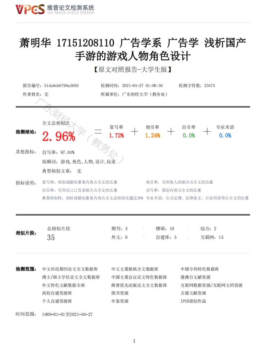 维普论文检测系统VIP PAPER CHECK SYSTEM萧明华17151208110广告学系广告学浅析国产手游的游戏人物角色设计【原文对照报告-大学生版】报告编号:51da9cb6799a3693检测时间:2021-04-2701:00:36检测字符数:23475作者姓名:无所属单位:广东财经大学(教务处)全文总相似比复写率他引率自引率专业术语检测结论:2.96%1.72%1.24%0.0%0.0%其他指标:自写率:97.04%教务处高频词:游戏,角色,人物,设计,玩家典型相似文章:无指标说明:复写率:相似或疑似重复内容占全文的比重他引率:引用他人的部分占全文的比重自引率:引用自己已发表部分占全文的比重自写率:原创内容占全文的比重典型相似性:相似或疑似重复内容占全文总相似比超过30%专业术语:公式定理、法律条文、行业用语等占全文的比重总相似片段期刊:3博硕:10综合:2相似片段:35外文:0自建库:5互联网:15检测范围:中文科技期刊论文全文数据库中文主要报纸全文数据库中国专利特色数据库博士/硕士学位论文全文数据库中国主要会议论文特色数据库港澳台文献资源外文特色文献数据全库维普优先出版论文全文数据库互联网数据资源/互联网文档资源高校自建资源库图书资源古籍文献资源个人自建资源库年鉴资源IPUB原创作品时间范围:1989-01-01至2021-04-27维普论文检测系统VIP PAPER CHECK SYSTEM原文对照颜色标注说明:■自写片段■复写片段(相似或疑似重复)口引用片段(引用)■专业术语(公式定理、法律条文、行业用语等)广东财经大学2021-JX16-GUANGDONG UNIVERSITY OF FINANCE ECONOMICS本科毕业论文(设计)浅析国产手游的游戏人物角色设计学院艺术与设计学院专业广告学班级17级广告学一班学号17151208110学生姓名萧明华指导教师刘月圆提交日期2021年4月18日毕业论文(设计)成绩评定表毕业论文(设计)指导教师评语及成绩成绩指导教师签名年月日毕业论文(设计)复评教师评语及成绩成绩复评教师签名年月日毕业论文(设计)答辩评语及成绩成绩答辩委员会主席签名年月日2维普论文检测系统VIP PAPER CHECK SYSTEM毕业论文(设计)总成绩(五级记分制)院(系)负责人签名年月日广东财经大学本科生毕业论文(设计)原创性声明本人郑重声明:所呈交的论文(设计)是本人在指导老师指导下独立进行研究工作所取得的成果。除文中已经注明引用的内容外,本论文不含任何其他个人或集体已经发表或撰写过的作品成果。对本文研究做出过重要贡献的个人和集体,均已在文中以明确的方式标明。因本论文(设计)引起的法律后果完全由本人承担。作者签名(手写):年月日指导老师签名(手写):年月日内容摘要在电子游戏产业的蓬勃发展的背景下,移动设备的推广使得手游成为了我国电子游戏行业中极为重要的一部分。在经历了发展初期鱼龙混杂的阶段后,手游行业已经逐渐脱离了追求“小投入大产出”的以小博大的模式,开始注重以优质的游戏内容来获得玩家青睐。在大部分的手游中,游戏人物都将作为玩家在虚拟世界的化身,这直接关系到了玩家对这些手游的第一印象,因此对手游人物的研究对于如何提升手游内容的质量具有重要的意义。本文将目光放在国内手游市场,用过分析当下手游人物角色设计的现状、特点与不足,并归纳总结手游人物角色设计的创作策略及创新策略,从而为手游的人物角色设计提供参考,以期达到更好的设计效果和提升用户体验,推动手游行业良性发展。关键词:手游:人物角色设计;创作及创新策略AbstractIn the context of the vigorous development of the video game industry,the promotion of mobiledevices has made mobile games an extremely important part of my country's video game industry.Afterexperiencing the early stage of development,the mobile game industry has gradually deviated fromthe pursuit of "small investment and large output"with a small and broad model,and began to focuson high-quality game content to gain the favor of players.In most mobile games,game characterswill be the avatars of players in the virtual world.This is directly related to the players'firstimpression of these mobile games.Therefore,research on opponents and visitors is important for howto improve the quality of mobile game content.Meaning.This article focuses on the domestic mobilegame market,analyzes the current situation,characteristics and shortcomings of the characterdesign of the mobile game,and summarizes the creative and innovative strategies of the characterdesign of the mobile game,so as to provide the character design of the mobile game.Reference,inorder to achieve better design effects and enhance user experience,and promote the sounddevelopment of the mobile game industry.Key words:Mobile games;Character design;Creative and innovative strategies目录引言1一、手游人物角色设计的现状2(一)技术升级带来视觉效果的提升2(二)重视女性市场2(三)商业化特征显著3(四)IP改编手游数量增长3(五)手游产品集中化3(六)手游的移动性对其影响深远4二、影响手游人物角色设计的因素6(一).游戏类型决定人物角色设计偏向6(二)游戏风格决定人物角色设计风格83