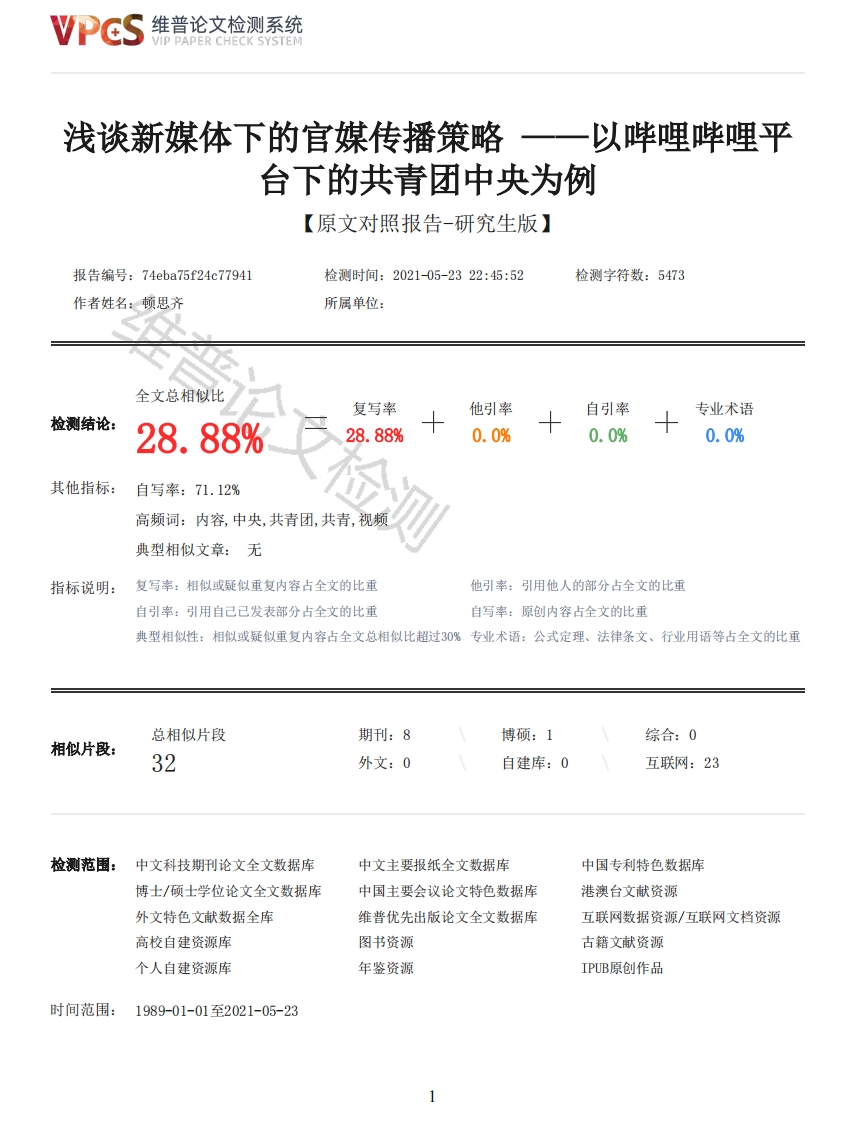 维普论文检测系统VIP PAPER CHECK SYSTEM浅谈新媒体下的官媒传播策略一一以哔哩哔哩平台下的共青团中央为例【原文对照报告-研究生版】报告编号:74eba75f24c77941检测时间:2021-05-2322:45:52检测字符数:5473作者姓名:顿思齐所属单位:全文总相似比复写率他引率自引率专业术语检测结论:28.88%28.88%0.0%0.0%0.0%其他指标:自写率:71.12%高频词:内容,中央,共青团,共青,视频典型相似文章:无指标说明:复写率:相似或疑似重复内容占全文的比重他引率:引用他人的部分占全文的比重自引率:引用自己已发表部分占全文的比重自写率:原创内容占全文的比重典型相似性:相似或疑似重复内容占全文总相似比超过30%专业术语:公式定理、法律条文、行业用语等占全文的比重总相似片段期刊:8博硕:1综合:0相似片段:32外文:0自建库:0互联网:23检测范围:中文科技期刊论文全文数据库中文主要报纸全文数据库中国专利特色数据库博士/硕士学位论文全文数据库中国主要会议论文特色数据库港澳台文献资源外文特色文献数据全库维普优先出版论文全文数据库互联网数据资源/互联网文档资源高校自建资源库图书资源古籍文献资源个人自建资源库年鉴资源IPUB原创作品时间范围:1989-01-01至2021-05-23维普论文检测系统VIP PAPER CHECK SYSTEM原文对照颜色标注说明:■自写片段■复写片段(相似或疑似重复)口引用片段(引用)■专业术语(公式定理、法律条文、行业用语等)中国传媒大学研究生课程作业提单我确认已经认真阅读《中国传媒大学学术道德规范实施细则》及《中国传媒大学研究生基本学术规范》,并且了解学术舞弊的危害性。我保证以下提交的作业完全由我本人完成(或由我参与的小组共同完成),任何引用的参考文献、注释都已做标注。请认真填写下述表格信息姓名顿思齐手机号码18518382521学号202053055200034专业名称国际新闻与传播课程名称传媒与社会课程编码2275510010期中/期末作业期末作业作业上交截止日期2021年05月24日授课者任孟山学生本人亲笔签名/日期:作业合作者任课或指导教师的评语:收到日期:签收人:口按期交作业口逾期交作业分数:阅卷人:此评语需反馈给学生日期:所有分数须提交专业指导小组审核维普论文检测系统VIP PAPER CHECK SYSTEM中国传媒大学2020-2021学年第二学期《传媒与社会》课程结课论文题目:浅谈新媒体下的官媒传播策略一一以哔哩哔哩平台下的共青团中央为例院别:国际传媒教育学院专业:国际新闻与传播指导老师:任孟山姓名:顿思齐以学号:202053055200034上交时间:2021/5/23浅谈新媒体下的官媒传播策略上一一以哔哩哔哩平台下的共青团中央为例摘要:在现如今新媒体技术的发展突飞猛进,如今成为了跟报纸、杂志、广播、电视之后的又一大新兴媒介产业。近些年共青团中央也开始充分利用新媒体平台进行全方位的青少年思政工作,本文以哔哩哔哩为载体的官媒共青团中央为例,研究官方主流媒体是如何在新媒体平台下进行传播的。一.研究背景《后浪》引起的“争议“青年们的“抵抗“令很多”前浪“困惑:夸也不行,骂也不行,官方主流话语究竞应该如何与当代的青年交流?共青团中央入驻新媒体后的话语表达一一贴近青年网络流行文化”“那年那兔那些事”“阿中哥哥”“江山娇与红旗漫”。《后浪》发布后,这一献给新一代的演讲较多的被非B站核心用户的70后转发,为青年人加油鼓劲:而作为B站核心用户群体的那部分青年人却鲜少转发,甚至部分熟知B站和亚文化的青年人对《后浪》提出质疑,认为B站不再是原来的那个B站了,认为青年人不愿被翅站代表、不愿被贴标签,认为《后浪》中提到的“更多的选择”只不过是有钱人家孩子的选择,其他平凡的年轻人仍然遭受着贫富差距、就业压力、生存压力等社会问题。二.研究目的及意义本文围绕共青团中央在B站建立的现象展开。以共青团中央B站提供的视频为研究样本,分析研究了其传播与传播内容策略,并根据站的亚文化环境探索这些沟通内容的含义。特点和采用的沟通策略是什么。分析的主要方向如下:首先,分析共青团中央在B站的地位和作用,并解释共青团中央在B站的报告的特点,在其新的媒体矩阵中,独特的传播价值是什么?其次,它基于此上面,深入分析了内部网络沟通策略和共青团中央委员会官方账户的不足,以期为其他类似党务和政府事务账户的网络通信提供基准价值:第三,针对以上研究和分析,提出与互联网上政治传播有关的新政府事务。改进和加强的建议。通过对这一系列问题的讨论,经验得到了完善,并形成了关于我国新政府媒体如何推动网络传播的新思路。年轻人的当前价值观和世界观的特点是多元化和个性化。因此,以年轻人为主体的网络空间出现了亚文化现象。它的主要特征是对传统文化形式的颠覆和解构。在这种情况下,严肃的传统占主导地位的文化可能会流行甚至是庸俗的。因此,重新探索互联网时代政治交流的有效途径具有重要意义。共产主义青年团本身承担着指导和服务青年的任务。如何更有效地利用互联网在青年群体中传播主导思想已成为共青团中央青年改革的关键。共青团中央委员会落户B站后,如何调整视频内容以及可以采用哪些通信策略作为基准,以实现有效的网络通信。通过收集和分析视频数据示例和案例研究,从B联盟站中央委员会报告中总结内容特征,沟通策略和