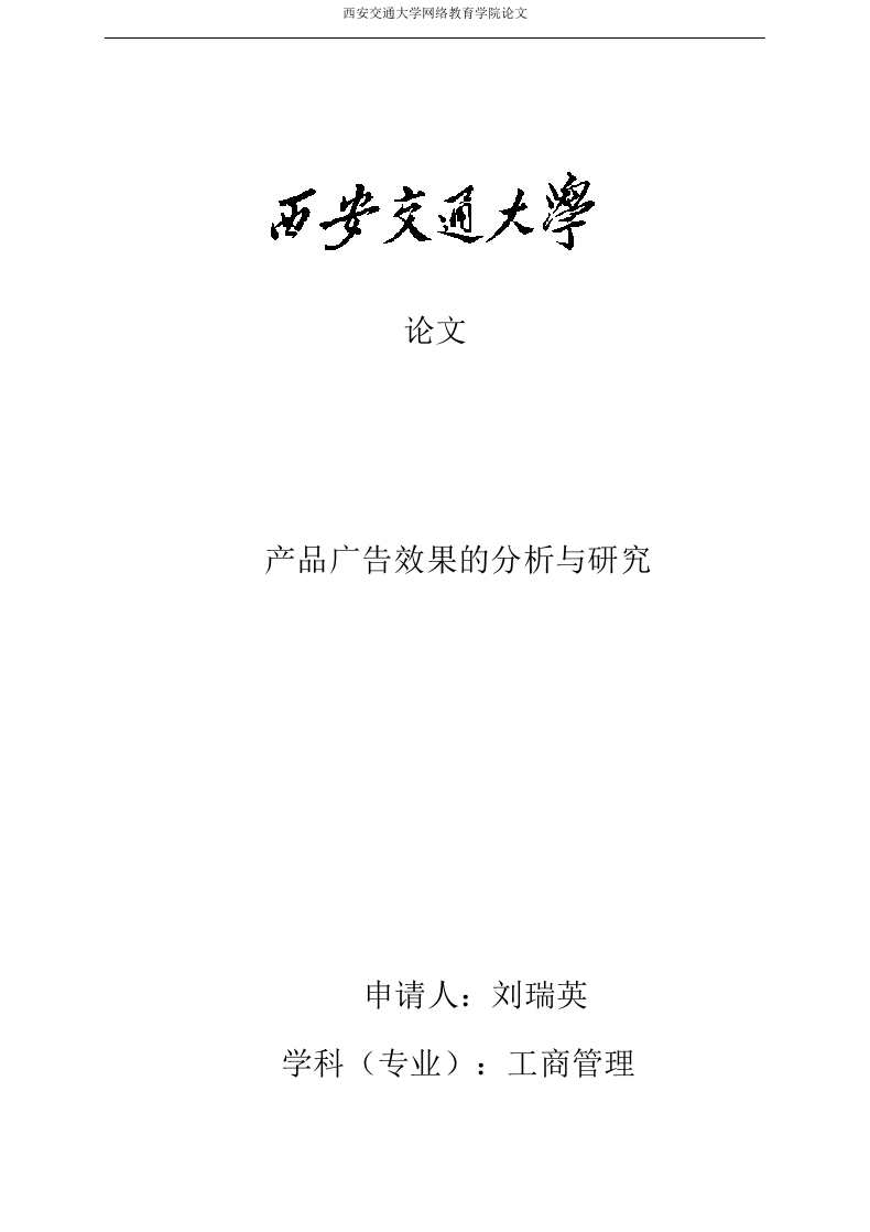 西安交通大学网络教育学院论文论文产品广告效果的分析与研究申请人:刘瑞英学科(专业):工商管理西安交通大学网路教育学院论文摘要广告在我们生活中随处可见,广告效果的提升就尤为必要,本文从广告效果的含义、特征与分类到制约广告效果提升的因素进行探讨,发现广告效果受经济及价值规律、名人效应、产品品质、消费者消费心理及消费行为、广告创意等诸多因素影响,有针对性的提出了如何能在以上几方面着手提升广告效果,让广告更好地服务于社会经济文化生活及大众,也为商家带来更多经济效益,让企业攫取更多经济财富。关键字:广告:广告效果:价值规律:名人效应:消费者心理:创意广告西安交通大学网络教育学院论文目录1绪论…1.1选题背景和研究价值..1.2相关理论综述1.3本文的研究方法和思路22.1广告的概念.....2.2广告效果的含义....22.3广告效果的类别与特点..22.4广告效果的国内外研究综述32.4.1国内研究情况..33广告效果的影响因素分析53.1价值规律.…4提升产品广告效果的有效途径.·74.1提升广告产品的优秀品质..74.2顺应社会价值、经济规律。。74.3创意广告永远具有吸引力.....84.41重视“尊重文化习俗”的消费者心理..94.4.3利用“重复记忆”94.4.4充分利用消费者的潮流时尚偏好1010111213