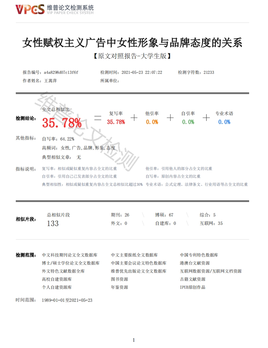 维普论文检测系统VIP PAPER CHECK SYSTEM女性赋权主义广告中女性形象与品牌态度的关系【原文对照报告-大学生版】报告编号:a4a8298d07c13f6f检测时间:2021-05-2322:07:22检测字符数:21233作者姓名:王嵩萍所属单位:全文总相似比复写率他引率自引率专业术语检测结论:35.78%35.78%0.0%0.0%0.0%其他指标:自写率:64.22%高频词:女性,广告,品牌,形象,态度典型相似文章:无指标说明:复写率:相似或疑似重复内容占全文的比重他引率:引用他人的部分占全文的比重自引率:引用自己已发表部分占全文的比重自写率:原创内容占全文的比重典型相似性:相似或疑似重复内容占全文总相似比超过30%专业术语:公式定理、法律条文、行业用语等占全文的比重总相似片段期刊:26博硕:67综合:5相似片段:133外文:0自建库:0互联网:35检测范围:中文科技期刊论文全文数据库中文主要报纸全文数据库中国专利特色数据库博士/硕士学位论文全文数据库中国主要会议论文特色数据库港澳台文献资源外文特色文献数据全库维普优先出版论文全文数据库互联网数据资源/互联网文档资源高校自建资源库图书资源古籍文献资源个人自建资源库年鉴资源IPUB原创作品时间范围:1989-01-01至2021-05-23维普论文检测系统VIP PAPER CHECK SYSTEM原文对照颜色标注说明:■自写片段■复写片段(相似或疑似重复)口引用片段(引用)■专业术语(公式定理、法律条文、行业用语等)HUAQIAO UNIVERSITY本科毕业论文女性赋权主义广告中女性形象与品牌态度的关系院(系)工商管理学院专业市场营销专业届别2021届学号1616311034姓名王嵩萍指导老师李晓龙指导老师职称讲师华侨大学教务处印制2021年5月华侨大学工商管理学院本科学位论文原创性及版权说明书本人声明所呈交的学位论文是我个人在指导老师指导下进行的研究工作及取得的研究成果。除已特别加以标注和致谢的地方外,论文中不包含任何他人已经发表或撰写过的研究成果。对本文的研究做出贡献的个人和集体,均已在文中以明确方式标明。本论文的选题来源于自选(指导老师课题,指导老师,自选,其他)。对于选题来源于指导老师课题或指导老师的论文,未经指导老师允许,不得私自发表或出版。本人完全意识到本声明的法律结果由本人承担。学位论文作者签名:指导老师签名:日期:日期:摘要“她经济“的崛起,促进了中国女性赋权广告营销的发展,但是传统的性别观念和刻板印象依旧存在。通过梳理上世纪女性主义运动以来的女性广告形象的演变,本文试图探讨,在女性意识觉醒的现代社会,怎样的女性形象是符合消费者价值观,与品牌的产品或服务相契合,能够提升品牌形象的。结果发现女性自主意识和消费者对广告中女性形象的态度和品牌态度有显著影响。最后根据实验结论,提出一些品牌女性营销方向的实践性建议。关键词:女性主义自主意识广告态度品牌态度Abstract2维普论文检测系统VIP PAPER CHECK SYSTEMThe rise of "Her economy"has promoted the development of Femvertising in China,buttraditional gender concepts and stereotypes still exist.Through combing the evolution of the femaleadvertising image since the feminist movement in the last century,this paper attempts to explore,in the modern society of female consciousness awakening,what kind of female image is in line withconsumer values,with the brand products or services,can enhance the brand image.The results showthat women's self-awareness and consumers'attitude towards the image of women in advertising andbrand attitude have significant impact.Finally,according to the conclusion of the experiment,thepaper puts forward some practical suggestions on the marketing direction of brand women.Keywords:Feminist self-consciousness advertising attitude brand attitude目录1引言11.1研究背景11.1.1现实背景11.1.2理论背景21.2研究目的21.3研究意义22文献综述32.1女性赋权广告32.2女性广告形象42.3女性自主意识53研究设计63.1假设提出6普论文检测3.2理论模型63.3数据收集73.3.1收集方法73.3.2问卷设计73.3.3总体与样本113.3.4抽样方法113.3.5收集情况114数据分析114.1信度检验114.2效度检验124.3描述性统计144.4相关性分析235研究讨论245.1研究结论245.1.1女性自主意识对品牌态度影响显著255.1.2消费者对广告中女性形象的态度对品牌态度影响显著255.2研究贡献255.2.1品牌塑造真实的女性形象255.2.2品牌应该消除女性的刻板印象265.2.3品牌应尽可能脱离商业逻辑,避免女性焦虑265.3研究局限275.3.1样本的局限性275.3.2行业的局限性27参考文献28致谢303