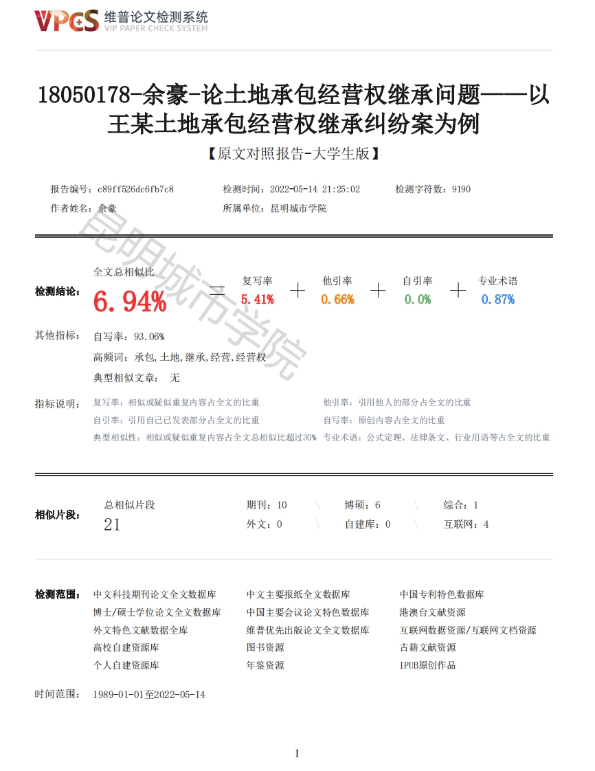 维普论文检测系统VIP PAPER CHECK SYSTEM18050178-余豪-论土地承包经营权继承问题一一以王某土地承包经营权继承纠纷案为例【原文对照报告-大学生版】报告编号:c89ff526dc6fb7c8检测时间:2022-05-1421:25:02检测字符数:9190作者姓名:所属单位:昆明城市学院全文总相似比他引率自引率专业术语检测结论:6.94%学复写率5.41%0.66%0.0%0.87%其他指标:自写率:93.06%高频词:承包,土地,继承,经营,经营权典型相似文章:无指标说明:复写率:相似或疑似重复内容占全文的比重他引率:引用他人的部分占全文的比重自引率:引用自己已发表部分占全文的比重自写率:原创内容占全文的比重典型相似性:相似或疑似重复内容占全文总相似比超过0%专业术语:公式定理、法律条文、行业用语等占全文的比重总相似片段期刊:10博硕:6综合:1相似片段:21外文:0自建库:0互联网:4检测范围:中文科技期刊论文全文数据库中文主要报纸全文数据库中国专利特色数据库博士/硕士学位论文全文数据库中国主要会议论文特色数据库港澳台文献资源外文特色文献数据全库维普优先出版论文全文数据库互联网数据资源/互联网文档资源高校自建资源库图书资源古籍文献资源个人自建资源库年鉴资源IPUB原创作品时间范围:1989-01-01至2022-05-14维普论文检测系统VIP PAPER CHECK SYSTEM原文对照颜色标注说明:■自写片段■复写片段(相似或疑似重复)引用片段(引用)■专业术语(公式定理、法律条文、行业用语等)学科分类号820商YUNNAN NORMAL UNIVERSITY BUSINESS SCHOOL本科学生毕业论文(设计)题目论土地承包经营权继承问题一以王某土地承包经营权继承纠纷案为例姓名余豪学号18050178院(系)法学院专业法学指导教师杜江江2021年11月17日目录关键词一、序言二、王文明、王文华诉王文喜土地承包经营权继承纠纷案简介················1(二)争议焦点分析··········2维普论文检测系统VIP PAPER CHECK SYSTEM(二)土地承包经营权继承问题的分析········1.农村土地承包经营权的性质决定了其具有不可继承性2.土地承包经营权本身不属于可继承的财产·······四、我国关于农村土地承包经营权与继承的现状与缺陷(一)立法现状·····················(二)存在的问题···················1.继承关系与承包关系主体冲突···2.承包权继承与客观实际不相适应3.土地承包继承范围界定欠科学···········五、完善我国农村土地承包经营权继承问题的建议(一)应当确立农村土地承包经营权不能继承·····(二)应当把农村土地承包经营权继承问题参照机动地解决··参考文献·······1111论土地成本经营权继承问题一一以“王文明、王文华诉王文喜土地承包经营权继承纠纷案”为例摘要:在今天的社会中,国家对于农业、农村、农民等“三农”问题的各种法律法律、政策等方面的调整,其所种植的农作物价格在上涨,相应的土地作为农村生活中必不可少的组成要素,也随着其他方面的变化而升值。由此一来,会出现各种各样的承包土地经营权纠纷,相应的对其的继承权纠纷也会越来越多,因此在目前的司法实践中如何正确处理农村土地承包经营权的问题,彻底解决好纠纷是法律工作者的重要难题。关键词:土地承包经营权:继承:分歧:完善一、序言随着“法治国家、法治政府、法治社会”的建设,法律在我们的生活中发挥了越来与广泛的作用,在法律的保障下,在人民遭受侵害时,能够及时的得到救济,然而因为民事纠纷涉及的极为广泛,在某些情况下,民事法律制度无法顾及到社会生活中发生的某些事情,在土地承包经营权视域下的继承权就是一方面的问题,在出现问题时,法律需要作出相应的调整,进而能更好的解决纠纷,从而对应当前的土地承包经营权继承问题,保护土地承包经营权下的民事法律关系主体之间的利益平衡,保护人权,使我们的社会关系更加和谐。二、王文明、王文华诉王文喜土地承包经营权继承纠纷案简介(一)案情简介王文明、王文华、王文喜三人系兄弟关系,三人和父亲王凤翔均居住在昆明市某乡。2010年6月,父亲王凤翔身3