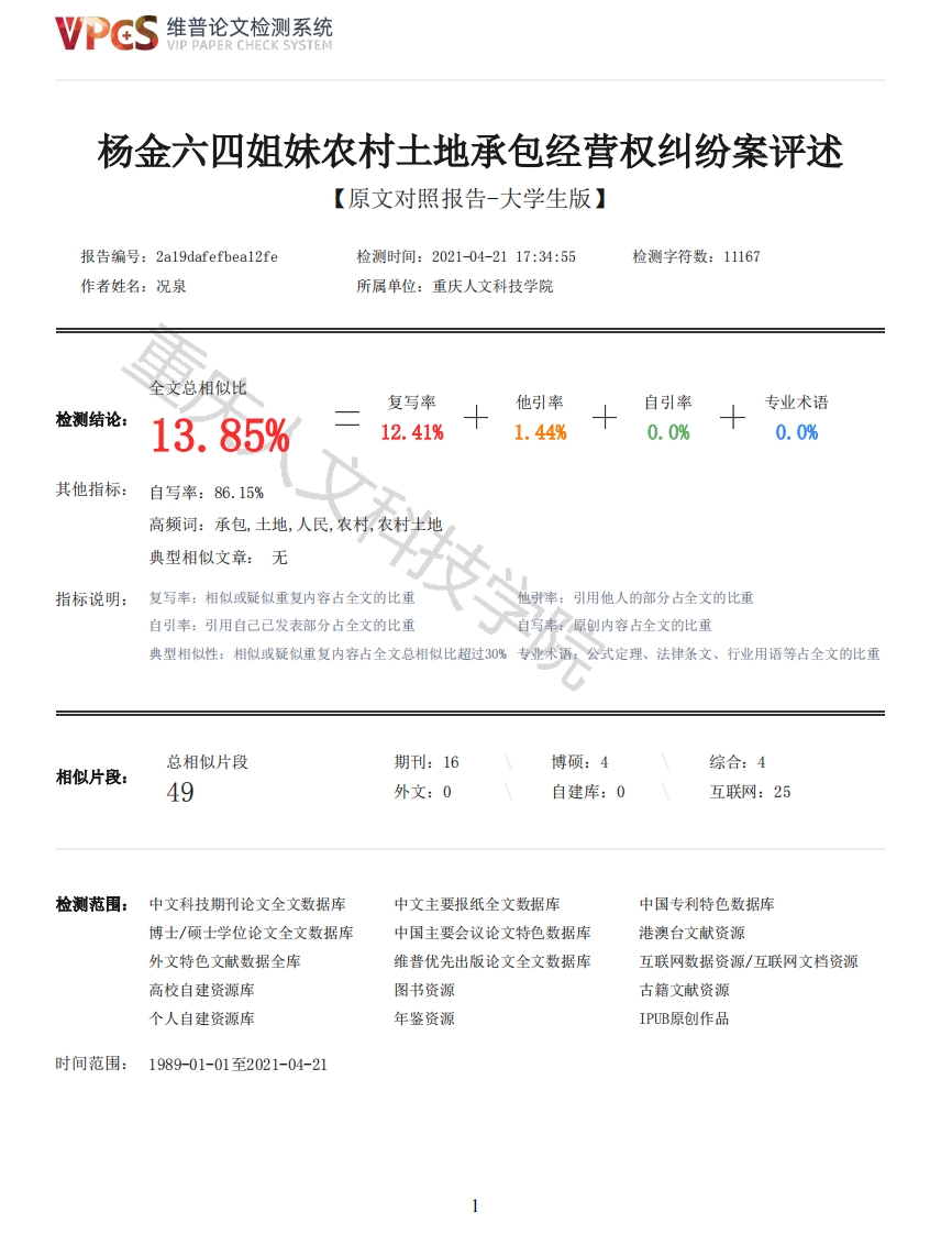 维普论文检测系统VIP PAPER CHECK SYSTEM杨金六四姐妹农村土地承包经营权纠纷案评述【原文对照报告-大学生版】报告编号:2al9 dafefbeal2fe检测时间:2021-04-2117:34:55检测字符数:11167作者姓名:况泉所属单位:重庆人文科技学院全文总相似比复写率他引率自引率专业术语检测结论:13.85%12.41%1.44%0.0%0.0%其他指标:自写率:86.15%高频词:承包,土地,人民,农村,农村土地典型相似文章:无指标说明:复写率:相似或疑似重复内容占全文的比重引用他人的部分占全文的比重自引率:引用自己已发表部分占全文的比重自写率:原创内容占全文的比重典型相似性:相似或疑似重复内容占全文总相似比超过30%专业术语:公式定理、法律条文、行业用语等占全文的比重总相似片段期刊:16博硕:4综合:4相似片段:49外文:0自建库:0互联网:25检测范围:中文科技期刊论文全文数据库中文主要报纸全文数据库中国专利特色数据库博士/硕士学位论文全文数据库中国主要会议论文特色数据库港澳台文献资源外文特色文献数据全库维普优先出版论文全文数据库互联网数据资源/互联网文档资源高校自建资源库图书资源古籍文献资源个人自建资源库年鉴资源IPUB原创作品时间范围:1989-01-01至2021-04-21维普论文检测系统VIP PAPER CHECK SYSTEM原文对照颜色标注说明:■自写片段■复写片段(相似或疑似重复)口引用片段(引用)■专业术语(公式定理、法律条文、行业用语等)Chongqing College of Humanities,Science Technology本科毕业论文题目杨金六四姐妹农村土地承包经营权纠纷案评述学院政治与法律学院专业法学年级2017级学号2017104275姓名况泉指导教师石金钢2021年5月目录摘要1关键词1AbstractlKey words2一、案情综述3二、评析杨金六四姐妹诉请及理由4(一)杨金志的诉请及理由评析4(二)杨金盆的诉请及理由评析4(三)杨金木的诉请及理由评析5(四)杨金六的诉请及理由评析5三、评析人民政府及人民法院处理方案6(一)评析两政行处字[2020]01号两林乡人民政府处理方案6(二)评析凤政复决字[2020]第4号凤凰县人民政府处理方案72维普论文检测系统VIP PAPER CHECK SYSTEM(三)评析(2017)湘3123民初944号人民法院处理方案8(四)评析(2018)湘民终287号中级人民法院处理方案8四、本纠纷案评判及我国农村土地承包经营权纠纷处理方案的构建9(一)本纠纷案评判9(二)农村土地承包经营权纠纷处理方案的构建9参考文献12致谢13附录14杨金六四姐妹农村土地承包经营权纠纷案评述摘要:本文通过对杨金六四姐妹农村土地承包经营权纠纷案的案件事实进行研究,在收集、整理、分析相关案件资料基础上,进一步介绍、分析、评论杨金六四姐妹农村土地承包经营权纠纷案的处理方式,深入认识理解土地承包经营权,拓展研究我国用益物权制度下关于农村土地承包经营权的现状及关于农村土地承包经营权纠纷案的一般处理原则。同时,在评析对杨金六四姐妹的诉求及理由请求下,分析我国法院和政府关于该案例的处理方案,形成自己关于对该案处理的方案。最终,充分把握我国民法制度与土地法制度下关于对农村土地承包经营权设立的深刻意义以及对我国未来关于农村土地承包经营权纠纷案的处理提供参考方案。关键词:农村土地承包经营权纠纷处理Abstract:This paper studies the facts of the dispute case of Yang Jin's 64 sisters'rural landcontractual management right.On the basis of collecting,sorting out and analyzing the relevantcase data,it further introduces,analyzes and comments on the handling methods of the dispute caseof Yang Jin's 64 sisters'rural land contractual management right,so as to have a deepunderstanding of the land contractual management right and expand the research on the issues underChina's usufructuary right system The current situation of rural land contractual management rightand the general principles of handling disputes over rural land contractual management right.At thesame time,in the analysis of the appeal and reason request of Yang Jin's 64 sisters,this paperanalyzes the treatment plan of the court and the government on the case,and forms its own plan onthe treatment of the case.Finally,we should fully grasp the profound significance of theestablishment of rural land contractual management right under China's civil law system and land lawsystem,and provide a reference scheme for China's future disputes over rural land contractualmanagement right.Key words:Rural land contract management right,dispute,resolution一、案情综述本文通过对杨金六四姐妹关于农村土地纠纷相关资料的收集与整理,特形成以下案情综述:杨金六、杨金木与杨金志、杨金盆系亲姐妹,在1981年分到户时,凤凰县两林乡叭高村按照劳动力分的田地,成年男子折算10工分,参加劳动的妇女算8工分,未参加劳动的儿童算5工分。以四姐妹父亲杨杰恩为户主的家庭以5个人39总工分共承包了生产队(现村民小组)的11.8亩田和4亩地。其中杨杰恩算10工分,杨金六、杨金木和四姐妹母亲三人算8工分,杨金志算5工分参与田地承包,杨金盆于1977年嫁给本组村民,未参加父亲杨杰恩的家庭承包。1991年2月杨金六嫁给本村2组村民龙金望,1992年2月,杨杰恩妻子去世,1992年10月杨金木嫁给本组村民吴绍仁。杨金六和杨金木出嫁后,在夫家生活。1998年杨杰恩将家庭承包的田地中杨金木应有的份额分割归还给她,具体是“高怪”水田2亩,“板盈勇”旱地三块相连共0.8亩。1998年杨金志和隆金付结婚,两人与父亲杨杰恩共同生活。1999年杨杰恩以杨金志夫妇不尽孝道为由,拒