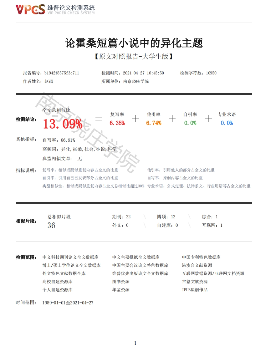 维普论文检测系统VIP PAPER CHECK SYSTEM论霍桑短篇小说中的异化主题【原文对照报告-大学生版】报告编号:b1942f8575f3c711检测时间:2021-04-2716:45:50检测字符数:10950作者姓名:赵越所属单位:南京晓庄学院全文总相似比复写率他引率自引率专业术语检测结论:13.09%6.35%6.74%0.0%0.0%其他指标:自写率:86.91%高频词:异化霍桑,社会,小说,科学典型相似文章:无指标说明:复写率:相似或疑似重复内容占全文的比重他引率:引用他人的部分占全文的比重自引率:引用自己已发表部分占全文的比重自写率:原创内容占全文的比重典型相似性:相似或疑似重复内容占全文总相似比超过30%专业术语:公式定理、法律条文、行业用语等占全文的比重总相似片段期刊:22博硕:12综合:1相似片段:36外文:0自建库:0互联网:1检测范围:中文科技期刊论文全文数据库中文主要报纸全文数据库中国专利特色数据库博士/硕士学位论文全文数据库中国主要会议论文特色数据库港澳台文献资源外文特色文献数据全库维普优先出版论文全文数据库互联网数据资源/互联网文档资源高校自建资源库图书资源古籍文献资源个人自建资源库年鉴资源IPUB原创作品时间范围:1989-01-01至2021-04-27维普论文检测系统VIP PAPER CHECK SYSTEM原文对照颜色标注说明:■自写片段■复写片段(相似或疑似重复)口引用片段(引用)■专业术语(公式定理、法律条文、行业用语等)分类号:南京晓庄学学校代码:11460学号:17010545南京晓庄学院本科生毕业论文论霍桑短篇小说中的异化主题On the theme of alienation in Hawthorne's short stories所属学院:文学院学生姓名:赵越指导教师:冯羽职称:教授研究起止日期:二O二O年七月至二O二一年五月二O二一年五月学位论文独创性声明本人郑重声明:1.坚持以“求实、创新”的科学精神从事研究工作。2.本论文是我个人在导师指导下进行的研究工作和取得的研究成果。3.本论文中除引文外,所有实验、数据和有关材料均是真实的。4.本论文中除引文和致谢的内容外,不包含其他人或其它机构已经发表或撰写过的研究成果。5.其他同志对本研究所做的贡献均已在论文中作了声明并表示了谢意。作者签名:日期:2021.4.25【摘要】纳撒尼尔·霍桑是美国十九世纪后期著名的浪漫主义作家,一生笔耕不辍,是美国文学的代表作家。那个政治、经济和哲学新观点层出不穷、飞速发展变化的新时代在他细腻的笔触和独特的审视视角下得到了新的呈现。相较于霍桑长篇小说《红字》,学术界并未对霍桑短篇小说进行相对深入研究,仍处于较为薄弱的状态。本文对霍桑短篇小说中的异化主题进行研究,从人与自我的异化、人与他人的异化、人与自然的异化、个人与社会的异化这四个方面结合小说文本进行具体分析,探索思考其意义。霍桑对异化问题持续并积极寻找解决的方法,正是由于这种独到的眼光和超前的意识才使得其作品历久弥新。【关键词】纳撒尼尔·霍桑:短篇小说:异化主题[Abstract]Nathaniel Hawthorne is a famous American romantic writer in the late 19th century.He is a representative writer of American literature.The new era of political,economic andphilosophical ideas emerging in endlessly and developing rapidly has been presented with hisdelicate brushwork and unique perspective.Compared with Hawthorne's novel the scarlet letter,the2维普论文检测系统VIP PAPER CHECK SYSTEMacademic circle has not conducted a relatively in-depth study of Hawthorne's short stories,which isstill in a relatively weak state.This paper studies the theme of alienation in Hawthorne's shortstories,and makes a concrete analysis from four aspects:the alienation of man and himself,thealienation of man and others,the alienation of man and nature,and the alienation of individual andsociety.Hawthorne's persistent and active search for solutions to the problem of alienation is dueto his unique vision and advanced consciousness,which makes his works lasting.[Key words Nathaniel Hawthorne;Short stories;Alienation theme目录引言1二、异化概念的产生与发展2三、异化主题在霍桑短篇小说中的具体表现3(一)人与自我关系的异化3(二)人与人之间关系的异化4(三)人与自然关系的异化5(四)人与社会关系的异化6四、异化主题的意义7(一)对霍桑所处时代的历史价值7(二)对当代社会的影响和现实意义8结语8参考文献9致谢10引言纳撒尼尔·霍桑是美国19世纪浪漫主义的重要代表,他一生创作了包括《红字》《带七个尖角阁的房子》及《福谷传奇》等在内的7部长篇小说,其中《红字》奠定了他在美国文坛中的地位:霍桑同时还是美国文学史上首位创作短篇小说的作家,他一生著有140多篇短篇小说,分成7本文集出版。他创作的短篇小说风格清新,就像霍桑自己所形容的那样,他的短篇小说形同“偏僻山谷中带有苍白色彩的花朵”[1]。霍桑致力于文学事业,一生笔耕不辍,他创作的长篇小说《红字》、《玉石人像》、《带有七个尖角阁的房子》、《福谷传奇》等在全球范围内堪称经典的著作,两部短篇小说集《重讲一遍的故事》、《古宅青苔》被翻译成不同的语言传播到世界各国,至今仍有许多人拜读品味。霍桑是出生于十九世界的美国,美国的经济科技在十九世纪上半叶处于高速发展时期,与此同时高速发展带来的还有各种碰撞、摩擦。这个时期的美国是在矛盾统一中发展的,辉煌进步与保守落后共存。与高速发展的经济不匹配的是民族文化的发展,在根基深厚的欧洲文化面前,美国的民族文化显得