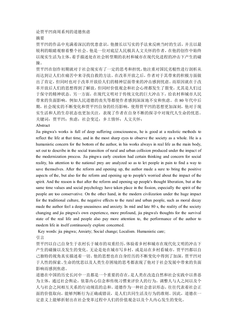 论贾平凹商周系列的道德焦虑摘要贾平凹的作品中充满着深沉的忧患意识,他擅长以写实的手法来反映当时的生活,并且以最锐利的眼睛观察着整个社会。他是一位对底层人民极具人文关怀的作者,在他的创作中始终以现实生活为主体,着手描述处在社会转型期的农村和城市在现代化进程的冲击下产生的碰撞。贾平凹在创作初期就对于社会现实有了一定的思考和担忧,他注重对国民劣根性进行剖析从而达到让人们在痛苦中来寻找自救的方法。在改革开放之后,作者对于其带来的积极方面做出了肯定,但同时也对于改革开放给人们的精神层面带来的冲击感到忧虑。而原因就在于改革开放后人们的思想得到了解放,但同时价值观念和社会心理都发生了裂变,尤其是人们过于保守的精神状态。另一方面,在现代文明对于传统文化的巨大神击下,给农村和城市人民带来的负面影响,例如人民道德的丧失等都使作者感到深深地不安和焦虑。在80年代中后期,社会现实的不新变化和贾平凹自身的经历影响,使得贾平凹的思想更加深刻,他对于现实生活和人的生存状态也更加关注,表现了作者在自身不断的探寻中对现代人生命的忧思。关键词:贾平凹:焦虑:社会变迁:乡土情怀:人文关怀:AbstractJia pingwa's works is full of deep suffering consciousness,he is good at a realistic methods toreflect the life at that time,and in the most sharp eyes to observe the society as a whole.He is ahumanistic concern for the bottom of the author,in his works always in real life as the main body,set out to describe in the social transition of rural and urban collision produced under the impact ofthe modernization process.Jia pingwa early creation had certain thinking and concern for socialreality,his attention to the national prey are analyzed so as to let people in pain to find a way tosave themselves.After the reform and opening up,the author made a sure to bring the positiveaspects of the,but also for the reform and opening up to people's worried about the impact of thespirit.And the reason is that after the reform and opening up people's thought liberation,but at thesame time values and social psychology have taken place in the fission,especially the spirit of thepeople are too conservative.On the other hand,in the modern civilization under the huge impactfor the traditional culture,the negative effects to the rural and urban people,such as moral decaymade the author feel a deep uneasiness and anxiety.In mid and late 80 s,the reality of the societychanging and jia pingwa's own experience,more profound,jia pingwa's thoughts for the survivalstate of the real life and people also pay more attention to,the performance of the author tomodem life in itself continuously explore concemed.Key words:jia pingwa;Anxiety;Social change;Localism.Humanistic care;引言贾平凹以自己自身生于农村长于城市的双重经历,体验着乡村和城市在现代化文明的冲击下产生的碰撞以及发生的变化。无论是处在城市写乡村,或是站在乡村看城市,贾平凹都以自己独特的视角真实描述着一切。他的思想也在自身经历的不断变化中得到了加深,贾平凹对于人性的探索、生命的忧思以及人类生存困境的思考都表现了他对于社会发展中带来的负面影响而感到焦虑。道德在中国的历史长河中一直都是一个重要的存在,是人类在改造自然和社会实践中以善恶为主体,通过社会舆论,依靠内心信念和传统习惯来评价人的行为,调整人与人之间以及个人与社会之间相互关系的行动规范的总和。道德作为一种社会意识形态,往往代表着社会正面的价值取向,能够判断行为正确或错误,是人们共同生活及行为的准则。因此,道德在一定意义上能够折射出在社会变革过程中人们的价值观念以及个人内心发生的变化。现代心理学认为:“焦虑”,就其本质意义而言,是由“生存的不适感”引发的心理势能的淤积。正如福柯在《文明与疯癫》一书中论证指出的:“焦虑”实质上不是一种自然现象,而是一种“文明的产物”。焦虑的根源在于对生命和生存的思考,焦虑情绪自身就含有丰富的意蕴。焦虑是作者在文学创作中的动力,它自身就包含着探索希望的可能性和意向性,在创作的过程中,作家的焦虑情绪得到升华。而作者之所以会产生道德焦虑,究其根本是对于社会变革中产生的道德危机发起的反抗。在现代文明的冲击下,传统观念下的道德与其产生了强烈的冲突,由此带来了当代中国人的道德焦虑和道德困惑。贾平凹的作品中极易发现良知和人性,而这一切都源自于作者自身的经历和觉悟以及对于生存和生命思考的结果。贾平凹的焦虑构成是方方面面的,一方面是对于作为社会主体的人类的生存状态,生命忧患的焦虑,另一方面是对于传统道德品质和传统文化流失的焦虑。从道德焦虑的角度纵观贾平凹商州系列的作品,可以分为以下几个部分:《鸡窝注人家》对于农村婚姻现实的不合理的担忧:《浮躁》中对农民自身美好传统品德的流失感到焦虑:《秦腔》中对传统优秀文化的衰败引发的深思:《高兴》中对进城务工的农民生存状态的剖析。贾平凹总是以自己独特的角度审视着这个社会,也在其作品中蕴含着强烈的探索精神。贾平凹道德焦虑的构成1、对于传统文化在现代文明冲击下发生的裂变感到焦虑新的时期到来了,它就像一股浪潮奔腾而来,敲打着每个人的心。有一部分人迅速觉醒了,看到了商品经济带来的利益,便急于去改变自身贫穷的状态,由此就刮起了一阵浮躁之风。也有一部分人觉