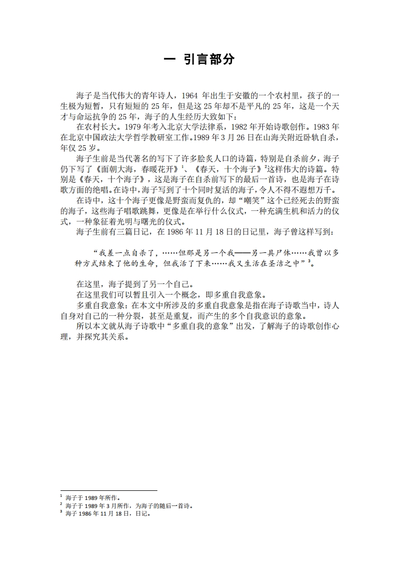一引言部分海子是当代伟大的青年诗人,1964年出生于安微的一个农村里,孩子的一生极为短暂,只有短短的25年,但是这25年却不是平凡的25年,这是一个天才与命运抗争的25年,海子的人生经历大致如下:在农村长大。1979年考入北京大学法律系,1982年开始诗歌创作。1983年在北京中国政法大学哲学教研室工作。1989年3月26日在山海关附近卧轨自杀,年仅25岁。海子生前是当代著名的写下了许多脍炙人口的诗篇,特别是自杀前夕,海子仍下写了《面朝大海,春暖花开》、《春天,十个海子》这样伟大的诗篇。特别是《春天,十个海子》,这是海子在自杀前写下的最后一首诗,也是海子在诗歌方面的绝唱。在诗中,海子写到了十个同时复活的海子,令人不得不遐想万千。在诗中,这十个海子更像是野蛮而复仇的,却“嘲笑”这个已经死去的野蛮的海子,这些海子唱歌跳舞,更像是在举行什么仪式,一种充满生机和活力的仪式,一种象征着光明与曙光的仪式。海子生前有三篇日记,在1986年11月18日的日记里,海子曾这样写到:“我差一点自杀了,…但那是另一个我一另一具尸体…我曾以多种方式结束了他的生命,但我活了下来…我又生活在圣洁之中”。在这里,海子提到了另一个自己。在这里我们可以暂且引入一个概念,即多重自我意象。多重自我意象:在本文中所涉及的多重自我意象是指在海子诗歌当中,诗人自身对自己的一种分裂,甚至是重复,而产生的多个自我意识的意象。所以本文就从海子诗歌中“多重自我的意象”出发,了解海子的诗歌创作心理,并探究其关系。1海子于1989年所作。2海子于1989年3月所作,为海子的随后一首诗。3海子1986年11月18日,日记。二、“多重自我意象”体现与分析其实早我读完《海子诗全集》之后发现,在海子所有的诗歌中包含多重自我意象的并不是很多,但是仍然在不少的诗歌当中有所涉及,这也许就表明海子在诗歌创作中可能是有意为之。本部分就是总结一下在《海子诗全集》中所有包含多重自我意象的诗歌。并从我所列出的诗歌当中,我们可以一一分析出,海子在诗歌创作中运用的“多重自我”的诗歌意象。1.《肉体(之一)》4他们抬起我/在一只飞越山梁的大鸟/我看见了自己/一枚松鼠肉体/般甜蜜的雨水/在我的肉中停顿/了片刻在《肉体(之一)》中,诗人的一个自我意识是诗歌中被“抬起”的自己,而另一重自我便是“一枚松鼠肉体般甜蜜的雨水”,并且这重自我意识是在“我”的身体里面。也就是说,在此时海子诗歌中开始出现了多重自我的意象,但是这只是一个自我意识意识到了另一个自我意识的存在,但是两者尚未分离,两者肉体是一体的,但是灵魂已经分离。我们可以可以把诗歌中多重自我意象理解成为是灵与肉的一个关系。野花,太阳明亮的女儿/河川和忧愁的妻子/感激肉体来临/感激灵魂有所附丽/(肉体是野花的琴/盖住骨骼的酒杯)/感激我自己沉重的骨骼/也能做梦/肉体是河流的梦/肉体看见了采茴香的人迎着泉水1986在《肉体(之二)》这首诗中运用的多个自我的意象是诗人完全把自己分裂开来,即为西川曾讲到的诗人的自我分裂,在这首诗中,诗人完全把自我分裂开来,并且这种诗人的自我分裂主要是肉体的自我分裂,所以说在本首诗中,“多重自我的诗歌意象”为诗人肉体的自我分裂。3.《死亡之诗(之二)》6雨夜偷牛的人/把我从人类/身体中偷走/我仍在沉睡/我被带到身体之外/葵4海子创作于1986年,截取自《海子诗全集》5海子创作于1986年,截取自《海子诗全集》6创作时间不详,大致在1983至1986年间。花之外,我是世界上/第一头母牛(死的皇后)/我觉得自己很美/我仍在沉睡随后在诗歌《死亡之诗(之二)》中“偷牛人”把我从身体中偷了出来,也就是在这首诗中的多重自我意识包括一个“熟睡的我”以及一个被偷走的我。自此,多重自我意象中两个自我意识开始分离,即是灵与肉开始分离,但是此时虽然灵与肉已经分离,但是两者仍为一个整体。4.《两座村庄》7天鹅的村庄/沉默孤独的村庄/一个在前一个在后/这就是普希金和我诞生的地方两座村庄隔河而睡/海子的村庄睡的更沉不过,我觉得在海子诗歌中,“多重自我意象”里面的多个自我意识真正分离就是在《两座村庄》这首诗中,在这首诗中,“多重自我意象”也是比较模糊的,诗歌主要写的是两个平行的村庄,两座村庄也分别孕育了海子和普希金两位伟大的诗人。但是,在这里就能够看出来,诗歌中“多重自我意象”里的另一个自我意识就是普希金,两者在诗歌中是一个平行的、相互独立,又有所联系的个体,这一点可以由两个村庄的关系可以推断出来。5.《月全食》8我看见这黑色的景色中只有我自己被上帝废弃不用/我构成我自己,用一个人形血肉用花朵与火包围着空虚的混沌/我看见我的斧子闪现着人类劳动的光辉/也有疲倦和灰尘在《月全食》这首诗中,海子在诗里面写了这样一句:“我构成我自己,用一个人形血肉用花朵与火包围着空虚的混沌”,为什么是我构成我自己呢?显然,在这首诗里,诗人在拥有自我意识的同时,还在创造另一个自己,显然诗歌中的“多重自我意象”已不再满足灵与肉的分离和独立。而是在灵与肉之外创造另外的自我意识。6.《春天,十个海子》7海子创作于1987年2月,修改于1987年5月8海子创作于1989年1月,1989年3月9日删改。
