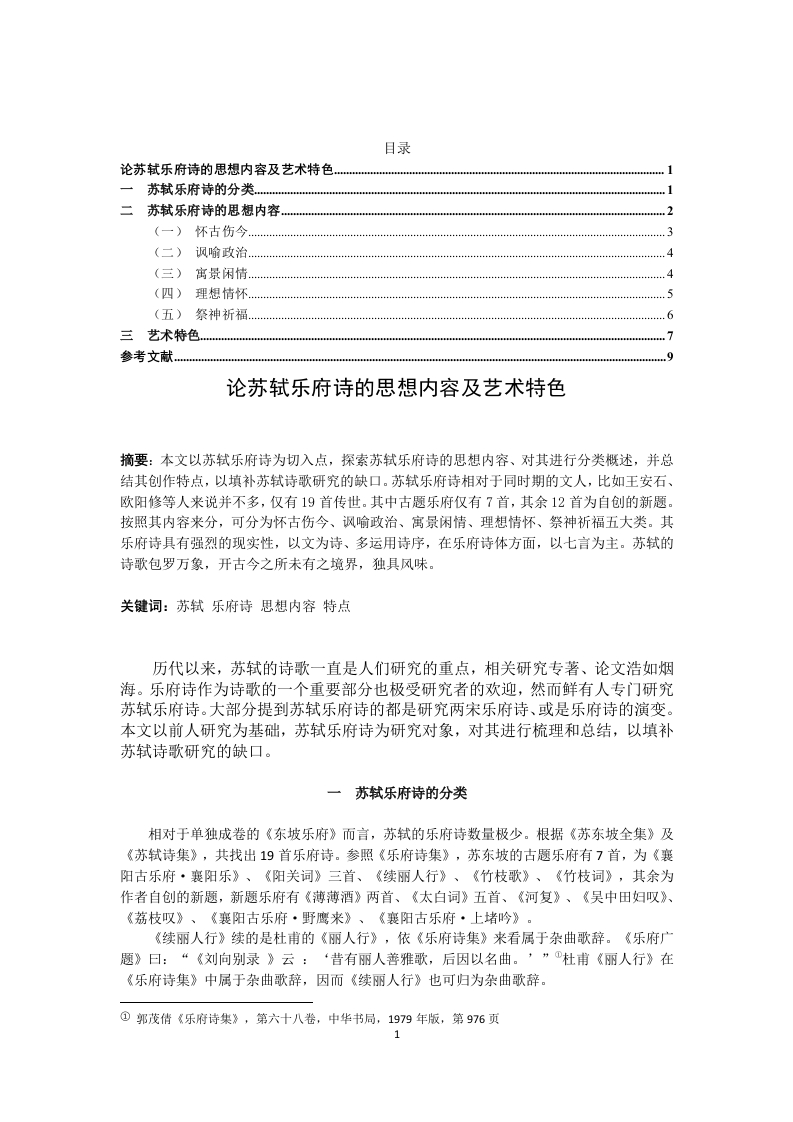 目录论苏轼乐府诗的思想内容及艺术特色…一苏轼乐府诗的分类二苏轼乐府诗的思想内容34(三)寓景闲情…(四)理想情怀(五)祭神祈福..6三艺术特色…参考文献论苏轼乐府诗的思想内容及艺术特色摘要:本文以苏轼乐府诗为切入点,探索苏轼乐府诗的思想内容、对其进行分类概述,并总结其创作特点,以填补苏轼诗歌研究的缺口。苏轼乐府诗相对于同时期的文人,比如王安石、欧阳修等人来说并不多,仅有19首传世。其中古题乐府仅有7首,其余12首为自创的新题。按照其内容来分,可分为怀古伤今、讽喻政治、寓景闲情、理想情怀、祭神祈福五大类。其乐府诗具有强烈的现实性,以文为诗、多运用诗序,在乐府诗体方面,以七言为主。苏轼的诗歌包罗万象,开古今之所未有之境界,独具风味。关键词:苏轼乐府诗思想内容特点历代以来,苏轼的诗歌一直是人们研究的重点,相关研究专著、论文浩如烟海。乐府诗作为诗歌的一个重要部分也极受研究者的欢迎,然而鲜有人专门研究苏轼乐府诗。大部分提到苏轼乐府诗的都是研究两宋乐府诗、或是乐府诗的演变。本文以前人研究为基础,苏轼乐府诗为研究对象,对其进行梳理和总结,以填补苏轼诗歌研究的缺口。一苏轼乐府诗的分类相对于单独成卷的《东坡乐府》而言,苏轼的乐府诗数量极少。根据《苏东坡全集》及《苏轼诗集》,共找出19首乐府诗。参照《乐府诗集》,苏东坡的古题乐府有7首,为《襄阳古乐府·襄阳乐》、《阳关词》三首、《续丽人行》、《竹枝歌》、《竹枝词》,其余为作者自创的新题,新题乐府有《薄薄酒》两首、《太白词》五首、《河复》、《吴中田妇叹》、《荔枝叹》、《襄阳古乐府·野鹰来》、《襄阳古乐府·上堵吟》。《续丽人行》续的是杜甫的《丽人行》,依《乐府诗集》来看属于杂曲歌辞。《乐府广题》曰:“《刘向别录》云:‘昔有丽人善雅歌,后因以名曲。’”①杜甫《丽人行》在《乐府诗集》中属于杂曲歌辞,因而《续丽人行》也可归为杂曲歌辞。@郭茂倩《乐府诗集》,第六十八卷,中华书局,1979年版,第976页1《古今乐录》曰:“《襄阳乐》者,宋随王诞之所作也。诞始为襄阳郡,元嘉二十六年仍为为雍州刺史,夜闻诸女歌谣,因而作之,所以歌和中有‘襄阳来夜乐’之语也。”因而《襄阳古乐府·襄阳乐》是拟古题之作,属于清商曲辞。新题乐府诗中的《太白词》与《河复》可归为祭祀乐歌。《宋史》中谈到:“自开宝、皇祐以来,凡天下名在地志,功及生民,公观陵庙,名山大川能兴云雨者,并加崇饰,曾入祀典。”可见,地方性的祭祀是受到官方认可的。《太白词》作于陕西,“岐下频年大旱,祷于太白山辄应,故作迎送神词”,苏轼任凤翔府通判期间遭遇连年大旱,他多次赴太白山求雨,并且诏封太白山神为明应公,重修山神庙,亲自前往祭祀,这五首诗就是作于这期间。《河复》作于徐州,感谢神灵令灾害停止。《阳关词》、《竹枝词》、《竹枝歌》都属于近代曲辞。《乐府诗集》中有言:“《渭城》一曰《阳关》,王维之所作也…即‘劝君更尽一杯酒,西出阳关无故人’也。《渭城》《阳关》之名,盖因辞云。”①可见《阳关词》出于王唯《阳关曲》。且因渭城多送别,《渭城》多是送别之作。“《竹枝》本出于巴渝。唐贞元中,刘禹锡在沅湘,以俚歌鄙陋,乃依骚人《九歌》作《竹枝》新辞九章,教里中儿歌之,由是盛于贞元、元和之间。”苏轼所作的《竹枝歌》、《竹枝词》皆是由此得名。故而《竹枝歌》、《竹枝词》可归为近代曲辞。《野鹰来》、《上堵吟》、《薄薄酒》、《吴中田妇叹》、《荔枝叹》可归为新乐府辞。它们都是诗人自制的新题,“即事名篇,无复倚旁”且都讽刺时事。《野鹰来》借物抒情,讽刺北宋统治者:《上堵吟》呼吁统治者以古为鉴,关心民生:《薄薄酒》讽刺追名逐利之人,表达了对荣华富贵的鄙夷之情:《吴中田妇叹》讽刺了王安石新政的青苗法的弊端,展现了黑暗的社会现实:《荔枝叹》表达了作者对佞臣的不满以及对暴政下人民的同情。以上内容可见以下表格:古题乐府新题乐府杂曲歌辞《续丽人行》清商曲辞《襄阳古乐府·襄阳乐》祭祀乐歌《太白词》五首《河复》近代曲辞《阳关词》三首《竹枝词》《竹枝歌》《野鹰来》《上堵吟》《薄薄酒》两首新乐府辞《吴中田妇叹》《荔枝叹》二苏轼乐府诗的思想内容宋代乐府诗的创作颠受唐代新乐府运动的影响,将“因事立题”、“即事名篇”的特质继承并发扬光大,可以说,宋代文人创作乐府诗时真可谓是万事皆可入题。因而,宋代乐府诗的题材被大大地扩展了,其中苏轼更是功不可没。苏轼一生浮浮沉沉,曾名动京师,也曾身陷图圄,然生性旷达,于不平之时,处偏僻之地亦能发现生活乐趣和人生哲理。在苏轼笔下,上到天地大道,下到雪泥鸿爪,大到庙宇政治,小到邻里琐事,一切的一切,他都能写入诗中,并且翻出新意,无愧于北宋诗坛第一大②郭茂倩《乐府诗集》,第四十八卷,中华书局,1979年版,第703页国《宋史·礼志八》,第八册,中华书局,1995年版,第2561页④郭茂倩《乐府诗集》,第八十卷,中华书局,1979年版,第1139页⑤郭茂倩《乐府诗集》,第八十一卷,中华书局,1979年版,第1140页2家之名。苏轼的乐府诗大多都是写他行走途中的所见所闻,按照其内容,大致可以分为怀古伤今、讽喻政治、寓景闲情、理想情怀、祭