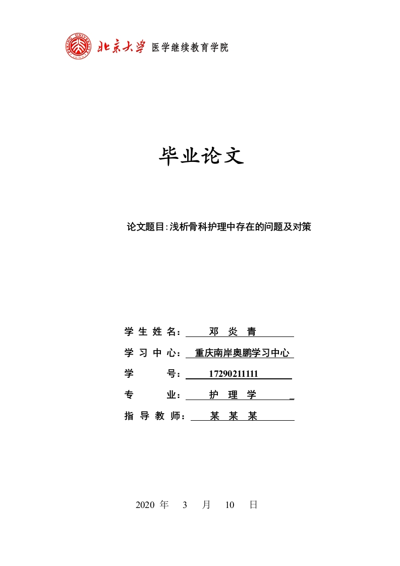 δ毕业论文论文题目:浅析骨科护理中存在的问题及对策学生姓名:邓炎青学习中心:重庆南岸奥鹏学习中心学号:17290211111专业:护理学指导教师:某某某2020年3月10日原创性声明本人郑重声明:所呈交的毕业(学位)论文,是本人在导师的指导下,独立进行研究工作所取得的成果。除文中已经注明引用的内容外,本论文不含任何其他个人或集体已经发表或撰写过的作品或成果。对本文的研究做出重要贡献的个人和集体,均已在文中以明确方式标明。本声明的法律结果由本人承担。论文作者签名:邓炎青日期:2020年3月10日浅析骨科护理中存在的问题及对策学生姓名:邓炎青学号:17290212056专业:护理学所在学习中心:奥鹏学习中心(重庆南岸)摘要:从骨科护理和患者多方面总结和探讨骨科护理中存在的问题和解决思路。使用文献研究法,文献研究法是根据一定的研究目的或课题,对骨科护理行业相关理论研究的文献进行调查和检索来获得骨科护理中医患双方详细资料,从而全面地、准确地了解掌握所要研究问题和现状的一种方法。从专科护士管理对策、医护关系纠纷防范和提高患者满意度、人性化护理和个性化延续护理等四个方面总结发展思路。希望骨科护理可以多元化共同发展,实现医患双方真正共赢的结果。关键词:专科护士,人性化护理,延续护理,骨科护理随着我国经济的不断发展,我国医疗行业发生了巨大的变化。公众对身体健康这个话题也越来越重视,骨科护理作为其中最重要的组成部分之一,在快速发展的同时也带了了问题。为了适应公众对护理行业的需求,护理团队规模的不断扩大,与此同时,出现了部分护理人员专业知识不足、能力不够全面等发面的问题。总体上满足了患者对骨科护理的需求,然而在部分环节存在的问题依然值得重视,部分患者的满意程度不高,引发患者和骨科医护人员间的误解。同时,患者不仅对住院期间的护理提出了需求,对出院期间的护理也更加重视,这对骨科护理人员提出新要求的同时,也带来了更大的机遇。通过对以上问题进行梳理,并提出建议,希望可以实现患者和医护工作者间双赢的局面。1过去研究中存在的问题骨科护理作为与患者接触最多的人,护士的言行举止会对患者产生很大的影响。病人对医患关系的印象也取决于护士的专业素质和服务意识等。现将骨科护理中存在的问题总体总结如下。1.1缺乏骨科专业知识