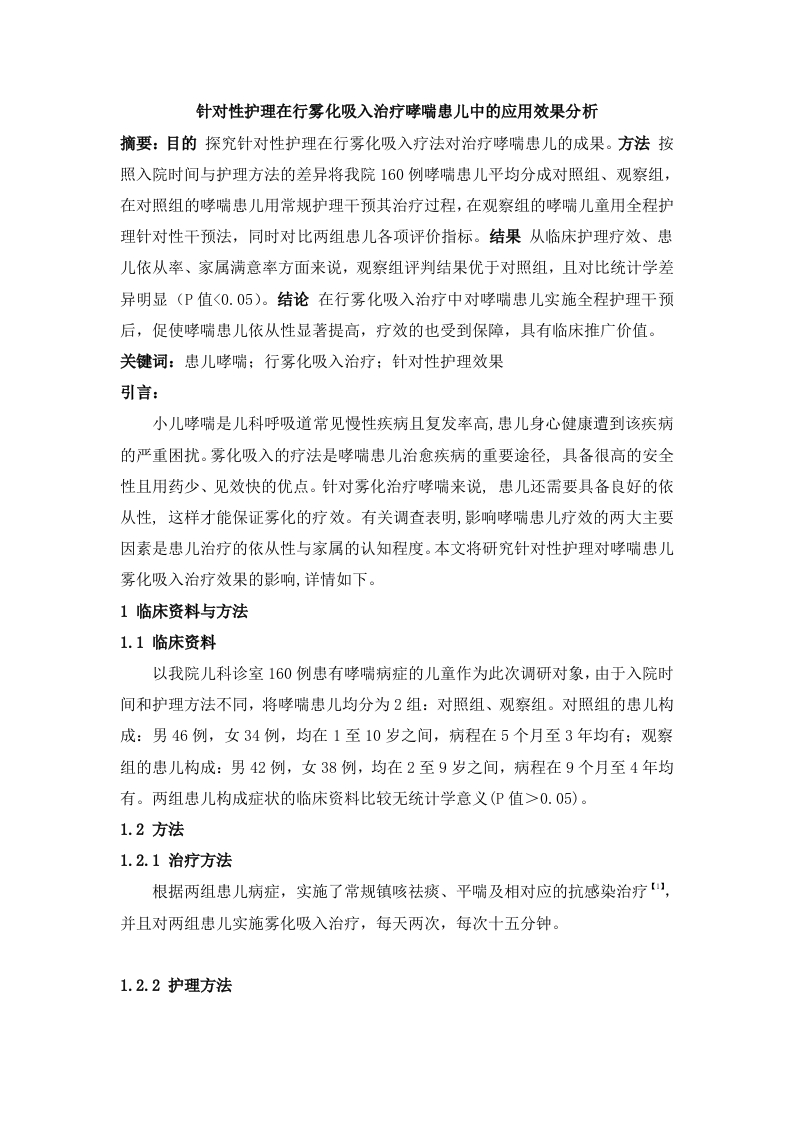 针对性护理在行雾化吸入治疗哮喘患儿中的应用效果分析摘要:目的探究针对性护理在行雾化吸入疗法对治疗哮喘患儿的成果。方法按照入院时间与护理方法的差异将我院160例哮喘患儿平均分成对照组、观察组,在对照组的哮喘患儿用常规护理干预其治疗过程,在观察组的哮喘儿童用全程护理针对性干预法,同时对比两组患儿各项评价指标。结果从临床护理疗效、患儿依从率、家属满意率方面来说,观察组评判结果优于对照组,且对比统计学差异明显(P值<0.05)。结论在行雾化吸入治疗中对哮喘患儿实施全程护理干预后,促使哮喘患儿依从性显著提高,疗效的也受到保障,具有临床推广价值。关键词:患儿哮喘:行雾化吸入治疗:针对性护理效果引言:小儿哮喘是儿科呼吸道常见慢性疾病且复发率高,患儿身心健康遭到该疾病的严重困扰。雾化吸入的疗法是哮喘患儿治愈疾病的重要途径,具备很高的安全性且用药少、见效快的优点。针对雾化治疗哮喘来说,患儿还需要具备良好的依从性,这样才能保证雾化的疗效。有关调查表明,影响哮喘患儿疗效的两大主要因素是患儿治疗的依从性与家属的认知程度。本文将研究针对性护理对哮喘患儿雾化吸入治疗效果的影响,详情如下。1临床资料与方法1.1临床资料以我院儿科诊室160例患有哮喘病症的儿童作为此次调研对象,由于入院时间和护理方法不同,将哮喘患儿均分为2组:对照组、观察组。对照组的患儿构成:男46例,女34例,均在1至10岁之间,病程在5个月至3年均有:观察组的患儿构成:男42例,女38例,均在2至9岁之间,病程在9个月至4年均有。两组患儿构成症状的临床资料比较无统计学意义(P值>0.05)。1.2方法1.2.1治疗方法根据两组患儿病症,实施了常规镇咳祛痰、平喘及相对应的抗感染治疗【,并且对两组患儿实施雾化吸入治疗,每天两次,每次十五分钟。1.2.2护理方法在雾化吸入治疗护理方面,对照组进行病状诊察以及对症护理等常规护理干预,而对于观察组实施不同的全程护理干预法,操作如下列阐述。(1)实施治疗前的护理医务人员在实施诊疗前,与患儿家属沟通思想达成一致,让家属在思想上深刻认识雾化吸入疗法的具体作用,使家属在治疗过程做好安抚患儿情绪的工作。此外,还应当使家属熟练掌握雾化治疗的操作要点。治疗前,应该采用相应促使提高患儿的依从性,例如为患儿做好心理建设和引导,通过患儿喜好的事物引导患儿勇敢面对治疗。此外,相关工作人员做好患儿病房清洁通风工作且避免人多吵杂,影响患儿心情。(2)治疗中的护理如果患儿在治疗中存在情绪激动、抗拒雾化治疗,可设法把患儿的注意力从治疗过程中转移出来,使其放松心态接受治疗,使患儿依从性得到改善。另外,根据患儿实际病情选择合理的雾化器,雾化吸入治疗正式开始前应当清除患儿呼吸道中存在的痰液,才能充分发挥药效。雾化吸入治疗所需的药物遵循现配现用原则,治疗时协助患儿采取侧卧或者半坐位姿势,指导患儿学会使用正确的呼吸法:密切关注患儿在雾化吸入治疗中出现的临床症状,做到对症护理。(3)治疗后的护理治疗完成后肯定患儿的积极表现,指导患儿及时漱口,使口腔保持清洁。根据医嘱按时按量给药,叮嘱家属监督患儿服药。在出院前,指导家属为患儿合理安排饮食,保证营养均衡摄入。最后遵照医嘱,告知家属后续在家注意事项,并定期入院复查恢复情况。1.3观察指标本次研究的评价指标有三个:临床治疗效果、护理总满意率、总依从率。判断临床效果的标准有三个。显效:病患儿接受治疗后,哮喘症征基本消失且1年未复发:有效:病患儿的哮喘病症有部分改善,表现为发病次数变少:无效:疗程完成后,病患儿的哮喘病情无好转,或者加重。1.4统计学分析统计分析软件为SPSS18.0,通过数据分析各项资料,最终得出P值,若该值<0.05,结果差异视作有统计学意义。2结果2.1疗效对比总有效率对比:观察组>对照组,通过x检验P<0.05,见表1。2.2依从性对比观察组依从率高于对照组,通过x2检验P<0.05,见表2表1两组患儿临床疗效比较组别例数显效有效无效总有效率对照组8034242228(70.00)观察组805420637(92.5)X5.05050.25085.54115.5411P值0.02460.61650.1860.186表2两组患儿依从性比较组别例数优良差依从率对照组8038264432(80.00)观察组805620438(95)4.17790.54924.11434.1143P值0.04100.45860.04250.04253讨论小儿哮喘是儿科呼吸道常见疾病,发病后,如果家属未及时带患儿就医治疗可能导致患儿生命危险。雾化是通过高速氧气流的作用使药液雾化,并经由呼吸道使药物进入支气管,通过对气道黏膜的直接作用,可以使患儿逐步呼吸通畅。因为哮喘是容易反复的慢性呼吸道疾病,采用雾化吸入治疗必须要患儿相互配合,治疗效果与患儿的依从性直接相关【。通过研究表明,哮喘患儿的家属对哮喘的认识程度与患儿的后续复发率息息相关,家属的重视程度也能加大患儿的依从性。结语:通过本文的研究得出,采取针对性护理是符合患儿护理需求的,它能使患儿和家属在雾化治疗期间的治疗体验得到改善,提高患儿依从性,提升治疗效果。