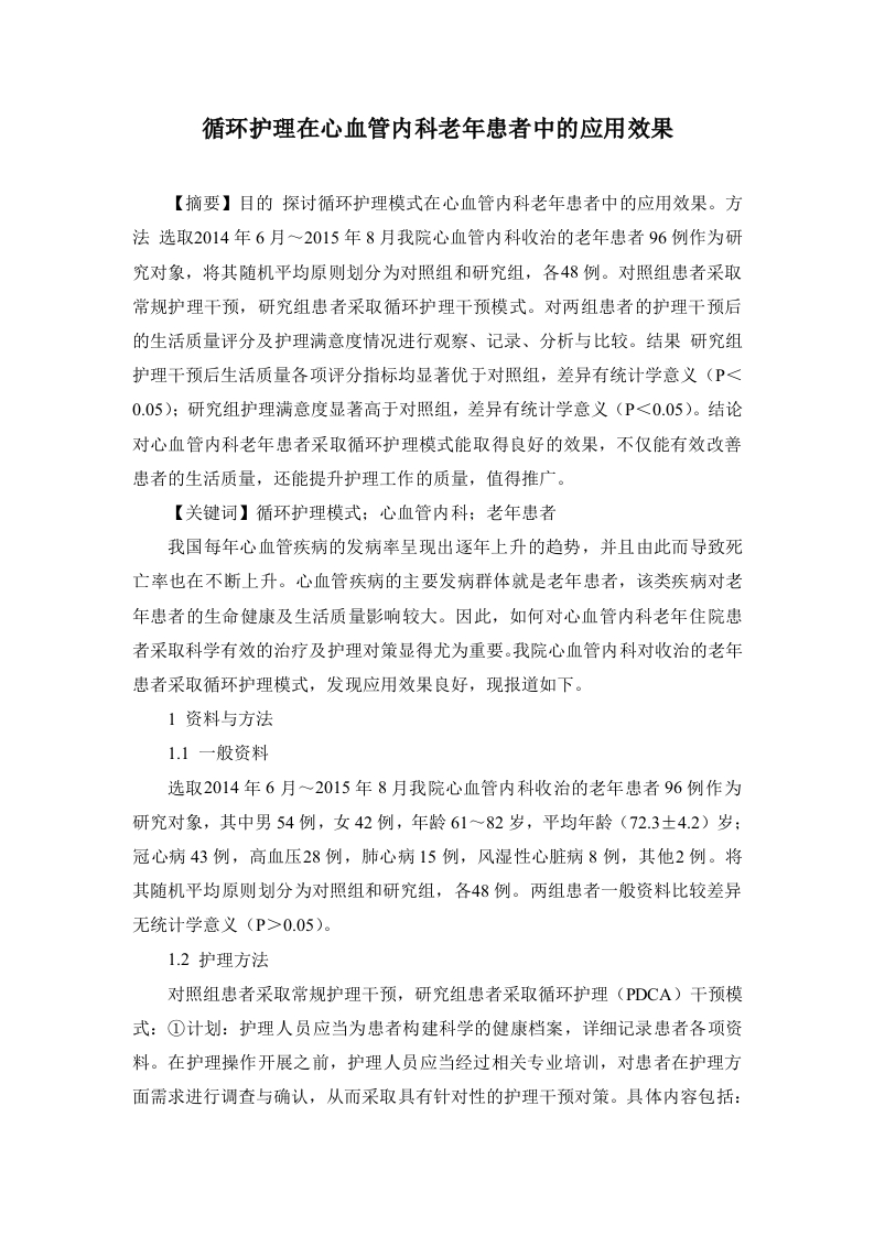 循环护理在心血管内科老年患者中的应用效果【摘要】目的探讨循环护理模式在心血管内科老年患者中的应用效果。方法选取2014年6月~2015年8月我院心血管内科收治的老年患者96例作为研究对象,将其随机平均原则划分为对照组和研究组,各48例。对照组患者采取常规护理干预,研究组患者采取循环护理干预模式。对两组患者的护理干预后的生活质量评分及护理满意度情况进行观察、记录、分析与比较。结果研究组护理干预后生活质量各项评分指标均显著优于对照组,差异有统计学意义(P<0.05):研究组护理满意度显著高于对照组,差异有统计学意义(P<0.05)。结论对心血管内科老年患者采取循环护理模式能取得良好的效果,不仅能有效改善患者的生活质量,还能提升护理工作的质量,值得推广。【关键词】循环护理模式:心血管内科;老年患者我国每年心血管疾病的发病率呈现出逐年上升的趋势,并且由此而导致死亡率也在不断上升。心血管疾病的主要发病群体就是老年患者,该类疾病对老年患者的生命健康及生活质量影响较大。因此,如何对心血管内科老年住院患者采取科学有效的治疗及护理对策显得尤为重要。我院心血管内科对收治的老年患者采取循环护理模式,发现应用效果良好,现报道如下。1资料与方法1.1一般资料选取2014年6月~2015年8月我院心血管内科收治的老年患者96例作为研究对象,其中男54例,女42例,年龄61一82岁,平均年龄(72.3±4.2)岁:冠心病43例,高血压28例,肺心病15例,风湿性心脏病8例,其他2例。将其随机平均原则划分为对照组和研究组,各48例。两组患者一般资料比较差异无统计学意义(P>0.05)。1.2护理方法对照组患者采取常规护理干预,研究组患者采取循环护理(PDCA)干预模式:①计划:护理人员应当为患者构建科学的健康档案,详细记录患者各项资料。在护理操作开展之前,护理人员应当经过相关专业培训,对患者在护理方面需求进行调查与确认,从而采取具有针对性的护理干预对策。具体内容包括:告知患者与疾病相关的知识,并且将药物治疗及相关注意事项告知给患者:鼓励患者家属,使其能够加强与患者之间的沟通交流,共同帮助患者消除心理障碍[2];指导患者形成科学的作息时间,并且制定科学的饮食方案,运动适当运动,提升身体各项机能。②执行:护理人员通过健康教育、面对面方式将健康知识手册发放给患者,从而对其在健康生活、心理护理及知识宣传等方面给予科学的指导。③检查:护士长在对病房进行巡查的时候,应当鼓励患者及家属积极提出问题,并且要和患者一起讨论、商量,从而针对其中存在的问题采取及时有效的解决措施[3)]。④处理:通过全面的检查能将患者对于心血管疾病方面知识了解较为薄弱的环节进行加强你了解,从而开展具有针对性的教育措施,通过信息反馈将问题发生的根本原因找出来,进一步采取优化与完善对策,从而使该类问题能够在新一轮的PDCA循环护理执行过程中得到充分有效的解决。对照组行常规护理,即密切关注患者病情,监测生命体征,开展饮食指导与运动指导,督促改正不良生活习惯,依据心理特点开展心理疏导等。观察组采用优质护理服务,具体如下:培养整体护理理念,体现以人为本在科学发展观中以人为本为核心内容,因此在心血管内科临床护理中为确保优质护理的顺利开展需培养护理人员以人为本理念。只有形成以人为本理念并坚持,才能够为优质护理服务的顺利有效开展扫清障碍。具体而言,即心血管内科患者从入住我院到办理出院手续全程都要享受到最优质的护理服务,包括饮食环节、用药指导、生活护理以及健康咨询等,确保患者身心所需得到最大限度满足。优质护理服务本质内容在于将患者作为中心,出发点为患者利益及需求,基于对其疾病充分关注开展系统与全面护理。由此可缓解患者临床症状,加快康复速度,减轻痛苦,确保护患关系得以良性维持发展,促使护士实现自我价值。强化护士培训,将责任包干制落实到位心血管内科特点患者病情严重、预后差与病程长,因此护理内容多,任务量大。然而受到护理人员数量的限制,导致工作量与护士数量比例失调。因此科室一定要制定严密与系统的培训方案,强化护士训练,由此提升工作效率,增强护理质量。一对一培训专科护理与基础护理,坚持结合个别指导与集体培训。护士长需定期考核与监督,确保科室所有护理人员具备深厚的理论知识储备与熟练操作相关护理技能,将自身护理服务水平自主提升,为实现优质护理目标贡献一己之力。实行护士责任包干制,将所有护士分成几个小组,使其明确自身职责与工作内容,小组长定期考核与评估组员工作状况,由此提升职业道德素养与责任心,促使本科室护理服务得到质的飞跃。身体护理相较于心理护理,身体护理处于基础层面,而身体护理中生活护理处于基础层面。心血管内科患者多为中老年人,本组疾病类型主要为高血压、冠心病、脑出血、风湿性心脏病以及心力衰竭等,因此一定要开展饮食指导,对盐分与脂肪摄取量予以控制。若患者高龄且难以咀嚼或牙齿松动,提供食物应尽量易消化、清淡且柔软,比如粥、汤等,需富含纤维。预防便秘,若出现便秘需应用缓泻剂。强化生活护理,同时提供药物指导,告知患者药物的必要性、用法用量以及可能出现的不良反应等,叮嘱患者一定要遵医嘱用药,不可擅自
