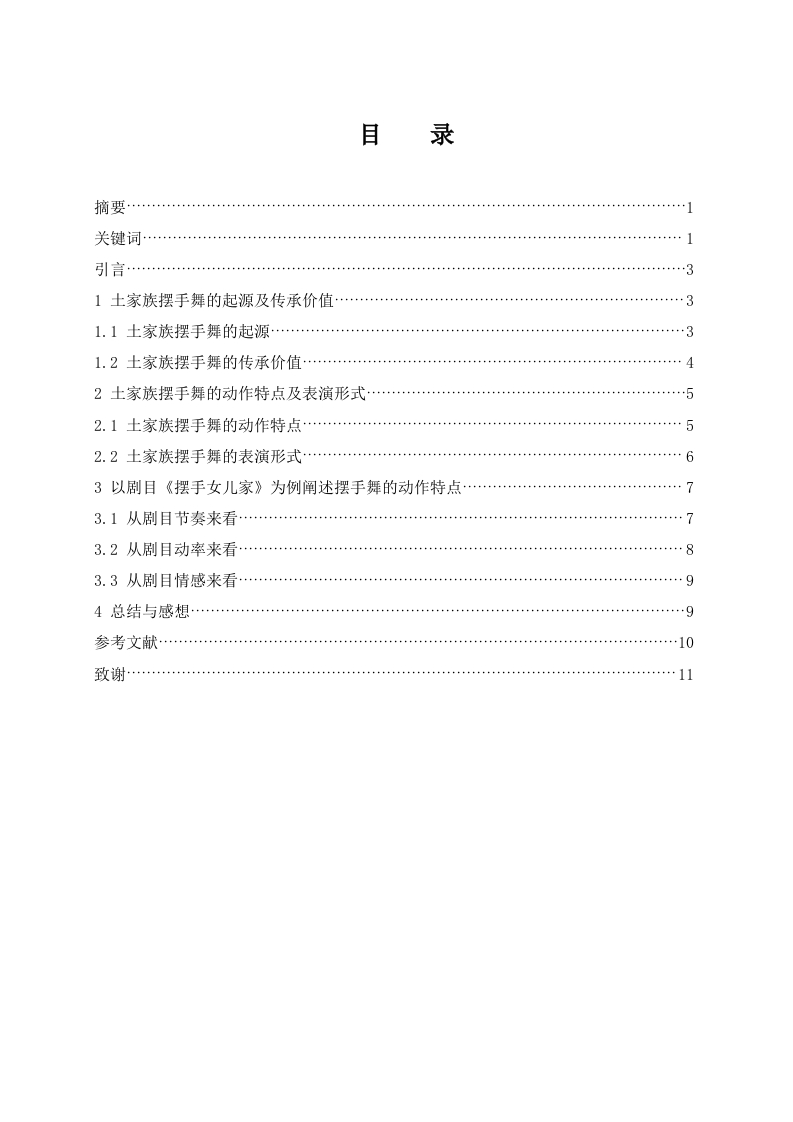 目录摘要…关键词…引言…】土家族摆手舞的起源及传承价值…31.1土家族摆手舞的起源……31.2土家族摆手舞的传承价值…2土家族摆手舞的动作特点及表演形式·2.1土家族摆手舞的动作特点…52.2土家族摆手舞的表演形式…63以剧目《摆手女儿家》为例阐述摆手舞的动作特点…73.1从剧目节奏来看……73.2从剧目动率来看……83.3从剧目情感来看…4总结与感想…9参考文献…致谢…浅谈土家族摆手舞的动作特点一以剧目《摆手女儿家》为例摘要:摆手舞是我国土家族一种具有重大历史性和文化意义的传统舞蹈,也是我们土家族的历史和文化的宝贵财富,因此我们一定要重视和加强对土家族摆手舞的研究保护与发展传承,这也正是我们促进土家少数民族生存与发展的必然需要,同时也适应和维护了中华民族传统文化的持续发展需要。土家族摆手舞作为我国土家族传统文化的一部分,象征着我国土家族传统文化的强大生命力和丰富的创造力,展示了我国土家族的独特文化风貌。摆手舞的动作简单易学,舞蹈的节奏鲜明,本文从我国土家族摆手舞的历史文化起源、动作的特点和其表演的形式以及剧目《摆手女儿家》四个方面分析了摆手舞的动作特点和了解土家文化。关键词:土家族:摆手舞:动作特点Talking about the Movement Characteristics of Tujia WavingDance-Taking the Play Waving Daughter's House as anExampleAbstract:The hand-waving dance is a traditional dance with great historical and culturalsignificance in China's Tujia nationality,and it is also a valuable asset of our history and culture.Therefore,we must pay attention to and strengthen the research protection and developmentinheritance of Tujia hand-waving dance This is also the inevitable need for us to promote thesurvival and development of the Tujia minority,while also adapting to and maintaining thesustainable development needs of the traditional culture of the Chinese nation.As a part of thetraditional culture of Tujia nationality in China,Tujia hand waving dance symbolizes the strongvitality and rich creativity of the traditional culture of Tujia nationality in China,and shows theunique cultural style of Tujia nationality in China.The movements of the hand-waving dance aresimple and easy to leam,and the rhythm of the dance is clear.This article analyzes thecharacteristics and movements of the hand-waving dance from four aspects:the historical andcultural origins of the hand-waving dance of the Tujia people in China,the characteristics of themovements and the forms of their performances,as well as the repertoire "House of the HandWaving Daughter"Understand Tujia culture.Key words:Tujia;wave dance;movement characteristics