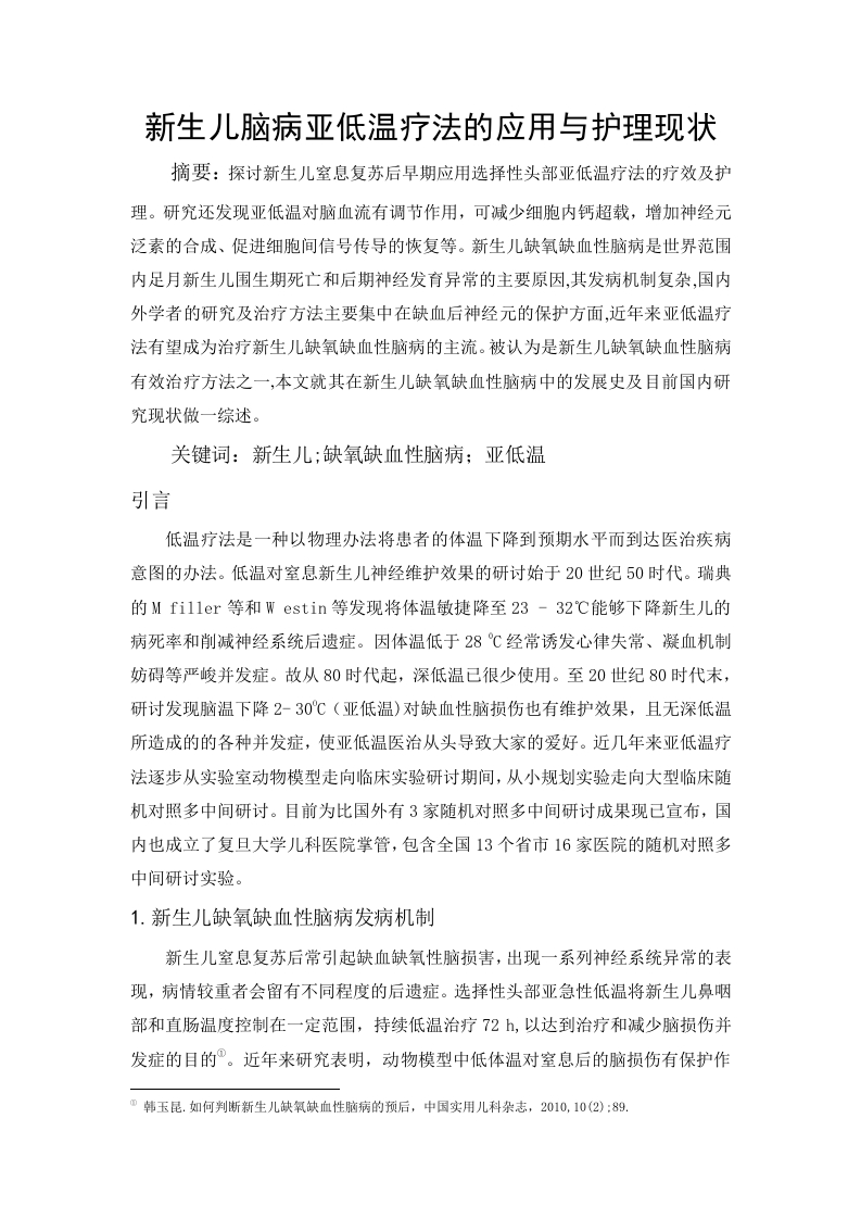 新生儿脑病亚低温疗法的应用与护理现状摘要:探讨新生儿室息复苏后早期应用选择性头部亚低温疗法的疗效及护理。研究还发现亚低温对脑血流有调节作用,可减少细胞内钙超载,增加神经元泛素的合成、促进细胞间信号传导的恢复等。新生儿缺氧缺血性脑病是世界范围内足月新生儿围生期死亡和后期神经发育异常的主要原因,其发病机制复杂,国内外学者的研究及治疗方法主要集中在缺血后神经元的保护方面,近年来亚低温疗法有望成为治疗新生儿缺氧缺血性脑病的主流。被认为是新生儿缺氧缺血性脑病有效治疗方法之一,本文就其在新生儿缺氧缺血性脑病中的发展史及目前国内研究现状做一综述。关键词:新生儿;缺氧缺血性脑病:亚低温引言低温疗法是一种以物理办法将患者的体温下降到预期水平而到达医治疾病意图的办法。低温对室息新生儿神经维护效果的研讨始于20世纪50时代。瑞典的Mfi11er等和W estin等发现将体温敏捷降至23-32℃能够下降新生儿的病死率和削减神经系统后遗症。因体温低于28℃经常诱发心律失常、凝血机制妨碍等严峻并发症。故从80时代起,深低温已很少使用。至20世纪80时代末,研讨发现脑温下降2-30℃(亚低温)对缺血性脑损伤也有维护效果,且无深低温所造成的的各种并发症,使亚低温医治从头导致大家的爱好。近几年来亚低温疗法逐步从实验室动物模型走向临床实验研讨期间,从小规划实验走向大型临床随机对照多中间研讨。目前为比国外有3家随机对照多中间研讨成果现已宣布,国内也成立了复旦大学儿科医院掌管,包含全国13个省市16家医院的随机对照多中间研讨实验。1.新生儿缺氧缺血性脑病发病机制新生儿室息复苏后常引起缺血缺氧性脑损害,出现一系列神经系统异常的表现,病情较重者会留有不同程度的后遗症。选择性头部亚急性低温将新生儿鼻咽部和直肠温度控制在一定范围,持续低温治疗72,以达到治疗和减少脑损伤并发症的目的。近年来研究表明,动物模型中低体温对室息后的脑损伤有保护作①韩玉昆.如何判断新生儿缺氧缺血性脑病的预后,中国实用儿科杂志,2010,10(2):89.用,体温每降低1℃脑部耗氧率就可减少5%®。足月儿由于缺氧缺血引起的新生儿脑病在发达国家发生率约为千分之一到千分之六,其中大部分患儿生后死亡,另有百分之二十五患儿儿童期遗留后遗症。生后早期神经系统检查异常是预测围产期脑损伤的重要手段,重度脑病,发生死亡、脑性瘫痪和智力落后的风险明显增高。足月新生儿诊断中重度缺氧缺血性脑病的标准包括:代谢性酸中毒:脐带血田小于7或者碱剩余超过一12mol/九④。早期即出现脑病症状。多系统的器官功能障碍。除外其他原因造成的脑损害,如外伤、凝血异常、代谢异常和遗传因素等。2.亚低温疗法作用机制亚低温也可以降低维持组织细胞生存所必需的最低限度的脑血流量,可能的病理生理及生化机制包括减少谷氨酸的释放,降低脑细胞的代谢,进而保存了高能磷酸盐:减少细胞内酸中毒和乳酸聚集,保存了细胞内抗氧化剂,抑制了蛋白激酶抑制剂,促进蛋白生成,降低白三烯的介成并且减少了血脑屏障的破坏和脑水肿及抑制了细胞调亡等。大量的动物实验和临床研究表明,在顿脑损伤时采用亚低温疗法可使增高的顿内压降低,有良好的脑保护作用:脑局部亚低温有可能延长脑梗死的溶栓时间窗。亚低温能降低脑组织代谢,延长因脑血流量不足所造成的脑损害的时间。亚低温治疗的机制是减慢脑细胞代谢,降低脑细胞消耗以及乳酸和细胞毒素的聚集,还可对抗脑细胞的凋亡。有文献资料报道成人脑外伤应用低温治疗成功的案例,朱亚平通过亚低温治疗重度室息患儿26例,治疗72h后26例患儿血清肌酸激酶同工酶和乳酸脱氢酶水平均明显低于对照组。亚低温治疗过程中的护理工作尤为重要,责任护士严密观察、规范操作可能会避免一些并发症的发生,如新生儿硬肿症、低血压、心律失常、呼吸暂停、少尿、结肠炎、出血等⑦。3.治疗方法⑧农绍汉.缺氧缺血性脑病的新生儿补钙前后脑细胞RBC内外钙的变化.中华儿科杂志,2011,33(6):342.①阁石.大剂量VitC及高压氧治疗新生儿缺氧缺血性脑病临床观察.中国实用儿科杂志,2012,10(4):225.①何颜霞.大剂量VitC在新生儿再灌注损伤中的应用.中国实用儿科杂志.2011,11(4):217.⑧张少丹.纳洛酮治疗新生儿缺氧缺血性脑病的临床研究.中国实用儿科杂志,2012,11(4):207,①张伟.高压氧治疗新生大鼠缺氧缺血性脑病疗效及毒副作用观察.中华儿科杂志,2011,34(6):330.⑦吴婉芳.新生儿缺氧缺血性脑病的动物实验研究.中国实用儿科杂志,2012,10(1):71.3.1选择性脑部降温法选择性头部亚低温疗法可以促进组织代谢等治疗与护理,是指婴儿出生后6h内置于远红外辐射床,控制环境温度22-24℃,床温30-32℃,婴儿头部安置降温帽,温度传感器探头置于婴儿鼻咽部和直肠,设定帽温为10℃,维持鼻咽部温度34℃,肛温(35.0士0.2)℃,维持婴儿体温34.5℃,持续头部亚低温治疗72h后解除降温帽,自然复温。3.2全身性亚低温法全身降温较易使脑温达预定的温度,但由于脑内温度梯度消失而可能存在较多潜在性的不良反应,故目前较少应用:全身性亚低温法可将体温下降2-5℃,通过无氧酵解、降低脑细胞耗能和脑细胞代谢,可延迟或阻断发生继发性能量衰竭,减少乳酸堆积和脑细胞ATP,从而使细胞凋亡的发生