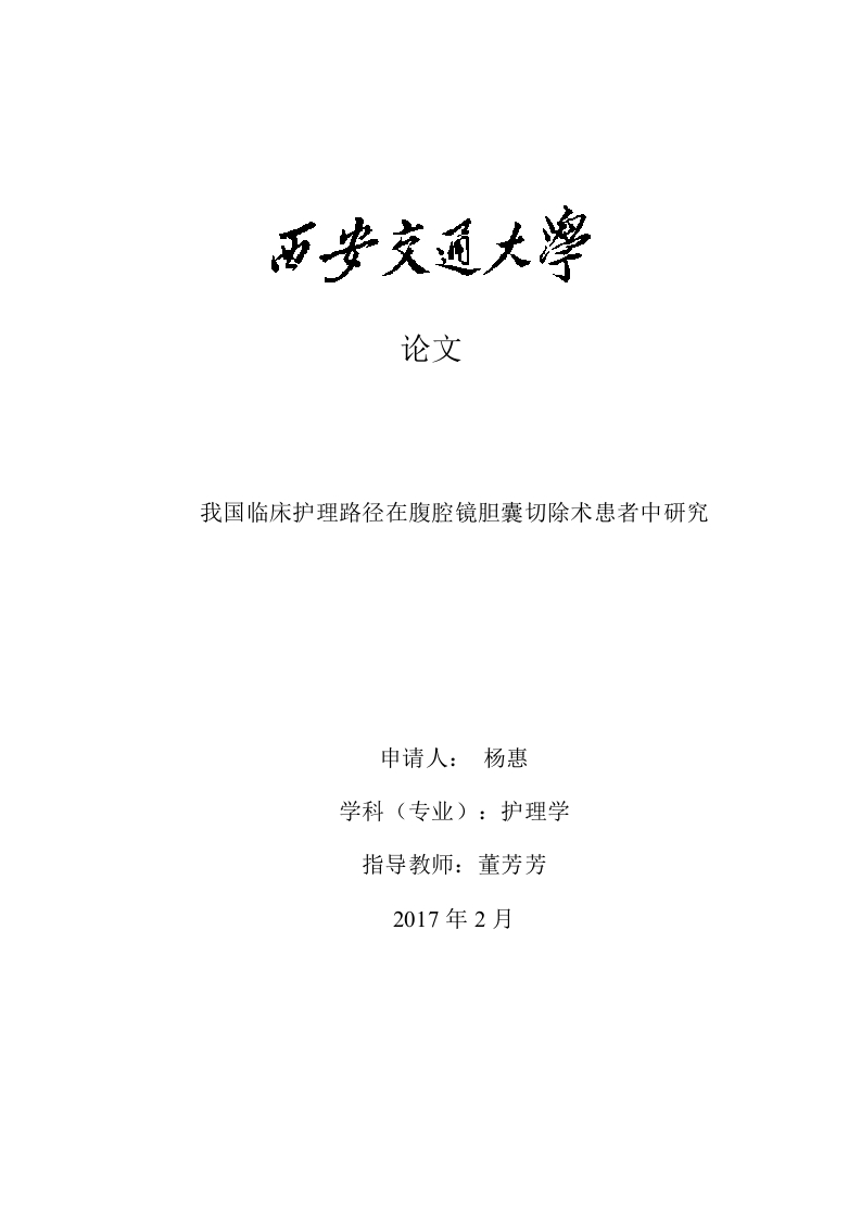 论文我国临床护理路径在腹腔镜胆囊切除术患者中研究申请人:杨惠指导教师:董芳芳2017年2月网络教育学院毕业设计(论文)任务书专业班级1503护理学层次专升本姓名杨惠学号201504268575一、毕业设计(论文)题目我国临床护理路径在腹腔镜胆囊切除手术患者中研究二、毕业设计(论文)工作自2011年09_月10日起至今三、毕业设计(论文)基本要求:1·选题应具有科学性、先进性、可行性及实践性:2.前景及意义清楚展现:3.摘要部分应高度概括全文,要方法正确,目的明确,目标清楚。结果和结论紧扣主题。约400字左右。4,关键词定义明确:5.文献查阅充分,书写有一定的逻辑性:此部分内容约3000字左右。6.设计、抽样、方法及技术路线清楚、符合要求:7,结果展现正确,应用相应的统计方法:8,讨论围绕结果,应用相应的参考文献:此部分内容约1500字左右。9.推论及建议不能超出研究范围:10.论文基本字数5000字左右,书写符合学校的写作要求。指导教师: