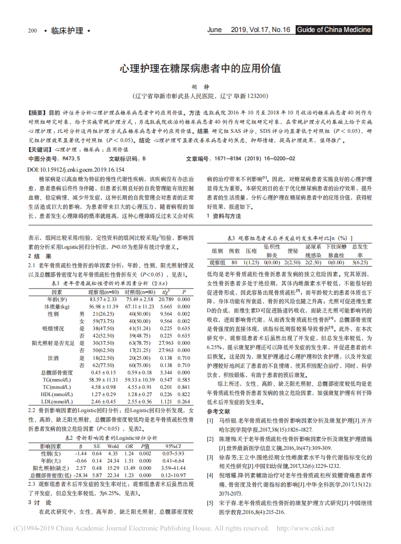 200·临床护理·June 2019,Vol.17,No.16 Guide of China Medicine心理护理在糖尿病患者中的应用价值胡静(辽宁省阜新市彰武县人民医院,辽宁卓新123200)【摘要】目的评估并分析心理护理在糖尿病惠者中的应用价值。方法选取我院2016年10月至2018年10月收治的梅尿病患者40例作为心理护理;比对分析这两组护理方式在梅尿病惠者中的应用价值。结果研究组SAS评分、SDS评分均显著低于对照组(P<0.05),研究组护理效果显著优于对照组(P<0.05)。结论心理护理可显著改善尿病惠者的焦虑、抑郁情绪,提高护理效果,值得推广。中图分类号:473.5文献标识码:B文章编号:1671-8194(2019)16-0200-02D0:10.15912f.cnki.gocm.2019.16.154糖尿病是以高血糖为特征的慢性代谢性疾病,该疾病没有办法治病的治疗带来不利影响四。因此,对糖尿病忠者实施良好的心理护理愈,患者忠病后将终身伴随,但忠者长期良好的自我管理能有效控制显得尤为重要。本研究的目的在于优化糖尿病患者的治疗效果,提升血糖、稳定病情、减少并发症,这种长期的自我管理会对患者的正常患者的生活质量,分析心理护理在糖尿病患者中的应用价值,获得较生活造成巨大的影响,为患者带来巨大的心理压力,随着病程的加好效果,报道如下。长,患者发生心理障碍的概率就越高,这种心理障碍反过来又会对疾1资料与方法表示,组间比较采用检验,定性资料的组间比较采用检验,影响因表3观察组惠者术后并发症的发生率对比[(%)]素的分析采用Logistic回归分析法,P<0.05为差异有统计学意义。坠积性泌尿系下肢深静总发生组别例数压疮便秘2结果肺炎统感染脉血栓率2】老年骨质疏松性骨折的单因素分析:年龄、性别、阳光照射情况观察组801(1.25)0(0.00)2(2.50)22.50)00.00)5(625以及总髋部骨密度与老年骨质疏松性骨折有关(P<0.05),见表1。低均是老年骨质硫松性骨折患者发病的独立危险因素。究其原因,女性骨折患者多处于绝经期,其体内雌激素水平较低,不能很好的因素观察组(n=80)对照组(n=80)t促进骨形成,因此容易出现骨质硫松同,而年龄较大的患者体质也下年龄(岁)83.57±2.3375.49±2.5820.7890.000降,身体功能有所衰退,骨折的风险也随之升高;光照可促进维生素体质量kg)56.98±113967.11±11.235.6650.000D的合成,而维生素D可促进肠道钙吸收,而缺乏光照可能影响钙的性别男2126.25)4050.00)9.5640.002女5973.7540(50.00)9.5640.002吸烟情况38(47.50)41(51.24)0.2250.635是骨强度的直接体现,该指标低则很较易导致骨折句。此外,在本次42(52.50)3948.75)0.2250.635研究中,观察组患者术后虽然出现了并发症,但总发生率较低,为阳光照射是否充足是3037.50)6378.75)27.9630.000否50(62.50)1721.25)27.9630.000625%,提示康复护理还可以降低并发症的发生率,并促进患者的术饮酒是1822.50)2025.00)0.1380.710后恢复。这是因为,康复护理通过心理护理和饮食护理,以及并发症6277.50)6075.00)0.1380.710护理较好地纠正了患者的不良情绪,使其积极配合治疗,同时,科学总髋部骨密度0.45±0.150.59±0.185.3440.000饮食,积极锻炼,有助于患者的预后康复。TG(mmol/L)58.39±113159.33±10.390.5470.585TC(mmol/L)4.58±0.984.55±0.910.2010.841综上所述,女性、高龄、缺乏阳光照射、总腕部密度较低均是老HDL(mmol/L)127±0.291.28±0.270.2260.822年骨质疏松性骨折忠者发病的独立危险因素,加强康复护理有利于降LDL(mmol/L)246±0.452.55±0.561.1210.264低术后并发症的发生率。2.2骨折影响因素的Logistic回归分析:经Logistic回归分析发现,女参考文献性、高龄、缺乏阳光照射、总髋部骨密度较低均是老年骨质疏松性骨[山马桥银老年骨质疏松性骨折影响因素分析及康复护理)齐齐折患者发病的独立危险因素(P<0.05),见表2。哈尔医学院学报,2017,38(15):826-1827.表2骨折影响因素的L0 gistic回归分析[2]陈建梅关于老年骨质疏松性骨折影响因素分析及康复护理措施影响因素B SE Wold OR P值95%C[世界最新医学信息文摘,2016,16(47):309-309性别(女)-1.440.644.351.240.0020.075.93年龄大)-0.660.1424341.510.0000.416.64[3)徐春芳,王立中.围绝经期女性雌激素水平与骨代谢指标变化的阳光照射(缺乏)2.570.48152913.490.0003.5941.44相关性研究],中国妇呦保健,2017,32(6):229-1232.总腕部骨密度(低)-28345.8722.341.230.0000.1210.97[円倪增耀降钙素辅助治疗对老年性骨质疏松所致腰背痛患者疼23观察组忠者术后并发症的发生率对比:观察组患者术后虽然出现痛、骨密度及骨代谢指标的影响[.中华全科医学,2017,15(12):了并发症,但总发生率较低,为625%,见表3。2071-2073.3讨论「宋子春老年骨质疏松性骨折的康复护理方式研究.中国继续在此次研究中,女性、高年龄、缺乏阳光照射、总髋部密度较医学教育,2016,8(4215-216.(C)1994-2019 China Academic Journal Electronic Publishing House.All rights reserved.http://www.cnki.net中国医药指南2019年6月第17卷第16期·临床护理·2011.1一般资料:选取我院2016年10月至2018年10月收治的糖尿病忠者40例作为对照组,其中男性22例,女性18例:年龄32~75岁,平均组别例数SAS(分)SDS(分)(48.73士6.52)岁。另选取我院同期收治的糖尿病患者40例作为研究对照组4053.26±7.3457.66±7.53组,其中男性23例,女性17例;年龄33~76岁,平均(49.75±6.58)研究组4042.75±6.5245.45±6.47岁。纳入标准:患者均经过明确的诊断;患者无严重并发症,比如:4.6723.452P0.050.05严重器官障碍;挂除标准:有焦虑症、抑郁症等精神疾病、有认知障碍、有脑血管意外等疾病、有老年痴呆症等。两组资料间差异无统计组别例数空腹血糖(mmol/L.)餐