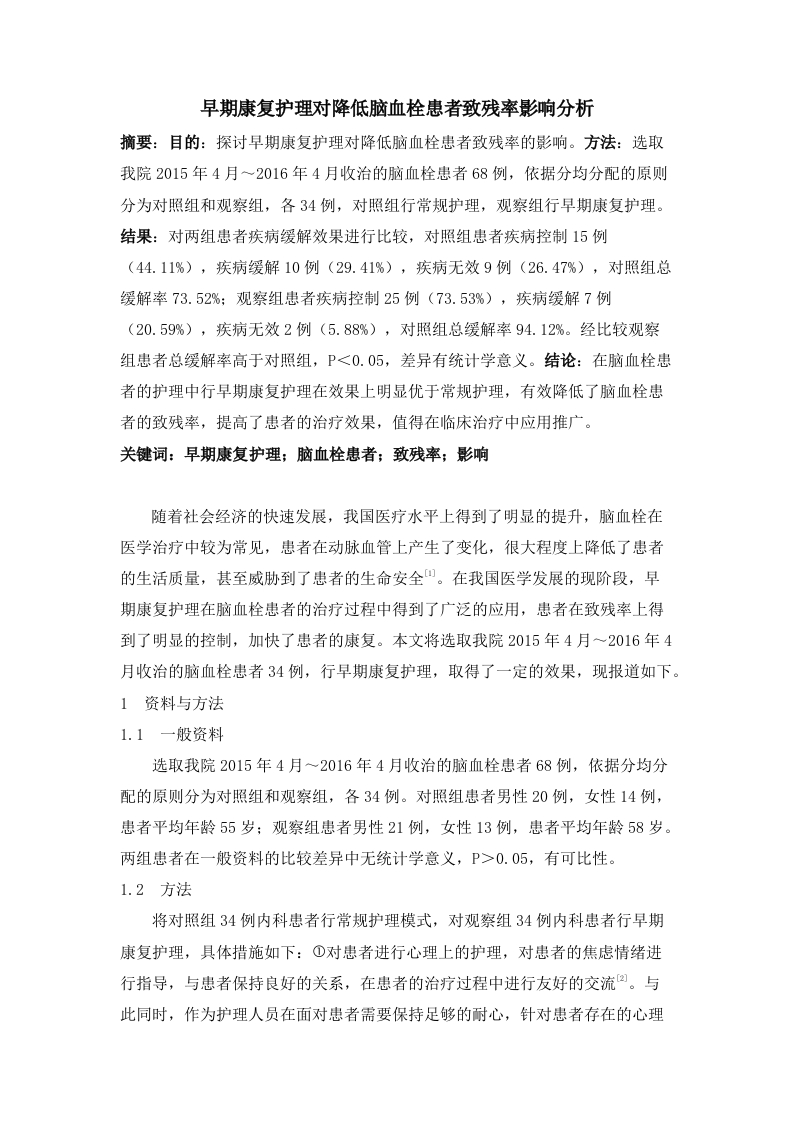 早期康复护理对降低脑血栓患者致残率影响分析摘要:目的:探讨早期康复护理对降低脑血栓患者致残率的影响。方法:选取我院2015年4月~2016年4月收治的脑血栓患者68例,依据分均分配的原则分为对照组和观察组,各34例,对照组行常规护理,观察组行早期康复护理。结果:对两组患者疾病缓解效果进行比较,对照组患者疾病控制15例(44.11%),疾病缓解10例(29.41%),疾病无效9例(26.47%),对照组总缓解率73.52%:观察组患者疾病控制25例(73.53%),疾病缓解7例(20.59%),疾病无效2例(5.88%),对照组总缓解率94.12%。经比较观察组患者总缓解率高于对照组,P<0.05,差异有统计学意义。结论:在脑血栓患者的护理中行早期康复护理在效果上明显优于常规护理,有效降低了脑血栓患者的致残率,提高了患者的治疗效果,值得在临床治疗中应用推广。关键词:早期康复护理;脑血栓患者;致残率;影响随着社会经济的快速发展,我国医疗水平上得到了明显的提升,脑血栓在医学治疗中较为常见,患者在动脉血管上产生了变化,很大程度上降低了患者的生活质量,甚至威胁到了患者的生命安全。在我国医学发展的现阶段,早期康复护理在脑血栓患者的治疗过程中得到了广泛的应用,患者在致残率上得到了明显的控制,加快了患者的康复。本文将选取我院2015年4月~2016年4月收治的脑血栓患者34例,行早期康复护理,取得了一定的效果,现报道如下。1资料与方法1.1一般资料选取我院2015年4月~2016年4月收治的脑血栓患者68例,依据分均分配的原则分为对照组和观察组,各34例。对照组患者男性20例,女性14例,患者平均年龄55岁:观察组患者男性21例,女性13例,患者平均年龄58岁。两组患者在一般资料的比较差异中无统计学意义,P>0.05,有可比性。1.2方法将对照组34例内科患者行常规护理模式,对观察组34例内科患者行早期康复护理,具体措施如下:①对患者进行心理上的护理,对患者的焦虑情绪进行指导,与患者保持良好的关系,在患者的治疗过程中进行友好的交流四。与此同时,作为护理人员在面对患者需要保持足够的耐心,针对患者存在的心理问题进行合理开导,避免患者在临床治疗的过程中存在心理疾病,从根本上提升脑血栓患者的生活质量。此外,护理人员不但对患者进行疾病知识的讲解,同时还需要向患者家属进行心理上的开导,让患者家属经常与患者进行沟通交流,让患者在相对轻松的环境下接受治疗。②对患者进行体位护理,引导患者保持正确的治疗体位,在治疗的过程中进行体位的更换,左侧位、平卧位以及右侧位是脑血栓患者主要治疗体位。护理人员需要定期对患者进行体位变换,防止患者在临床治疗中产生褥疮等皮肤疾病。③引导患者进行康复训练,脑血栓患者在临床治疗过程中,可能存在肢体方面的问题,作为护理人员需要引导患者进行适当的体能训练,在日常生活中形成良好的习惯。一旦患者能够进行下床行走,护理人员需要鼓励患者进行大跨度行走,在患者身体素质允许的情况下,引导患者进行上下楼梯的攀爬,把握好对患者的体能训练的时间,尤其在首次运动中需要严格控制好训练的强度。护理人员在对患者进行训练培养的时候结合患者身体具体情况来制定训练的方案,不断提升患者的身体素质。1.3观察指标观察两组患者在临床护理中的疾病缓解情况,对两组患者在缓解率上进行比较,缓解情况分为:控制、缓解、无效。1.4统计学方法采用统计学软件SPSS16.0进行文本数据分析与处理,计数资料行卡方检验,P<0.05表示差异有统计学意义。2结果对两组患者疾病缓解效果进行比较,对照组患者疾病控制15例(44.11%),疾病缓解10例(29.41%),疾病无效9例(26.47%),对照组总缓解率73.52%:观察组患者疾病控制25例(73.53%),疾病缓解7例(20.59%),疾病无效2例(5.88%),对照组总缓解率94.12%。经比较观察组患者总缓解率高于对照组,P<0.05,差异有统计学意义。3讨论在临床治疗过程中脑血栓是一种常见疾病,患者在治疗过程中容易出现肢体瘫痪的现象,老年人是脑血栓发病的主要人群,给患者的日常生活产生了严重的负面影响。脑血栓患者在治疗过程中通常会出现情绪焦虑,不但病情难以得到缓解,反而会出现病情加重的想象。因此,在临床治疗过程中需要加强对脑血栓患者护理干预。早期康复护理在脑血栓患者的治疗过程中的广泛应用,很大程度上提升了患者的生活质量,对患者进行心理、运动、饮食等方面的护理引导,患者在治疗的过程中提高了自身的身体素质,同时也提高了对临床护理人员的工作认同总而言之,早期康复护理在脑血栓患者的治疗过程中,能够有效缓解患者的病情,降低患者因脑血栓疾病出现致残的现象,从根本上提高了脑血栓患者的生存质量。早期康复护理在治疗效果上明显优于常规护理,通过早期康复的护理,使得护理人员与患者建立了良好的关系,能够提高护理人员的工作积极性,从而提升整个临床护理的质量,降低脑血栓疾病致残率。参考文献:[1]卫芳芳.观察急性脑血栓早期康复护理对降低脑血栓患者致残率的效果[J].临床医药文献电子杂志,2015,20:4191+4194[2]刘巧儿,曹全英,陈妙玲,黎凤珍,张英仪.早期康复护理模式在脑卒中偏瘫患者中的应用[J].中国医学创新,2015,28:79-82[3]胡兰芳.急性脑血栓早期康复护理干预对降低脑血栓患者致残率的影响[J门.中国实用神经疾病杂志,2016,08:138-139[4]崔芳英.急性脑血栓早期康复护理对降低脑血