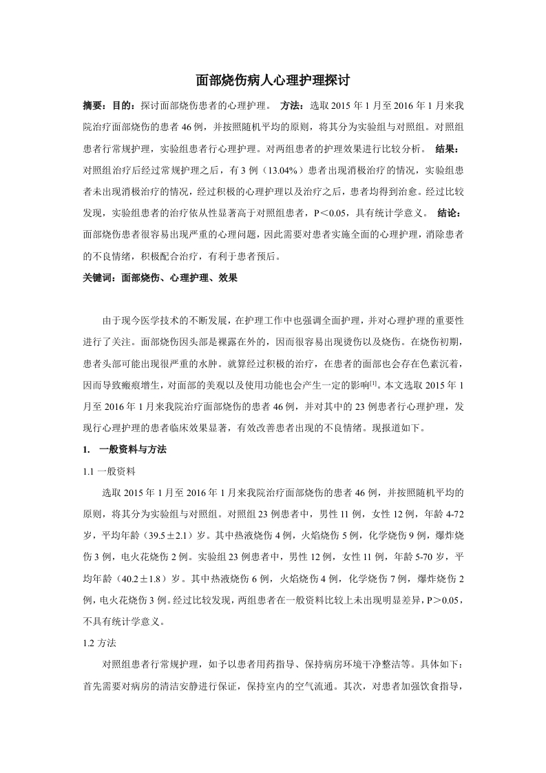 面部烧伤病人心理护理探讨摘要:目的:探讨面部烧伤患者的心理护理。方法:选取2015年1月至2016年1月来我院治疗面部烧伤的患者46例,并按照随机平均的原则,将其分为实验组与对照组。对照组患者行常规护理,实验组患者行心理护理。对两组患者的护理效果进行比较分析。结果:对照组治疗后经过常规护理之后,有3例(13.04%)患者出现消极治疗的情况,实验组患者未出现消极治疗的情况,经过积极的心理护理以及治疗之后,患者均得到治愈。经过比较发现,实验组患者的治疗依从性显著高于对照组患者,P<0.05,具有统计学意义。结论:面部烧伤患者很容易出现严重的心理问题,因此需要对患者实施全面的心理护理,消除患者的不良情绪,积极配合治疗,有利于患者预后。关键词:面部烧伤、心理护理、效果由于现今医学技术的不断发展,在护理工作中也强调全面护理,并对心理护理的重要性进行了关注。面部烧伤因头部是裸露在外的,因而很容易出现烫伤以及烧伤。在烧伤初期,患者头部可能出现很严重的水肿。就算经过积极的治疗,在患者的面部也会存在色素沉着,因而导致瘢痕增生,对面部的美观以及使用功能也会产生一定的影响。本文选取2015年1月至2016年1月来我院治疗面部烧伤的患者46例,并对其中的23例患者行心理护理,发现行心理护理的患者临床效果显著,有效改善患者出现的不良情绪。现报道如下。1.一般资料与方法1.1一般资料选取2015年1月至2016年1月来我院治疗面部烧伤的患者46例,并按照随机平均的原则,将其分为实验组与对照组。对照组23例患者中,男性11例,女性12例,年龄472岁,平均年龄(39.5±2.1)岁。其中热液烧伤4例,火焰烧伤5例,化学烧伤9例,爆炸烧伤3例,电火花烧伤2例。实验组23例患者中,男性12例,女性11例,年龄5-70岁,平均年龄(40.2±1.8)岁。其中热液烧伤6例,火焰烧伤4例,化学烧伤7例,爆炸烧伤2例,电火花烧伤3例。经过比较发现,两组患者在一般资料比较上未出现明显差异,P>0.05,不具有统计学意义。1.2方法对照组患者行常规护理,如予以患者用药指导、保持病房环境干净整洁等。具体如下:首先需要对病房的清洁安静进行保证,保持室内的空气流通。其次,对患者加强饮食指导,注重患者在治疗以及康复期间的营养补充。在治疗早期,需要引导患者服用一些营养价值高的流质饮食,后期注意补充一些高蛋白的食物。最后,对患者的生命体征进行严密检测,若患者在这一阶段出现刺激性咳嗽,就需要做好气管插管的相关准备。另外,还应该对创面清洁进行保证,早期治疗的时候采用暴露治疗的方式,对创面进行充分暴露,有利于创面干燥结痂,帮助患者恢复☒。实验组患者在常规护理的基础上加用心理护理。具体方法如下:很多的烧伤事件都是突发的,且面部又是人体中的特殊部位,因此,患者烧伤后很容易产生较大的负面情绪,如紧张、焦虑、孤独、悲观等,对于患者之后的治疗将会产生十分不利的效果。针对患者出现的一系列不良情绪,护理人员就需要采取各种方式帮助患者走出阴霾,树立健康积极的心理状态,增强战胜疾病的信息,从而保持患者的身心健康。护理人员在日常应该对患者的诉求进行关注,并耐心听取,主动询问患者出现的不良感受,并向患者讲解康复治疗时所需要注意的事项,帮助患者以一个积极的心态面对治疗,提高治疗依从性。患者面部烧伤之后,很有可能出现孤独的心理,这就需要护理人员积极与患者进行交流,并告知患者在日常生活中要经常与患者进行交流,鼓励患者走出创伤,积极参与室外活动)。另外,也需要积极鼓励患者进行情感的表达,将自身的真实想法进行表达,从而让护理人员以及家属对于其内心的情绪状态进行把握,针对其中存在的不良情绪采取针对性的活动,帮助患者建立信心,劝导患者将内心的苦闷表达出来,从而减少因不良情绪对患者的影响啊。13统计学方法采用统计学软件SPSS16.0进行文本数据分析与处理,计数资料行卡方检验,计量资料以(x±s)表示,行t检验,P<0.05,表明差异有统计学意义。2.结果本组研究中共46例患者,其中对照组23例,治疗后经过常规护理之后,有3例(13.04%)患者出现消极治疗的情况,实验组患者未出现消极治疗的情况,经过积极的心理护理以及治疗之后,患者均得到治愈。经过比较发现,实验组患者的治疗依从性显著高于对照组患者,P<0.05,具有统计学意义。3.讨论综上所述,由于面部烧伤的特殊部位,而头部又是长期裸露在外面的,因此,很多面部烧伤患者在接受到积极的治疗之后,也很有可能出现较为严重的瘢痕,甚至其面部也会存在一些功能障碍,对患者面部的美观性以及功能性都造成很大的不利影响。尤其是现阶段,社会上对美貌的追求,更容易使得面部烧伤患者存在较多的心理障碍,对患者的之后康复治疗以及正常生活都产生影响。另外,面部烧伤患者存在的一些问题也容易导致患者的治疗受到约束,降低患者的治疗依从性,不利于患者预后阿。在这种情况下,就需要针对患者存在的心理问题采取积极的心理护理措施,消除患者出现的不良心理情绪,帮助患者积极面对治疗,树立继续生活的信心。并且,在现今医疗技术发展的时期,人们对于医疗服务水平的要求也越来越高,因此,对患者实施积极的心理护理也是开展护理工作的必然趋势。参考文献:[1]何秀芬.烧伤病人的心理护理).中外医疗,2012,01:146.[2]崔凤瑞,王淑杰.浅谈面部