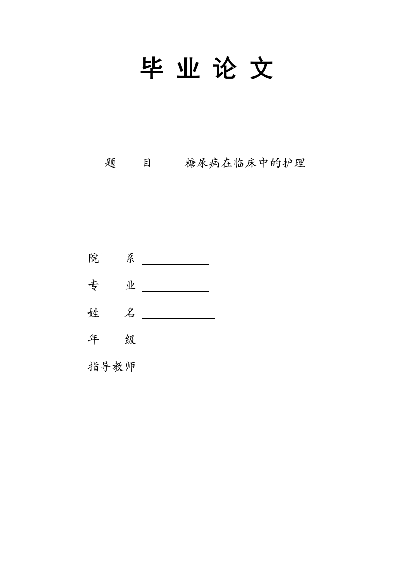 毕业论文题目糖尿病在临床中的护理院系专业姓名年级指导教师摘要糖尿病是一组由遗传和环境因素、相互作用使胰岛素分泌绝对成相对不足,而引起的糖、脂肪、蛋白质、水及电解质等一系列代谢素乱的临床综合症,可引起多系统损害,导致眼、肾、神经、心脏血管等组织的慢性进行病变,患者可出现多尿、口渴、多饮、易饥多食以及消瘦体重减轻、乏力等典型的“三多一少”等症状,严重者可发生酮症酸中毒及昏迷或非酮症酸高渗综合症。但不少病便长期可无“三多一少”症状,甚至关键词:糖尿病主要表现护理健康教育AbstractDiabetes is a group of genetic and environmental factors,the interaction of insulin secretion is absolutelyrelative to the relative lack of sugar,fat,protein,water and electrolytes caused by a series of metabolic disorders ofthe clinical syndrome,can cause multi-system damage,leading to eye,Kidney,nerve,heart and blood vessels andother tissues of chronic lesions,the patient may have polyuria,thirst,drink,easy to eat more hunger and weight lossweight loss,fatigue and other typical "more than a little"and other symptoms,Can occur ketoacidosis and coma ornonketotic acid hyperosmolar syndrome.But many diseases will be no long-term "more than a little"symptoms,andeven serious organ damage diagnosis of the disease.Key words:diabetes mellitus,main manifestation,nursing,health education