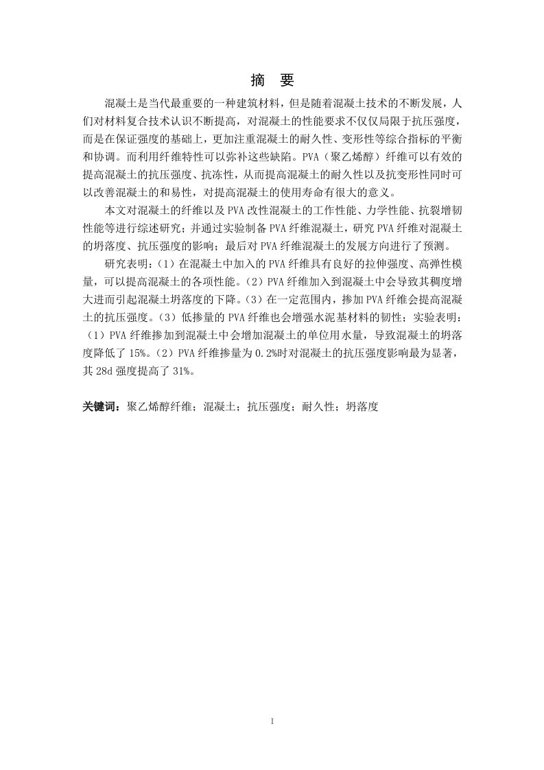摘要混凝土是当代最重要的一种建筑材料,但是随着混凝土技术的不断发展,人们对材料复合技术认识不断提高,对混凝土的性能要求不仅仅局限于抗压强度,而是在保证强度的基础上,更加注重混凝土的耐久性、变形性等综合指标的平衡和协调。而利用纤维特性可以弥补这些缺陷。PVA(聚乙烯醇)纤维可以有效的提高混凝土的抗压强度、抗冻性,从而提高混凝土的耐久性以及抗变形性同时可以改善混凝土的和易性,对提高混凝土的使用寿命有很大的意义。本文对混凝土的纤维以及PVA改性混凝土的工作性能、力学性能、抗裂增韧性能等进行综述研究:并通过实验制备PVA纤维混凝土,研究PVA纤维对混凝土的坍落度、抗压强度的影响:最后对PVA纤维混凝土的发展方向进行了预测。研究表明:(1)在混凝土中加入的PVA纤维具有良好的拉伸强度、高弹性模量,可以提高混凝土的各项性能。(2)PVA纤维加入到混凝土中会导致其稠度增大进而引起混凝土坍落度的下降。(3)在一定范围内,掺加PVA纤维会提高混凝土的抗压强度。(3)低摻量的PVA纤维也会增强水泥基材料的韧性:实验表明:(1)PVA纤维摻加到混凝土中会增加混凝土的单位用水量,导致混凝土的坍落度降低了15%。(2)PVA纤维摻量为0.2%时对混凝土的抗压强度影响最为显著,其28d强度提高了31%。关键词:聚乙烯醇纤维:混凝土;抗压强度:耐久性:坍落度第一章绪论1.1PVA纤维的概述德国化学家Herrmann和Haehnel于1924年合成了聚乙烯醇,之后,他们用水溶液通过干法纺丝技术制备聚乙烯醇纤维。干纺工艺相对复杂,所用的聚乙烯醇与普通湿法纺丝所用的相同,高浓度原液在从喷丝头喷出之前被连续加热、挤出、溶解、过滤和脱泡。纤维被凝固剂如热空气凝固,并被成形和拉伸以获得高强度纤维·。因为聚乙烯醇纤维在性能上与棉花非常相似,但是聚乙烯醇纤维在耐磨性、耐晒性、耐腐蚀性和力学性能上要比棉花好得多,而且其密度比棉花低,所以中日两国当时开始研发聚乙烯醇纤维的重要目的是将其应用于民用工业,在当时发展聚乙烯醇纤维的动力是解决国内服装问题。然而,由于聚酯理论,棉纤维等性能更优异,随着时间的发展,聚乙烯醇纤维逐渐被取代经过不断的改进和新工艺的生产,聚乙烯醇纤维受到越来越多的关注,日本科拉公司利用新的纺纱技术成功研发了高强聚乙烯醇纤维。在2000年左右,聚乙烯醇纤维的总产量已经达到了2.5万吨。日本生产的K-Ⅱ高强高模聚乙烯醇纤维的强度较于之前的聚乙烯醇强度有了很大的提升。目前,它已成为第二大品种的有机高强度纤维。作为一种新型纤维,PVA纤维具有很多优点:(1)良好的拉伸强度(一般为1600-2500MPa),高弹性模量和良好的机械性能,可提高基材的冲击强度和韧性:(2)亲水性好,可均匀分散在水泥基材料中:(3)耐酸碱性好,与水泥相容性好:(4)高强PVA纤维与水泥之间具有良好的界面结合力,因为PVA纤维的非圆形和不规则截面有利于增加纤维与水泥之间的结合面:PVA的分子结构为(CH2-CHOH)n,其中的碳羟基能与水泥水化物中的羟基形成牢固的碱基结合:OHn图1-1PVA分子式(5)直径适中,达39um。1.2PVA纤维的应用PVA纤维在建筑材料、工业、渔业、运输和医用等方面的应用不断扩大。可利用PVA纤维强度好、耐冲击性好以及在成型加工时纤维分散性好的特点,进而生产出质量均匀并得到强化的增强塑料制品,具体可用于制造粘合剂、乳化剂和薄膜等产品。1-