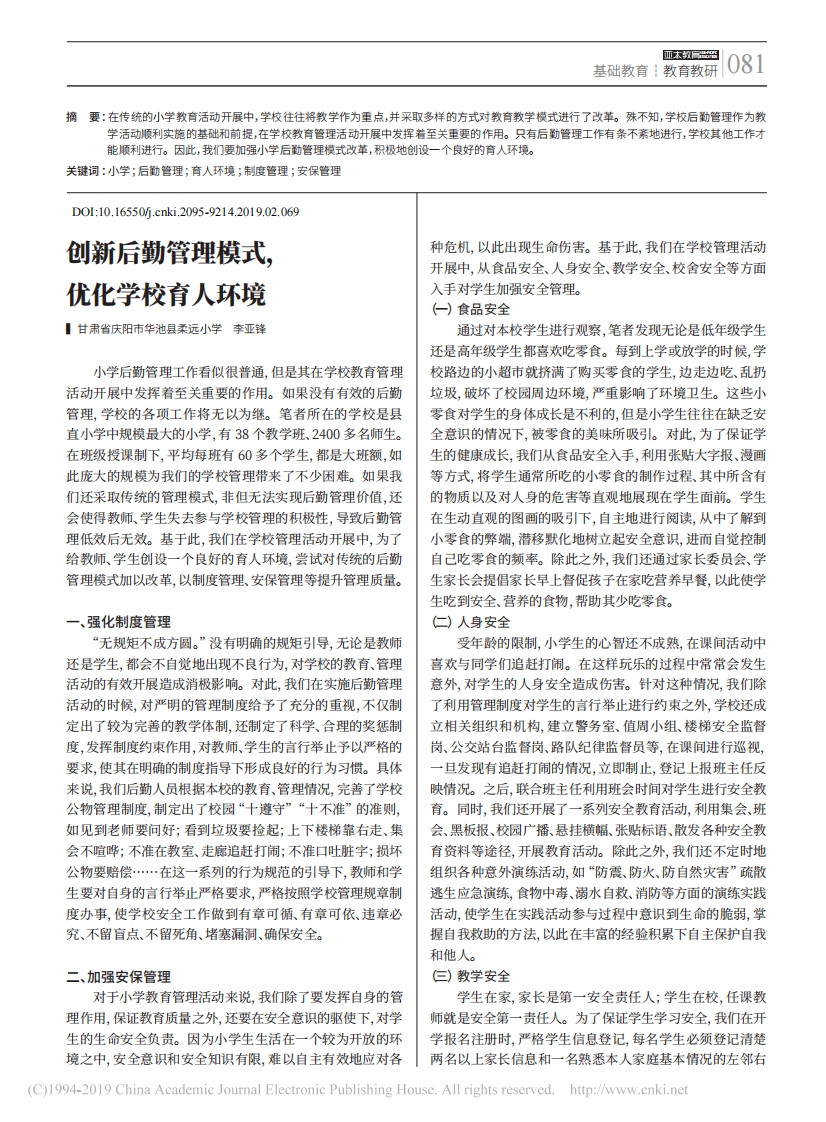 基础教育:教育教研081要:在传统的小学教育活动开展中,学校往往将教学作为重点,并采取多样的方式对教育教学模式进行了改革。殊不知,学校后勤管理作为教学活动顺利实施的基础和前提,在学校教育管理活动开展中发挥着至关重要的作用。只有后勤管理工作有条不亲地进行,学校其他工作才能顺利进行。因此,我们要加强小学后勒管理模式改革,积极地创设一个良好的育人环境。关键词:小学;后勒管理;育人环境;制度管理;安保管理D0:10.16550M.cnki.2095-9214.2019.02.069创新后勤管理模式,种危机,以此出现生命伤害。基于此,我们在学校管理活动开展中,从食品安全、人身安全、教学安全、校舍安全等方面优化学校育人环境入手对学生加强安全管理。(一)食品安全甘肃省庆阳市华池县柔远小学李亚锋通过对本校学生进行观察,笔者发现无论是低年级学生还是高年级学生都喜欢吃零食。每到上学或放学的时候,学小学后勤管理工作看似很普通,但是其在学校教育管理校路边的小超市就挤满了购买零食的学生,边走边吃、乱扔活动开展中发挥着至关重要的作用。如果没有有效的后勤垃圾,破坏了校园周边环境,严重影响了环境卫生。这些小管理,学校的各项工作将无以为继。笔者所在的学校是县零食对学生的身体成长是不利的,但是小学生往往在缺乏安直小学中规模最大的小学,有38个教学班、2400多名师生。全意识的情况下,被零食的美味所吸引。对此,为了保证学在班级授课制下,平均每班有60多个学生,都是大班额,如生的健康成长,我们从食品安全入手,利用张贴大字报、漫画此庞大的规模为我们的学校管理带来了不少困难。如果我等方式,将学生通常所吃的小零食的制作过程、其中所含有们还采取传统的管理模式,非但无法实现后勤管理价值,还的物质以及对人身的危害等直观地展现在学生面前。学生会使得教师、学生失去参与学校管理的积极性,导致后勤管在生动直观的图画的吸引下,自主地进行阅读,从中了解到理低效后无效。基于此,我们在学校管理活动开展中,为了小零食的弊端,潜移默化地树立起安全意识,进而自觉控制给教师、学生创设一个良好的育人环境,尝试对传统的后勤自己吃零食的频率。除此之外,我们还通过家长委员会、学管理模式加以改革,以制度管理、安保管理等提升管理质量。生家长会提倡家长早上督促孩子在家吃营养早餐,以此使学生吃到安全、营养的食物,帮助其少吃零食。一、强化制度管理仁)人身安全“无规矩不成方圆。”没有明确的规矩引导,无论是教师受年龄的限制,小学生的心智还不成熟,在课间活动中还是学生,都会不自觉地出现不良行为,对学校的教育、管理喜欢与同学们追赶打闹。在这样玩乐的过程中常常会发生活动的有效开展造成消极影响。对此,我们在实施后勤管理意外,对学生的人身安全造成伤害。针对这种情况,我们除活动的时候,对严明的管理制度给予了充分的重视,不仅制了利用管理制度对学生的言行举止进行约束之外,学校还成定出了较为完善的教学体制,还制定了科学、合理的奖惩制立相关组织和机构,建立警务室、值周小组、楼梯安全监督度,发挥制度约束作用,对教师、学生的言行举止予以严格的岗、公交站台监督岗、路队纪律监督员等,在课间进行巡视,要求,使其在明确的制度指导下形成良好的行为习惯。具体一旦发现有追赶打闹的情况,立即制止,登记上报班主任反来说,我们后勤人员根据本校的教育、管理情况,完善了学校映情况。之后,联合班主任利用班会时间对学生进行安全教公物管理制度,制定出了校园“十遵守”“十不准”的准则,育。同时,我们还开展了一系列安全教育活动,利用集会、班如见到老师要问好;看到垃圾要捡起;上下楼梯靠右走、集会、黑板报、校园广播、悬挂横幅、张贴标语、散发各种安全教会不喧哗;不准在教室、走廊追赶打闹;不准口吐脏字;损坏育资料等途径,开展教育活动。除此之外,我们还不定时地公物要赔偿…在这一系列的行为规范的引导下,教师和学组织各种意外演练活动,如“防震、防火、防自然灾害”疏散生要对自身的言行举止严格要求,严格按照学校管理规章制逃生应急演练,食物中毒、溺水自救、消防等方面的演练实践度办事,使学校安全工作做到有章可循、有章可依、违章必活动,使学生在实践活动参与过程中意识到生命的脆弱,掌究、不留盲点、不留死角、堵塞漏洞、确保安全。握自我救助的方法,以此在丰富的经验积累下自主保护自我和他人。二、加强安保管理)教学安全对于小学教育管理活动来说,我们除了要发挥自身的管学生在家,家长是第一安全责任人;学生在校,任课教理作用,保证教育质量之外,还要在安全意识的驱使下,对学师就是安全第一责任人。为了保证学生学习安全,我们在开生的生命安全负责。因为小学生生活在一个较为开放的环学报名注册时,严格学生信息登记,每名学生必须登记清楚境之中,安全意识和安全知识有限,难以自主有效地应对各两名以上家长信息和一名熟悉本人家庭基本情况的左邻右(C)1994-2019 China Academic Journal Electronic Publishing House.All rights reserved.http://www.cnki.net082教育教研:职业教育摘要:语言的学习是一个内化的过程,综合运用语言能力是在真正的语言交际使用中发展起来的。本文探讨了中职英语教学如何提高学生
