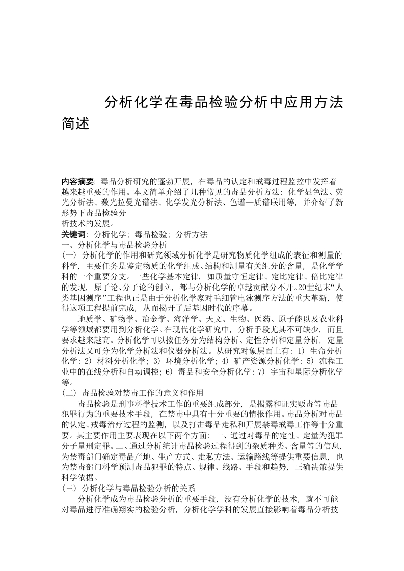 分析化学在毒品检验分析中应用方法简述内容摘要:毒品分析研究的蓬勃开展,在毒品的认定和戒毒过程监控中发挥着越来越重要的作用。本文简单介绍了几种常见的毒品分析方法:化学显色法、荧光分析法、激光拉曼光谱法、化学发光分析法、色谱一质谱联用等,并介绍了新形势下毒品检验分析技术的发展。关键词:分析化学:毒品检验:分析方法一、分析化学与毒品检验分析(一)分析化学的作用和研究领域分析化学是研究物质化学组成的表征和测量的科学,主要任务是鉴定物质的化学组成、结构和测量有关组分的含量,是化学学科的一个重要分支。一些化学基本定律,如质量守恒定律、定比定律、倍比定律的发现,原子论、分子论的创立,都与分析化学的卓越贡献分不开。20世纪末“人类基因测序”工程也正是由于分析化学家对毛细管电泳测序方法的重大革新,使得这项工程提前完成,从而揭开了后基因时代的序幕。地质学、矿物学、治金学、海洋学、天文、生物、医药、原子能以及农业科学等领域都要用到分析化学。在现代化学研究中,分析手段尤其不可缺少,而且要求越来越高。分析化学可以按任务分为结构分析、定性分析和定量分析,定量分析法又可分为化学分析法和仪器分析法。从研究对象层面上有:1)生命分析化学:2)材料分析化学:3)环境分析化学:4)矿产资源分析化学:5)流程工业中的在线分析和自动调控:6)毒品和安全分析化学:7)宇宙和星际分析化学等。(二)毒品检验对禁毒工作的意义和作用毒品检验是刑事科学技术工作的重要组成部分,是揭露和证实贩毒等毒品犯罪行为的重要技术手段,在禁毒中具有十分重要的情报作用。毒品分析对毒品的认定、戒毒治疗过程的监测,以及打击毒品走私和开展禁毒戒毒工作等十分重要。其主要作用主要表现在以下两个方面:一、通过对毒品的定性、定量为犯罪分子量刑定罪。二、通过分析统计毒品检验过程得到的杂质种类、含量等的信息,为禁毒部门确定毒品产地、生产方式、走私方法、运输路线等提供重要信息,也为禁毒部门科学预测毒品犯罪的特点、规律、线路、手段和趋势,正确决策提供科学依据。(三)分析化学与毒品检验分析的关系分析化学成为毒品检验分析的重要手段,没有分析化学的技术,就不可能对毒品进行准确翔实的检验分析,分析化学学科的发展直接影响着毒品分析技术的发展。毒品分析也为分析化学拓宽了研究领域,为分析化学的进展提供了新的途径。二、分析化学在毒品检验分析中的应用由于毒品分析的复杂性、高难度性和本身具有的一些特点,使毒品的分析几乎涉及分析化学的所有技术。在仪器分析技术发展的初期,毒品检验主要采用化学分析的方法来完成,如化学显色法。随着仪器分析技术的发展与成熟,分子光谱法(如荧光分析法、激光拉曼技术、傅立叶变换红外光谱、化学发光法等)、色谱法(薄层色谱法、高效液相色谱法、气相色谱法等)、色谱质谱联用法(如GCMS、HPLC-MS、GC-MS-MS、GC-HRMS等)以及毛细管电泳等仪器分析方法成为毒品检验分析的主要手段,而化学分析法则作为辅助手段用于毒品检验分析的初筛和预实验。这里对毒品检验分析常用的,发展日趋成熟的部分分析化学方法进行简单介绍。(一)化学显色法这是一种定性分析方法,通常利用毒品与某些化学试剂作用,产生特征的颜色来确定其存在。例如:吗啡的甲醛一一一硫酸试验,其原理是利用吗啡与甲醛在硫酸存在下发生缩合反应产物首先呈红色,渐变紫色,最终为蓝色。这种方法简单、直观、容易操作,但是需要的检材比较多,特异性比较差。(二)荧光分析法荧光分析法是根据物质的分子荧光光谱进行定性,以荧光强度时行定量分析的一种方法。荧光分析仪原理图如图1和图2。样品池透镜图1荧光分析仪光学系统结构原理图光学样品信号检信号分系统测放大析处理显示图2荧光分析仪原理图荧光分析法灵敏度高,可以达到10-6。使用时要考虑环境的影响因素,不同溶剂、温度、pH值以及噪声都会对测量结果有影响,但有时也可以在特殊情况下使用这些影响因素。以测量吗啡和可待因为例,用285m的紫外光激发吗啡和可待因产生荧光的特征峰在350nm。吗啡在pH1一3的溶液中荧光强度最大,而在pH12的溶液中荧光几乎完全消失。可待因在015mo1/LH2S04中荧光强度与相同浓度的吗啡差别不大,但是在碱性溶液中并不减弱,利用这一特性可以同时测定它们的含量。具体方法是分别测定pH1和pH12的混合物的荧光强度,由pH12溶液的荧光强度测定出可待因的含量。再由可待因的含量计算它在p1溶液中的荧光强度,从而差减出吗啡在H1溶液中的荧光强度,从标准曲线求得吗啡的含量。(三)激光拉曼光谱法当单色光被物质分子散射时,大部分散射光的频率同于入射光的频率,这种散射称为瑞利散射:能观测到一小部分分散射光的频率不同于入射光的频率,这种散射称为拉曼散射。拉曼散射线的频率与入射光频率之差称为拉曼频移,其可表征分子中不同基团振动的特性,因此可以通过测定对分子进行定性和结构分析。激光拉曼光谱仪的基本部件有激光光源、试样池、单色器和检测记录系统,如图3所示。利用显微拉曼技术对安非他明硫酸盐、甲基安非他明盐酸盐、盐酸吗啡、盐酸海洛因、盐酸蒂芭因、盐酸那可汀、盐酸罂粟碱和盐酸可待因等常见毒品