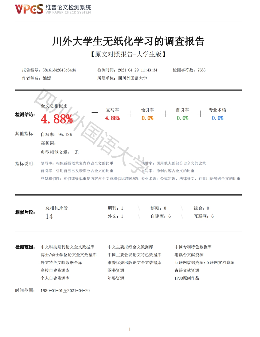 维普论文检测系统VIP PAPER CHECK SYSTEM川外大学生无纸化学习的调查报告【原文对照报告-大学生版】报告编号:58c61d42845c64d4检测时间:2021-04-2911:43:34检测字符数:7663作者姓名:姚媛所属单位:四川外国语大学全文总相似比复写率他引率自引率专业术语检测结论:4.88%4.88%0.0%0.0%0.0%其他指标:自写率:95.12%高频词:典型相似文章:无指标说明:国语大复写率:相似或疑似重复内容占全文的比重引用他人的部分占全文的比重自引率:引用自己已发表部分占全文的比重自写率:原创内容占全文的比重典型相似性:相似或疑似重复内容占全文总相似比超过30%专业术语:公式定理、法律条文、行业用语等占全文的比重总相似片段期刊:1博硕:0综合:0相似片段:14外文:1自建库:6互联网:6检测范围:中文科技期刊论文全文数据库中文主要报纸全文数据库中国专利特色数据库博士/硕士学位论文全文数据库中国主要会议论文特色数据库港澳台文献资源外文特色文献数据全库维普优先出版论文全文数据库互联网数据资源/互联网文档资源高校自建资源库图书资源古籍文献资源个人自建资源库年鉴资源IPUB原创作品时间范围:1989-01-01至2021-04-29维普论文检测系统VIP PAPER CHECK SYSTEM原文对照颜色标注说明:■自写片段■复写片段(相似或疑似重复)口引用片段(引用)■专业术语(公式定理、法律条文、行业用语等)外国本科毕业设计(商务实践报告类)中文题目:川外大学生无纸化学习的调查报告外文题目:A Survey Report on Paperless Learning for College Students in SISU院系商务英语学院专业商务英语年级2017级学号20201744010168学生姓名姚嬡指导教师曾立结稿日期2021年4月28日四川外国语大学教务处制商务实践报告独创性声明本人声明所呈交的商务实践报告是本人在导师指导下,通过调查、研究及分析取得的成果。据我所知,除了文中特别加以标注和致谢的地方外,报告中不包含其他人已经发表或撰写过的研究成果,也不包含为获得四川外国语大学或其他教育机构的学位或证书而使用过的材料。其他人士对本研究所做的任何贡献均已在文中作了明确的说明并表示谢意。作者签名:签字日期:2021年4月28日商务实践报告版权使用授权书本商务实践报告作者完全了解四川外国语大学有关保留、使用学位论文的规定,有权保留并向国家有关部门或机构送交该报告的复印件和电子版,允许该报告被查阅和借阅。本人授权四川外国语大学可以将本报告的全部或部分内容编入有关数据库进行检索,可以采用影印、缩印或扫描等复制手段保存、汇编本报告。作者签名:导师签名:签字日期:签字日期:年月日川外大学生无纸化学习的调查报告2维普论文检测系统VIP PAPER CHECK SYSTEM摘要:随着信息技术的飞速发展,无纸化已被广泛应用到社会的方方面面,如无纸化办公、无纸化会议、无纸化交易等等,促进了各项社会事业的快速发展。在2020年突发的新冠疫情影响下,广大学生群体在家自行隔离,全国上下开展了网课学习,无纸化学习的概念逐渐走进大众眼中。本报告基于对相关理论和数据的研究,以四川外国语大学的学生群体为对象,通过问卷调查和数据分析,对大学生无纸化学习的情况展开讨论,结合相关数据,讨论线上教育的发展前景。实践研究主要表现在,采用问卷调查的研究方法,对大学生无纸化学习的普及情况进行实证研究,主要从大学生对无纸化学习的认识、无纸化学习相比传统的纸笔学习所占的比重,结合数据分析大学生无纸化学习的普及现状以及其在学生群体中风靡的原因,同时对无纸化学习的发展给出建议。本报告最终得出以下观点:(1)突如其来的疫情推动了无纸化学习发展的进程,并将在未来的一段时间内持续影响:(2)大学生群体无纸化学习普及程度较高,有相当一部分人已经形成了无纸化学习的习惯:(3)大学生普遍对无纸化学习有良好的认识,认为无纸化学习有着许多传统纸笔学习无法企及的优点,例如方便快捷。但受调查的大学生群体普遍认为无纸化学习不能取代传统的纸笔学习:(4)无纸化学习未来的发展前景取决于缺乏有效监管的问题能否得到解决以及如何避免碎片化思维的。关键词:大学生:无纸化学习;线上教育;后疫情时代:AcknowledgementsFirst and foremost,I would like to express my heartfelt gratitude to my supervisor,LecturerZeng Li.I have benefited tremendously from her critical thinking and insightful viewpoint.Duringthe process of writing this report,she had always been generous to offer me useful suggestionsanswer my question and discuss with me.Her detailed guidance and helpful comments on my reportencourage me to overcome difficulties and think more critically.Secondly,my cordial and sincere thanks go to Professor Luo Peiya and Professor Zhong Shen,aswell as other professors,who kindly offered me relevant materials and embarked my mind.They haveall made great contributions to the final draft of the report.Thirdly,I want to thank all my affectionate roommates and friends.They had given lots ofsupport and encouragements in their own ways.Last but also important,big thanks go to my families who have shared with me my worries,frustrations,and hopefully my ultimate happiness in eventually finishing this report.Contents中文摘要…AcknowledgementsiiiExecutive Summaryl1.Backgrounds33.Significances34.Definition of Terms44.2Paperless Learning54.3Paperless Teaching55.Design and Methodology55.1Logical Analysis of Paperless Learning65.2Literature Review of Paperless Learning65.3Related Studies on the Sales F