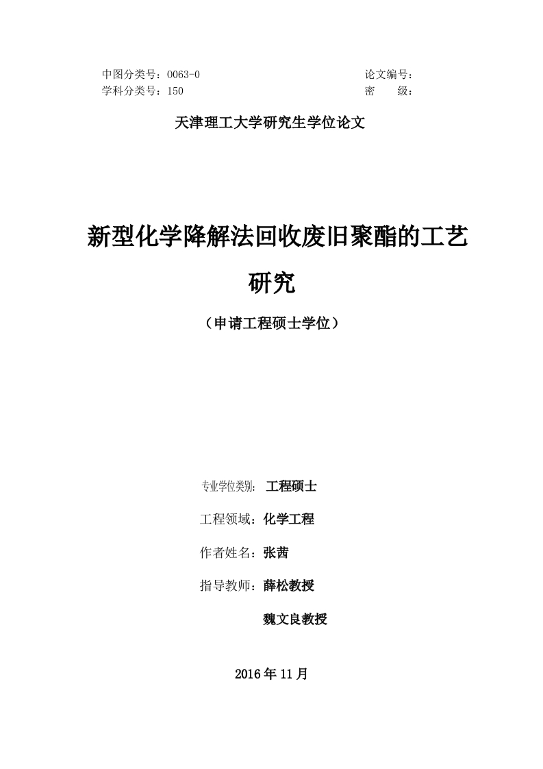 中图分类号:0063-0论文编号:学科分类号:150密级:天津理工大学研究生学位论文新型化学降解法回收废旧聚酯的工艺研究(申请工程硕士学位)专业学位类别:工程硕士工程领域:化学工程作者姓名:张茜指导教师:薛松教授魏文良教授2016年11月New method of chemicaldegradation and recycling of wastepolyester (PET)Supervisor XUE SONGWEI WEN LIANG英文年份November2016独创性声明本人声明所呈交的学位论文是本人在导师指导下进行的研究工作和取得的研究成果,除了文中特别加以标注和致谢之处外,论文中不包含其他人己经发表或撰写过的研究成果,也不包含为获得天津理工大学或其他教育机构的学位或证书而使用过的材料。与我一同工作的同志对本研究所做的任何贡献均己在论文中作了明确的说明并表示了谢意。学位论文作者签名:年月学位论文版权使用授权书本学位论文作者完全了解天津理工大学有关保留、使用学位论文的规定。特授权天津理工大学可以将学位论文的全部或部分内容编入有关数据库进行检索,并采用影印、缩印或扫描等复制手段保存、汇编,以供查阅和借阅。同意学校向国家有关部门或机构送交论文的复本和电子文件。(保密的学位论文在解密后适用本授权说明)学位论文作者签名:导师签名:签字日期:年月日年月