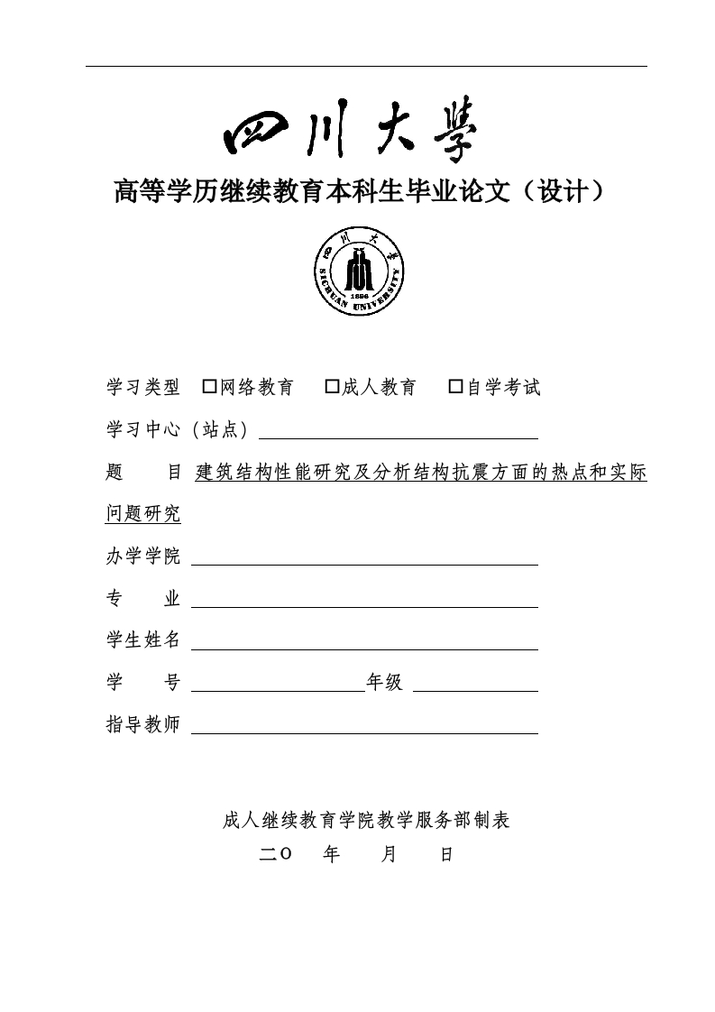 高等学历继续教育本科生毕业论文(设计)学习类型口网络教育口成人教育口自学考试学习中心(站点)题目建筑结构性能研究及分析结构抗震方面的热点和实际问题研究办学学院专业学生姓名学号年级指导教师成人继续教育学院教学服务部制表二0年月建筑结构性能研究及分析结构抗震方面的热点和实际问题研究指导老师:*摘要建筑场地的选择当地震发生时,建筑物在完工和未完工的主体上会产生破坏,如有在施工人员主体上,地政会直接破坏建筑物,导致建筑对施工人员的安全影响,尤其是主体未完工的项目,所以我们要提前做好地质勘察,因为地质条件地质条件是地政来时对建筑被破坏的主要原因之一建筑结构河边,山边等等地方都是地震会带来的不可估计的后果,如不可避免的在松软地方接项目,必须先有应急预案,如何搭建,搭建的方案,长宽高的比例都需要通过论证达到合理化,主体里面要着重考虑墙体,柱体,因为墙体柱体会承担很大一部分荷载力。关键词:建筑结构性能:抗震性能:结构特点:设计热点Research on building structure performance andanalysis of hot spots and practical problems instructural seismic aspectsStudent:Shen *Supervisor:Wang *AbstractSelection of construction site when an earthquake occurs,thebuildings will be damaged on the completed and unfinished main bodies.If there is an earthquake on the main body of the construction personnel,the land administration will directly damage the buildings,resulting inthe safety impact of the buildings on the construction personnel,especially the unfinished projects of the main body.Therefore,we shoulddo a good job in geological survey in advance,because geologicalconditions are one of the main reasons for the destruction of the buildingsby the land administration,The side of the mountain and other places arethe unpredictable consequences of the earthquake.If it is inevitable toconnect the project in a soft place,there must be an emergency plan first.How to build,the construction scheme and the proportion of length,widthand height need to be rationalized through demonstration.The main bodyshould focus on the wall and column,because the wall column will beara large part of the loadKey words:building structure performance;seismic performance;structural features;design hot spots