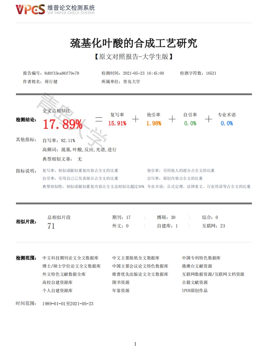 维普论文检测系统/IP PAPER CHECK SYSTEM巯基化叶酸的合成工艺研究【原文对照报告-大学生版】报告编号:8d0f33ea86f79e78检测时间:2021-05-2316:45:00检测字符数:16521作者姓名:周行健所属单位:青岛大学全文总相似比复写率他引率自引率专业术语检测结论:17.89%15.91%1.98%0.0%0.0%其他指标:自写率:82.11%高频词:巯基,叶酸,反应,光谱,进行典型相似文章:无指标说明:复写率:相似或疑似重复内容占全文的比重他引率:引用他人的部分占全文的比重自引率:引用自己已发表部分占全文的比重自写率:原创内容占全文的比重典型相似性:相似或疑似重复内容占全文总相似比超过30%专业术语:公式定理、法律条文、行业用语等占全文的比重总相似片段期刊:17博硕:30综合:0相似片段:71外文:0自建库:1互联网:23检测范围:中文科技期刊论文全文数据库中文主要报纸全文数据库中国专利特色数据库博士/硕士学位论文全文数据库中国主要会议论文特色数据库港澳台文献资源外文特色文献数据全库维普优先出版论文全文数据库互联网数据资源/互联网文档资源高校自建资源库图书资源古籍文献资源个人自建资源库年鉴资源IPUB原创作品时间范围:1989-01-01至2021-05-23维普论文检测系统VIP PAPER CHECK SYSTEM原文对照颜色标注说明:■自写片段■复写片段(相似或疑似重复)■引用片段(引用)■专业术语(公式定理、法律条文、行业用语等)QINGDAO UNIVERSITY本科毕业论文(设计)题目:巯基化叶酸的合成工艺研究学院:材料科学与工程学院专业:高分子材料与工程姓名:周行健指导教师:刘继宪2021年5月25日巯基化叶酸的合成工艺研究Study on the synthesis process of sulfhydryl folic acid郑重声明本人呈交的学位论文(设计),是在指导教师的指导下,独立进行研究工作所取得的成果,所有数据、图片资料真实可靠。除文中已经注明引用的内容外,本学位论文(设计)的研究成果不包含他人享有著作权的内容。对本论文(设计)所涉及的研究工作做出贡献的其他个人和集体,均已在文中以明确的方式标明。本学位论文(设计)的知识产权归属于青岛大学。摘要通过三步法制备一种叶酸的疏基化衍生物,可用于修饰金属纳米粒子。首先,使用双氧水将疏基化合物氧化为含双硫键的化合物,对巯基进行保护:然后采用二甲基亚砜等溶剂、4-二甲氨基吡啶作为催化剂、二环己基碳二亚胺作为脱水剂,进行叶酸与二硫物的酯化反应或酰胺化反应:最后采用疏基乙胺等还原剂还原双硫键,是为疏基的脱保护,得到最终产物。用紫外可见光谱仪、傅立叶变换红外光谱仪、激光拉曼光谱仪等分析中间产物和目标产物,验证巯基被成功地保护和脱保护,并成功地得到了叶酸的巯基化衍生物。在制备过程中对疏基化合物的选用、反应物摩尔比、氧化剂和还原剂的选取、萃取剂的选择及分离方法等作为考察因素,确定最佳的合成工艺。关键词:叶酸巯基化衍生物保护脱保护合成工艺Abstract2维普论文检测系统VIP PAPER CHECK SYSTEMA sulfhydryl derivative of folic acid is prepared by a three-step method,which can be used tomodify metal nanoparticles.First,use hydrogen peroxide to oxidize the sulfhydryl compound into acompound containing disulfide bonds to protect the sulfhydryl group;then use a solvent such asdimethyl sulfoxide,4-dimethylaminopyridine as a catalyst,and dicyclohexylcarbodiimide as adehydrating agent carry out the esterification reaction or amidation reaction of folic acid anddisulfide;finally,Mercaptoethylamine and other reducing agents are used to reduce the disulfidebond to deprotect the sulfhydryl group to obtain the final product.The intermediate products andtarget products were analyzed with ultraviolet-visible spectrometer,Fourier transform infraredspectrometer,Raman spectrometer,etc.,to verify that the sulfhydryl group was successfullyprotected and deprotected,and the sulfhydryl derivative of folic acid was successfully obtained.Inthe preparation process,the selection of sulfhydryl compounds,the molar ratio of reactants,theselection of oxidizing agent and reducing agent,the selection of extraction agent and theseparation method are used as investigating factors to determine the best synthesis process.Key words:Folic acid sulfhydryl derivative protection deprotection synthesis process目录本科毕业论文(设计)1摘要4Abstract4第一章绪论61.1引言61.2叶酸61.2.1叶酸的介绍61.2.2叶酸的靶向作用71.2.3叶酸应用于癌症治疗81.3巯基化合物91.3.1疏基化合物的介绍91.3.2重要的巯基化合物制备方法101.4金纳米材料111.5本论文的研究目的和内容12第二章实验部分132.1引言132.2实验仪器装置和试剂132.3巯基化叶酸的合成142.3.1巯基乙胺修饰叶酸142.3.2巯基乙醇修饰叶酸152.3.311-巯基-1-十一醇修饰叶酸172.4分析测试与表征18第三章结果与讨论203.1叶酸和疏基化叶酸的紫外-可见光谱分析203.2叶酸和巯基化叶酸的红外光谱分析243.3巯基化叶酸的拉曼光谱分析27第四章结论29致谢30参考文献31第一章绪论1.1引言癌症是人类生命的杀手,是全球人类第二大死因,癌谓起于皮结之毒瘤,我国近二十年来,癌症呈少化及发病3