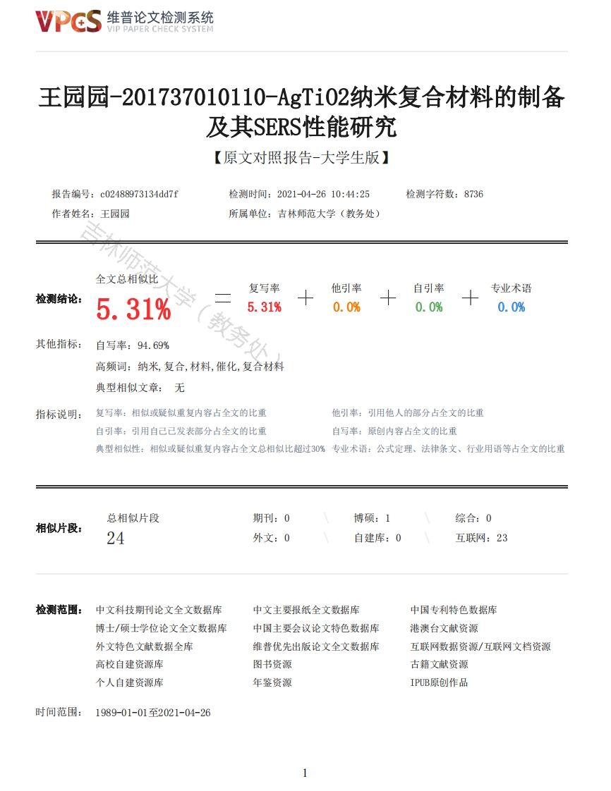 维普论文检测系统VIP PAPER CHECK SYSTEM王园园-201737010110-AgTi02纳米复合材料的制备及其SERS性能研究【原文对照报告-大学生版】报告编号:c02488973134dd7f检测时间:2021-04-2610:44:25检测字符数:8736作者姓名:王园园所属单位:吉林师范大学(教务处)全文总相似比复写率他引率自引率专业术语检测结论:5.31%5.31%0.0%0.0%0.0%其他指标:自写率:94.69%高频词:纳米,复合,材料,催化,复合材料典型相似文章:无指标说明:复写率:相似或疑似重复内容占全文的比重他引率:引用他人的部分占全文的比重自引率:引用自己已发表部分占全文的比重自写率:原创内容占全文的比重典型相似性:相似或疑似重复内容占全文总相似比超过30%专业术语:公式定理、法律条文、行业用语等占全文的比重总相似片段期刊:0博硕:1综合:0相似片段:24外文:0自建库:0互联网:23检测范围:中文科技期刊论文全文数据库中文主要报纸全文数据库中国专利特色数据库博士/硕士学位论文全文数据库中国主要会议论文特色数据库港澳台文献资源外文特色文献数据全库维普优先出版论文全文数据库互联网数据资源/互联网文档资源高校自建资源库图书资源古籍文献资源个人自建资源库年鉴资源IPUB原创作品时间范围:1989-01-01至2021-04-26维普论文检测系统VIP PAPER CHECK SYSTEM原文对照颜色标注说明:■自写片段■复写片段(相似或疑似重复)口引用片段(引用)■专业术语(公式定理、法律条文、行业用语等)吉林师范大学毕业论文(设计论文分类号:0614密级:无论文(设计)题目学院、专业:化学学院化学专业学生姓名:王园园年级、班、学号:2017级1班201737010110指导教师及职称:孙德武副教授2021年4月28日目录摘要1引言21实验部分21.1材料21.2Ag/Ti02纳米复合材料的制备31.3性质表征31.4有机染料污染物的SERS检测31.5Ag/Ti02复合物的回收利用31.64-NP的催化还原32结果与讨论42.1NaOH用量对晶相及显微结构的影响42.2AgNO3用量对晶相及显微结构的影响52.3C2H50H添加量对晶相及显微结构的影响52.4Ag/Ti02纳米复合材料的SERS性能72.5Ag/Ti02光催化降解及SERS检测82.6SERS监测4-NTP的催化还原93结论9参考文献10Ag/Ti02纳米复合材料的制备及其SERS性能研究摘要:用热溶剂法制备具有可控结晶和性能的纳米复合材料。通过使用不同配比和反应条件的相同原料,改变2维普论文检测系统VIP PAPER CHECK SYSTEM纳米复合材料的形貌以及结晶。分别用TEM和XRD的方法对产物进行分析,制备的Ag/T02纳米复合材料被用作检测环境有机染料污染物(CV和RB),具有良好的可回收性。关键词:Ag/Ti02纳米复合材料;光催化;SERS:有机染料污染物Preparation of Ag/Ti02 nanocomposites with controlled crystallization and properties as amultifunctional material for SERS and photocatalytic applicationsAbstract:Ag/Ti02 nanocomposites with controlled crystallization and properties were prepared bya simple solvothermal method.By using the same raw materials with different ratio and reactionconditions,the morphologies and crystallization of nanocomposites can be tuned.The components ofthe products were analyzed by TEM and XRD methods respectively.The as-prepared Ag/Ti02nanocomposites were evolved for detection of environmental organic dyes pollutants (CV and RhB)withexcellent recyclability.Key word:Ag/Ti02 nanocomposites;SERS:Photocatalysis;Organic dyes pollutants引言有机染料的应用十分广泛,其中一些染料对环境和人体健康有害。硝基苯酚类化合物是农药和合成染料中常见的副产品会污染环境。要改善环境与生活,就要用精确的技术来消除这些对环境有害的物质。消除这些环境污染物,最常见的方法是利用各种纳米粒子进行催化[1,2]。二氧化钛(Ti02)其光催化活性高化学稳定性好、价带和导带的位置合适,是环境保护领域研究最多的光催化剂[3-5]。但纯的二氧化钛有光利用率低、光腐蚀以及转化效率低等缺陷。同时,减少硝基酚类化合物最常见的方法是将硝基苯酚类化合物还原为氨基苯酚。最近的研究发现,大多数Ag/Ti02由于带隙能窄,表现出较强的可见光吸收和明显的可见光催化活性[6-8]。光与银纳米粒子(AgNPs)的相互作用导致局部表面等离子体共振(LSPR)的激发,被称为弱拉曼模式。结合Ti02与AgNPs的优点将提供一个实时SES检测以及去除单个材料上吸附分子的机会。Ag/Ti02作为可回收的SERS底物,具有良好的SERS增强活性和可回收性[9,10]。在制备技术中,利用高温控制T02的形貌和晶体结构是一种流行的方法,在低温下改变反应物和溶剂的量就能获得可控的结晶[11-13]。开发一种简单、低成本、结晶和性能可控的Ag/Ti02是非常有吸引力、基于纳米复合材料的溶剂热法。早期的研究主要集中在碱对Ti02或T102-Ag晶相和形貌的影响,有关碱和盐对Ti02-Ag晶相和形貌影响的报道较少。在此,我们提出了一种简单、环保、经济的方法来制备具有可控结晶和性能的Ag/T02型纳米复合材料。与传统方法相比Ti(S04)2、C2H50H、AgNO3和N0H之间的强配位作用良好的控制了Ti02-Ag晶体的生长。无机物种和溶剂会影响光催化剂的特性,因此详细分析了Na0H、AgN03溶剂对Ag/Ti02制备的影响[14,15]。在合适的条件下制备了Ag/Ti02纳米复合材料,它具有较高的拉曼散射(SERS)和光催化活性。基于这种Ag/Ti02纳米复合材料,可以检测和降解微量的环境有机污染物(CV、RB和4-NP)。通过使用这种Ag/Ti02纳米复合材料可以检测和鉴定4-硝基硫酚(4-NTP)的催化还原。此研究对环境中有机污染物的痕量检测和动态多相催化理论研究及实际应用具有