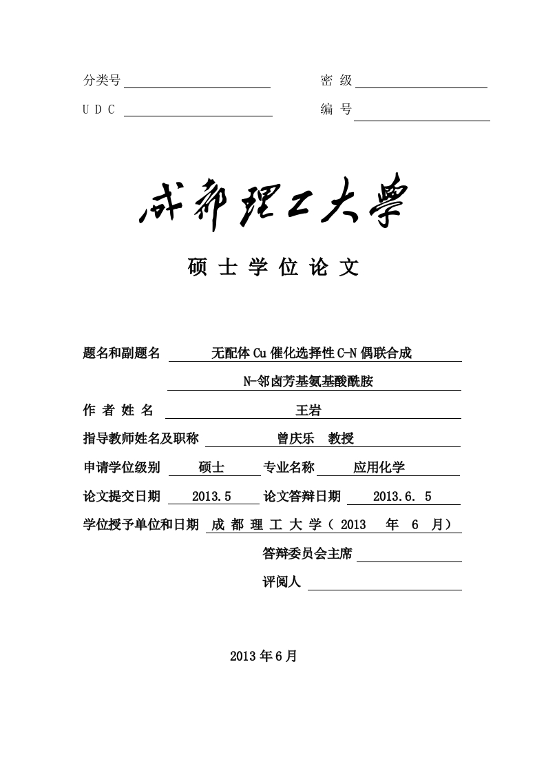 分类号密级编号硕士学位论文题名和副题名无配体Cu催化选择性C-N偶联合成从邻卤芳基氨基酸酰胺作者姓名王岩指导教师姓名及职称曾庆乐教授申请学位级别硕士专业名称应用化学论文提交日期2013.5论文答辩日期2013.6.5学位授予单位和日期成都理工大学(2013年6月)答辩委员会主席评阅人2013年6月分类号学校代码:10616密级学号:2010020712成都理工大学硕士学位论文无配体Cu催化选择性C-N偶联合成N-邻卤芳基氨基酸酰胺王岩指导教师姓名及职称曾庆乐教授申请学位级别硕士专业名称应用化学论文提交日期2013.5论文答辩日期2013.6.5学位授予单位和日期成都理工大学(2013年6月)答辩委员会主席评阅人2013年6月独创性声明本人声明所呈交的学位论文是本人在导师指导下进行的研究工作及取得的研究成果。据我所知,除了文中特别加以标注和致谢的地方外,论文中不包含其他人已经发表或撰写过的研究成果,也不包含为获得成都理工大学或其他教育机构的学位或证书而使用过的材料。与我一同工作的人员对本研究所做的任何贡献均已在论文中作了明确的说明并表示谢意。学位论文作者签名:年月日学位论文版权使用授权书本学位论文作者完全了解成都理工大学有关保留、使用学位论文的规定,有权保留并向国家有关部门或机构送交论文的复印件和磁盘,允许论文被查阅和借阅。本人授权成都理工大学可以将学位论文的全部或部分内容编入有关数据库进行检索,可以采用影印、缩印或扫描等复制手段保存、汇编学位论文。(保密的学位论文在解密后适用本授权书)学位论文作者签名:学位论文作者导师签名:年月日