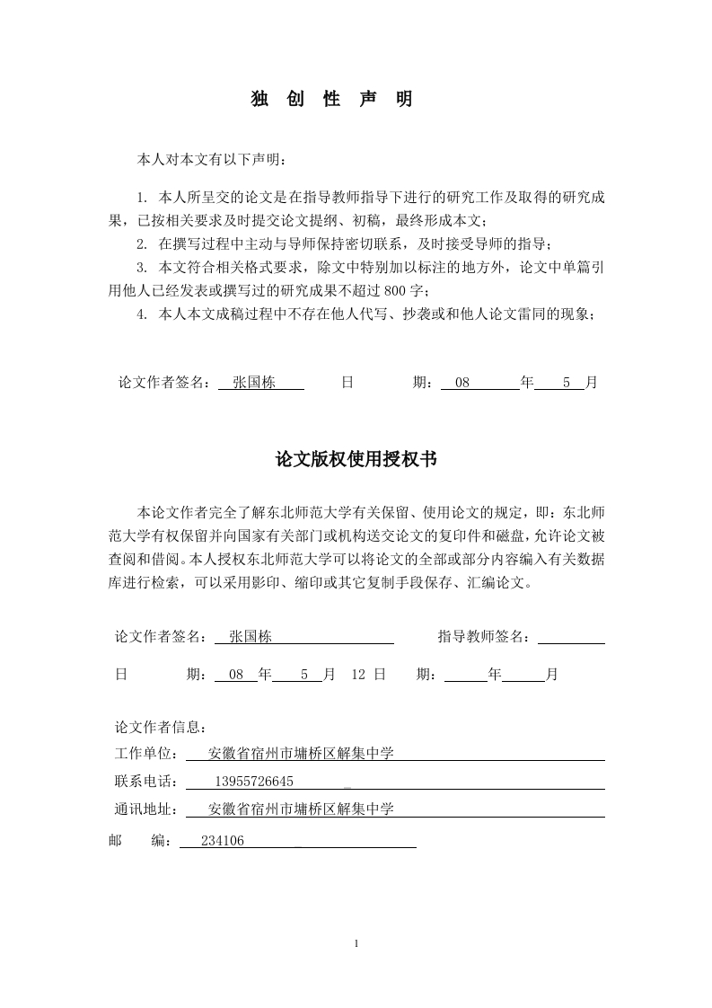 独创性声明本人对本文有以下声明:1.本人所呈交的论文是在指导教师指导下进行的研究工作及取得的研究成果,已按相关要求及时提交论文提纲、初稿,最终形成本文:2.在撰写过程中主动与导师保持密切联系,及时接受导师的指导:3.本文符合相关格式要求,除文中特别加以标注的地方外,论文中单篇引用他人已经发表或撰写过的研究成果不超过800字:4.本人本文成稿过程中不存在他人代写、抄袭或和他人论文雷同的现象:论文作者签名:张国栋日期:08年5月论文版权使用授权书本论文作者完全了解东北师范大学有关保留、使用论文的规定,即:东北师范大学有权保留并向国家有关部门或机构送交论文的复印件和磁盘,允许论文被查阅和借阅。本人授权东北师范大学可以将论文的全部或部分内容编入有关数据库进行检索,可以采用影印、缩印或其它复制手段保存、汇编论文。论文作者签名:张国栋指导教师签名:日期:08年5月12日期:年月论文作者信息:工作单位:安徽省宿州市墉桥区解集中学联系电话:13955726645通讯地址:安徽省宿州市墉桥区解集中学邮编:234106新课程理念下化学实验教育功能的转变与实验教学实施策略研究摘要随着现代教育改革的不断深入,传统的应试教育已转到全面提高学生科学文化素养上来,旧的化学教学思想与教学模式逐渐被现代化学教学观念所取代。新课程理念下的中学化学实验的内容和功能都发生了重大的变化。实验教学是学生探究学习获取知识的重要手段,是实现新课改的有效途径。当前化学实验教学正面临着更新教学理念和实现现代实验教学手段以及增加实验自主探究性等多重任务功能,对全面提高学生的科学素养尤其是创新精神和创新能力有着重要的作用,其重要性已越来越被广大化学教师所共识。本文结合新课标对化学实验的要求和当前实验教学的现状,认为做好化学实验教学管理、实验教学安全和实验教学意识环节,更新教师的教学观念、改革验证性实验和封闭式实验、改进实验及其手段、培养学生合作精神是渗透新课程理念的有效的途径之一。解读了中学化学新课标,指出了其核心的理念,阐述了其教育功能,并提出了的应对措施。关键词:新课程化学实验教学教育功能前言实施创新教育是迎接知识经济全球性综合国力竞争的需要,是深化教育改革、实施素质教育的需要。创新教育是以培养人的创新精神和创新能力为基本价值取向的教育。化学是一门以实验为基础的学科,化学实验能够创设一个巧妙的促进思维发展的情景,使学生在观察实验中获得感性知识,在分析研究实验过程中从生动的直观现象到抽象的思维能力,实验在整个化学课堂教学中有着其他手段不可代替的作用。加强实验教学是提高教学质量的重要一环,也是评价教学质量的一个重要方面。然而在相当长的时间里,我们偏偏忽视了这一点。一、新课程中的化学实验《化学课程标准》明确了化学课程的基本理念:立足于学生适应现代生活和未来发展的需要,着眼于提高21世纪公民的科学素养,构建“知识与技能”、“过程与方法”、“情感态度与价值观”相融合的中学化学课程目标体系。“知识与技能”即过去的“双基”:“过程与方法”是让学生掌握学习的方法,学会学习:“情感态度与价值观”是人文关怀的体现。所以新的课程理念的核心是“让学生在知识探索的过程中,在知识、学法、人文等方面得到发展.”其中第5条特别强调:“通过以化学实验为主的多种探究活动,使学生体验科学探究的过程,激发学习化学的兴趣,强化科学探究的意识,促进学习方式的转变,培养学生的创新精神和实践能力。根据新的教学理念及由此产生的新的课程标准对实验的表述,对比旧课程,我们发现新课程实验教学的转变表现在以下几个方面:①从以学科为本、以实验为本向以学生的发展为本转变,使实验从作为知识灌输的基础转变为促进学生发展的重要基础之一。②从为“教”设计实验向为“学”设计实验转变,让实验更好地配合学生的主动学习。③从为学生的课内学习而设计实验向为学生的课内学习和课外学习而设计实验转变,适应开放式学习的需要。④从只注重视培养实验操作能力向培养实验思维能力和培养实验操作能力并重转变。3