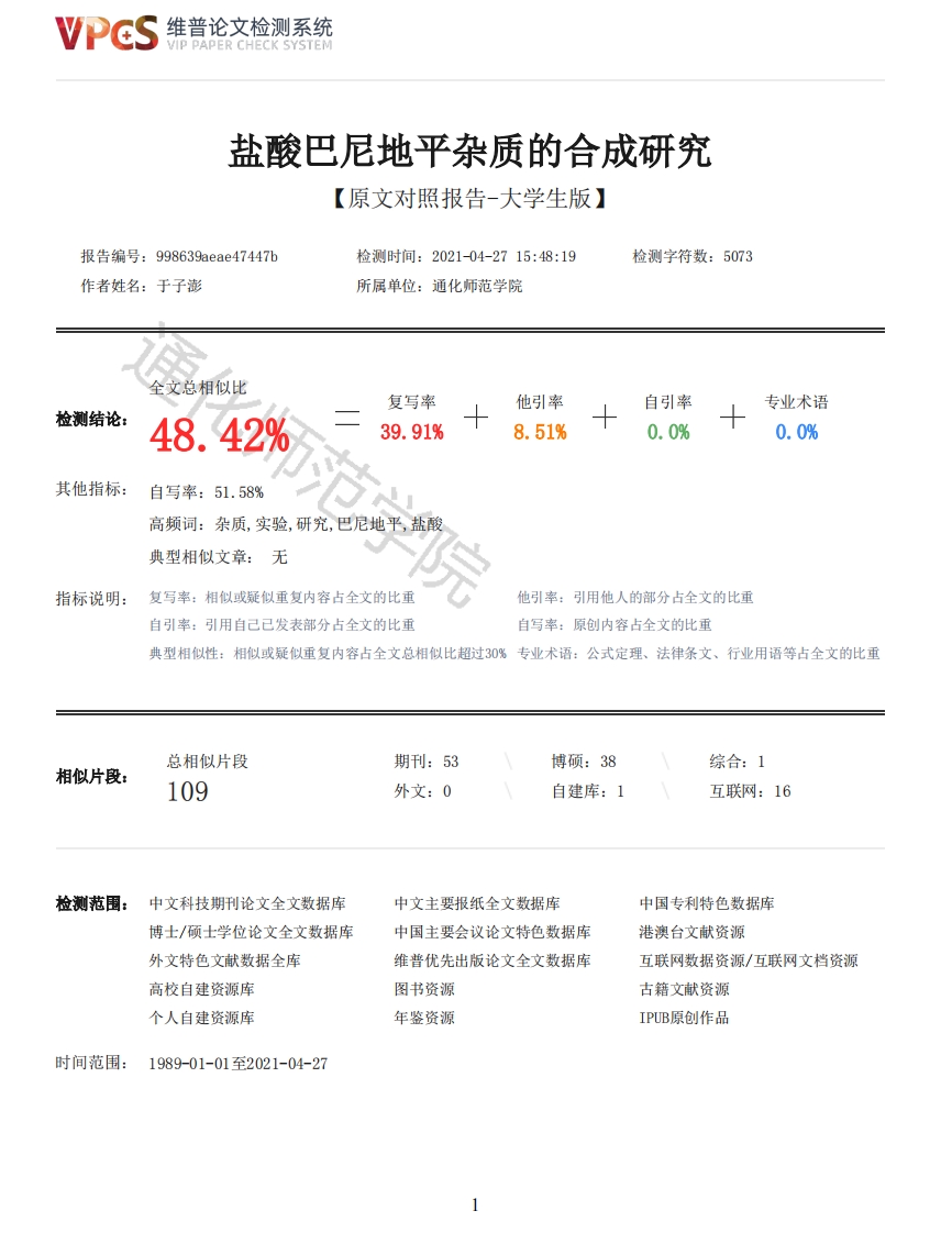 维普论文检测系统VIP PAPER CHECK SYSTEM盐酸巴尼地平杂质的合成研究【原文对照报告-大学生版】报告编号:998639aeae47447b检测时间:2021-04-2715:48:19检测字符数:5073作者姓名:于子澎所属单位:通化师范学院全文总相似比复写率他引率自引率专业术语检测结论:48.42%39.91%8.51%0.0%0.0%其他指标:自写率:51.58%高频词:杂质,实验,研究,巴尼地平,盐酸典型相似文章:无指标说明:复写率:相似或疑似重复内容占全文的比重他引率:引用他人的部分占全文的比重自引率:引用自己已发表部分占全文的比重自写率:原创内容占全文的比重典型相似性:相似或疑似重复内容占全文总相似比超过30%专业术语:公式定理、法律条文、行业用语等占全文的比重总相似片段期刊:53博硕:38综合:1相似片段:109外文:0自建库:1互联网:16检测范围:中文科技期刊论文全文数据库中文主要报纸全文数据库中国专利特色数据库博士/硕士学位论文全文数据库中国主要会议论文特色数据库港澳台文献资源外文特色文献数据全库维普优先出版论文全文数据库互联网数据资源/互联网文档资源高校自建资源库图书资源古籍文献资源个人自建资源库年鉴资源IPUB原创作品时间范围:1989-01-01至2021-04-27维普论文检测系统VIP PAPER CHECK SYSTEM原文对照颜色标注说明:■自写片段■复写片段(相似或疑似重复)口引用片段(引用)■专业术语(公式定理、法律条文、行业用语等)1929通化师范学院本科生毕业论文(2017届)题目:盐酸巴尼地平杂质的合成研究学院:医药学院专业:药物制剂班级:1704作者姓名:于子澎学号201715030123指导教师:耿晓宇职称讲师学位硕士论文成绩:2021年4月目录中文摘要…中文关键词…英文摘要…英文关键词…1实验仪器与材料…1.1实验材料…1.2实验仪器2实验步骤与结果…2.1第一步反应…22.2中间体2的合成…22.3中间体3的合成…22维普论文检测系统VIP PAPER CHECK SYSTEM2.5检测方法…22.6检测结果…23薄层色谱法的优点…24薄层色谱法对本实验的重要意义…35结论与讨论…2致谢…3参考文献…3盐酸巴尼地平杂质的合成研究医药学院1704班于子澎中文摘要:目的:合成盐酸巴尼地平的相关杂质。方法:通过合成盐酸巴尼地平的相关中间体,进而得到盐酸巴尼地平的相关杂质。结果:通过合成相关中间体最终得到盐酸巴尼地平的有关杂质23g,目标化合物经TLC检测符合要求。结论:本路线合成的化合物可以作为盐酸巴尼地平质量控制中的杂质对照品,有着较大的应用价值。中文关键词:盐酸巴尼地平,杂质;合成Study on the synthesis of banidipine hydrochloride impurityAbstract:Objective:to synthesize related impurities of banidipine hydrochloride.Methods:therelated intermediates of banidipine hydrochloride were synthesized and the related impuritiesofbanidipine hydrochloride were obtained.Results:through the synthesis of related intermediates,therelated impurity of barnidipine hydrochloride (23g)was obtained.The target compound met therequirements by TLC.Conclusion:the compound synthesized by this route can be used as impurityreference substance in the quality control of banidipine hydrochloride and has great applicationvalue.Keywords:banidipine hydrochloride;impurity;synthesis盐酸巴尼地平(barnidipine hydrochloride,),化学名(3S)-l-苄基-3-吡咯烷基甲基-(4S)-2,6-二甲基-4-(3-硝基苯基)-1,4-二氢吡啶-3,5二羧酸酯盐酸盐。盐酸巴尼地平能够特异性地作用于钙通道,抑制钙离子内流,选择性地使外周血管和冠状血管的平滑肌松驰,具有持久、显著的降压作用,与同类药物相比可降低心肌抑制作用[1-2],不产生反射性心动过速,对维持重要器官如心、脑和肾脏的血流,对心、肾具有保护作用[3]。盐酸巴尼地平具有疗效显著,副作用小,不良反应小等优点,具有良好的医药市场前景。盐酸巴尼地平的作用机制:盐酸巴尼地平缓释胶囊作为二氢吡啶类钙拮抗剂,其作用机制是通过特异性地作用细胞跨膜电位依赖性钙离子通道,抑制钙流入细胞内,选择性地使外周血管及冠状血管的平滑肌松弛。动物实验证实,本制剂舒张冠状动脉、椎动脉、股动脉等血管,增加器官的血流量,抑制肾脏及血管性高血压病变。另外,本制剂缓慢降低大鼠的收缩压,明显扩张肾出、入球小动脉,显著增加肾小球血流量。意义:药品的质量控制对药品的研发生产和用药安全有重要意义,本实验对盐酸巴尼地平的杂质进行合成研究,以期为盐酸巴尼地平的质量检测提供对照品。杂质的定义,分类:任何影响药物纯度的杂质统称为杂质[4]。CH将杂质定义为新药中存在的化学结构与新药不一样的任何成分[5]。从杂质的定义和本质上看,我国指导原则与ICH的定义在概念和范畴上一致[6]。杂质一般分为三类:有机杂质、无机杂质和残留溶剂。有机杂质是包括工艺中引入的杂质和降解产物。无机杂质是指在原料药及制剂生产过程中产生的杂质,包括:反应试剂、配位体、催化剂、重金属、无机盐等。残留溶剂是指在原料药及制剂生产过程中使用的有机溶剂。杂质研究的目的和意义:创新药物杂质研究具有两方面的重要意义:首先:杂质研究是保证药品安全性的必要前提。创新药物的整个研究阶段,安全性是最重要的研究内容。其次,杂质研究涉及药学研究的全过程。药物的杂质来源、检测方法和限度可能存在潜在的安全隐患,这些由杂质带来的因素,对于剂型选择、处方组成、工艺确定、分析方法的研究以及产品的储存等均产生较大的影响。所以杂质应是创新
