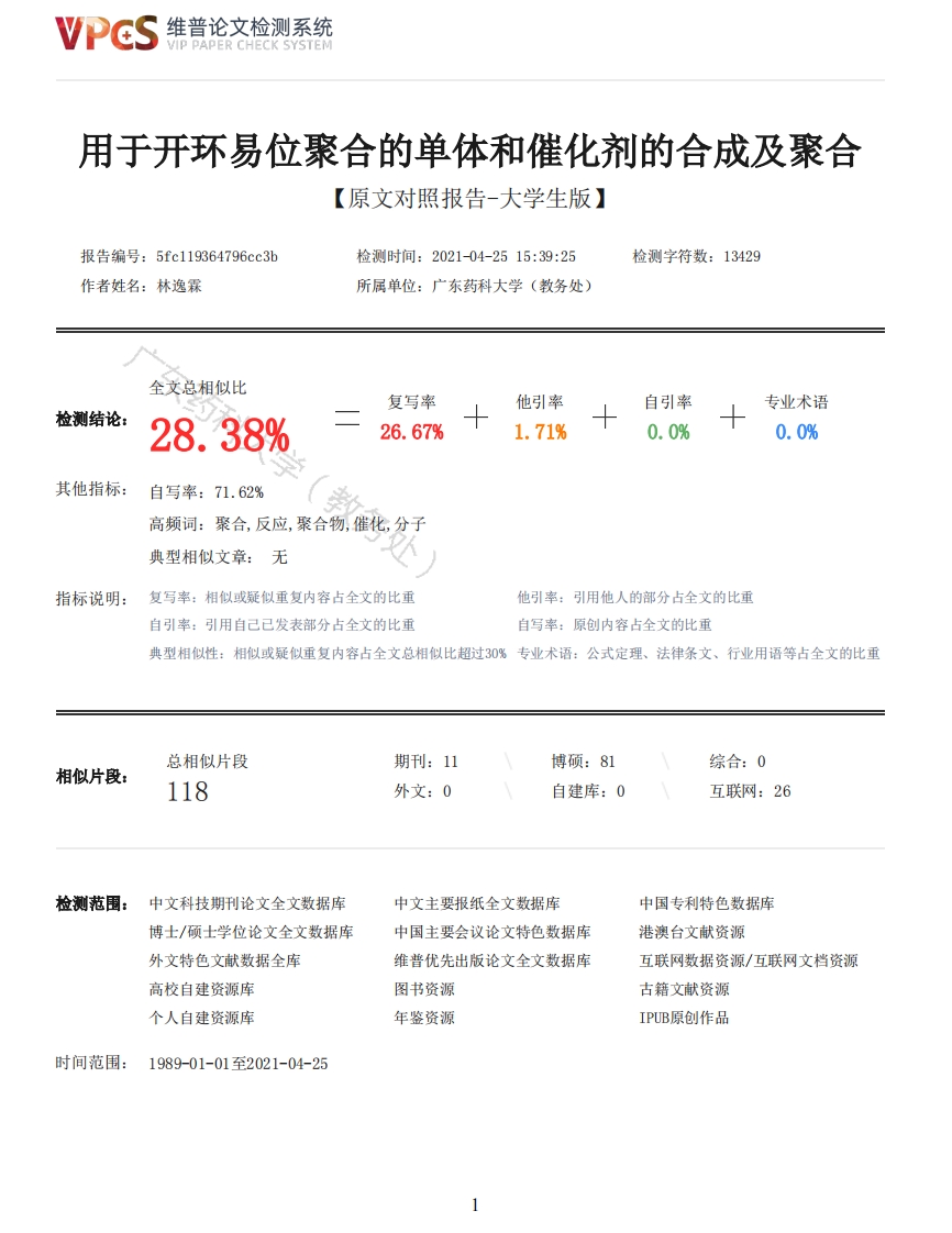 维普论文检测系统/IP PAPER CHECK SYSTEM用于开环易位聚合的单体和催化剂的合成及聚合【原文对照报告-大学生版】报告编号:5fc119364796cc3b检测时间:2021-04-2515:39:25检测字符数:13429作者姓名:林逸霖所属单位:广东药科大学(教务处)全文总相似比复写率他引率自引率专业术语检测结论:28.38%26.67%1.71%0.0%0.0%其他指标:自写率:71.62%高频词:聚合,反应,聚合物,催化,分子典型相似文章:无指标说明:复写率:相似或疑似重复内容占全文的比重他引率:引用他人的部分占全文的比重自引率:引用自己已发表部分占全文的比重自写率:原创内容占全文的比重典型相似性:相似或疑似重复内容占全文总相似比超过30%专业术语:公式定理、法律条文、行业用语等占全文的比重总相似片段期刊:11博硕:81综合:0相似片段:118外文:0自建库:0互联网:26检测范围:中文科技期刊论文全文数据库中文主要报纸全文数据库中国专利特色数据库博士/硕士学位论文全文数据库中国主要会议论文特色数据库港澳台文献资源外文特色文献数据全库维普优先出版论文全文数据库互联网数据资源/互联网文档资源高校自建资源库图书资源古籍文献资源个人自建资源库年鉴资源IPUB原创作品时间范围:1989-01-01至2021-04-25维普论文检测系统VIP PAPER CHECK SYSTEM原文对照颜色标注说明:■自写片段■复写片段(相似或疑似重复)口引用片段(引用)■专业术语(公式定理、法律条文、行业用语等)GUANGDONG PHARMACEUTICAL UNIVERSITY1958GDPU1本科毕业论文(设计)用于开环易位聚合的单体催化剂的合成及聚合二级学院医药化工学院专业应用化学班级17精细化工2班学生姓名林逸霖学号1721502242指导教师刘文杰2021年4月诚信声明我声明,所呈交的毕业论文(设计)是本人在老师指导下进行的研究工作及取得的研究成果。据我查证,除了文中特别加以标注和致谢的地方外,论文(设计)中不包含其他人已经发表或撰写过的研究成果,也不包含为获得其他教育机构的学位或证书而使用过的材料。我承诺,论文(设计)中的所有内容均真实、可信。毕业论文(设计)作者(签名):年月日用于开环易位聚合的单体催化剂的合成及聚合【摘要】自20世纪50年代中期发现烯烃化合物以来,人们对利用这种多功能反应合成大分子材料产生了浓厚的兴趣。近年来,活性开环异位聚合(ROMP)是烯烃元化反应的一种变体,已成为合成具有可调谐尺寸、形状和功能的聚2维普论文检测系统VIP PAPER CHECK SYSTEM合物的一种特别有力的方法。该技术在制备具有有趣的生物、电子和力学性能的材料方面取得了巨大的应用。开环易位聚合本质上不同于链烯烃的双键开裂彼此加成聚合,也不同于内酰胺、环醚、内酯等杂环的开环聚合,而是经由过程双键的不停的易位,使得链逐步扩展,而单体中的双键、单键及环布局在所得聚合物反复单位中仍然连结稳定。因此,利用环烯烃的开环易位聚合,在温和条件下,通过快速反应获得完全交替的共聚物。本文着重于用于开环异位聚合(ROMP)的异腈单体在金属钯配合物合成路线的可行性验证和聚合反应体系最佳投料比的探究。【关键词】开环异位聚合(ROMP);钯配合物:聚苯异腈Synthesis and polymerization of monomer catalysts for ring opening translocation polymerization[Abstract]since the discovery of olefins in the mid-1950s,people have been interested in thesynthesis of macromolecular materials by this multifunctional reaction.In recent years,living ringopening heterotopic polymerization (ROMP),a variant of olefin metathesis,has become a particularlypowerful method for the synthesis of polymers with tunable size,shape and function.This technologyhas been widely used in the preparation of materials with interesting biological,electronic andmechanical properties.Ring opening translocation polymerization is essentially different fromdouble bond cleavage and mutual addition polymerization of alkenes,and from ring openingpolymerization of lactams,cyclic ethers,lactones and other heterocycles.Instead,the chain isgradually expanded through continuous double bond translocation,while the double bond,single bondand ring structure of monomer remain unchanged in the obtained polymer repeating unit.Therefore,using ring opening and translocation polymerization of cycloalkenes,completely alternatingcopolymers can be obtained by rapid reaction under mild conditions.This paper focuses on thefeasibility verification of isonitrile monomer for ring opening heterotopic polymerization (ROMP)inthe synthesis route of metal palladium complex and the exploration of the optimal feed ratio ofpolymerization reaction system.[keyword]Ring opening heterotopic polymerization (ROMP)palladium complex polyphenyleneisonitrile目录1前言61.1研究背景61.2立题依据61.3研究思路82相关研究进展82.1开环异位聚合的研究进展82.1.1烯烃位移反应简介82.1.2烯烃位移反应的几种类型82.1.3开环易位聚合(ROMP)反应92.1.4活聚合的概念102.2钯含磷配合物催化剂的研究进展112.3聚苯异腈的研究进展112.4聚合物刷简介122.5小结133实验设计133.1实验试剂及实验器材133.3.1实验试剂133.3.2实验器材133.2异腈类单体的合成143.2.1对硝基苯甲酸的酯化143.2.2硝基苯氨化143.2.3氨基N取代酰胺化143