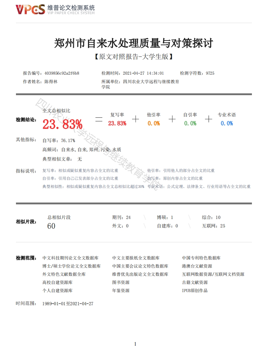 维普论文检测系统VIP PAPER CHECK SYSTEM郑州市自来水处理质量与对策探讨【原文对照报告-大学生版】报告编号:4039856c92a2f6b8检测时间:2021-04-2714:34:01检测字符数:9725作者姓名:陈得林所属单位:四川农业大学远程与继续教育学院全文总相似比复写率他引率自引率专业术语检测结论:23.83%23.83%0.0%0.0%0.0%其他指标:自写率:76.17%高频词:自来水,自来,郑州,污染,水质典型相似文章:无指标说明:复写率:相似或疑似重复内容占全文的比重他引率:引用他人的部分占全文的比重自引率:引用自己已发表部分占全文的比重自写率:原创内容占全文的此重典型相似性:相似或疑似重复内容占全文总相似比超过30%专业术语:公式定理、法律条文、行业用语等占全文的比重总相似片段期刊:24博硕:1综合:10相似片段:60外文:0自建库:0互联网:25检测范围:中文科技期刊论文全文数据库中文主要报纸全文数据库中国专利特色数据库博士/硕士学位论文全文数据库中国主要会议论文特色数据库港澳台文献资源外文特色文献数据全库维普优先出版论文全文数据库互联网数据资源/互联网文档资源高校自建资源库图书资源古籍文献资源个人自建资源库年鉴资源IPUB原创作品时间范围:1989-01-01至2021-04-27维普论文检测系统VIP PAPER CHECK SYSTEM原文对照颜色标注说明:■自写片段■复写片段(相似或疑似重复)口引用片段(引用)■专业术语(公式定理、法律条文、行业用语等)四川农业大学网络教育毕业论文专业学号W410219120181姓名陈得林成绩初审意见续教育学院初审老师签名:评审意见评审老师签名:备注郑州市自来水处理质量与对策探讨专业:环境工程学号:W410219120047学生姓名:朱贝贝(指导教师肖银龙)【摘要】本文在技术和管道网络技术的基础上,本文侧重于郑州当前阶段自来水系统的分析,提出改进,以改善现有的缺点和缺陷,使其更加完整。总结和分析当前的两个自来水处理过程,并比较两个过程。为应对郑州自来水系统时期的情况和存在的问题,可以应用水处理过程和先进的管网技术,可以提高水质标准。综合例,指出郑州市水水后的发展方向及其必要性。【关键词】郑州自来水:水处理:管网:分析:完善:供水始终是人民的生计。很长一段时间,无论是在城市都追求水的城市居民都已被释放。然而,自20世纪70年代以来,我国的水资源越来越受到污染,特别是在工业废水的工业废水中,使各种有机污染物质能够进入城市水源。通过这种方式,近年来,已经有一些水厂来处理一些污染物,以有效去除某些污染物,如二级污染等,使自给2维普论文检测系统VIP PAPER CHECK SYSTEM式水质的测试率难以确保非一打击水自来水。中原经济区是基于郑州大都市区作为核心,同时周边辐射郑州市、洛阳市。得到郑州市供水集团得到支持,涵盖河南省经济区扩大周边地区的经济区。它位于中国中央中心。它已在该国主要功能区发挥该地区。地理位置是发展运输,巨大的市场潜力,深层文化遗产,在国家改革和发展的重要地位具有重要的战略地位,已经发展成为一个有一定影响的国际城市。然而,郑州的供水情况远非发展速度。为满足郑州市的用水需求,目前郑州市供水主要依靠外地水,通过调剂东江水来解决城市本地水源的严重供应问题。随着海外供水工程,如供水工程的建设,城市的海外援助从2000年的40%增加到2010年的40%至72%。根据《郑州市水资源综合规划》。东江和郑州本地储水工程属于同一水系统和气象区,其径流特征与郑州相似。在一年中,年度分布极为不均匀,遇到了危机的可能性,如顶级,连续干燥的年度和水污染。它也不能被忽视。郑州市增加了外国水的依赖程度,供水能力很容易受到东江水域的情况影响,郑州的供水水将会严重,城市将严重。应急供水能力并不乐观。因此,在摘要中,分析了郑州自来水现状,进入自来水开发方向深入研究。一、相关概念(一)自来水自来水是指通过自来水处理植物和消毒纯化的水,并产生由相应标准产生的水。生命用水主要吸引河流和湖泊和地下水,通过水厂的地面水,水厂按照“国家生活饮用水”对待。发送给每个用户。从2013年1月15日起,我在撰写论文的时候登录了北京水电集团网站,通过网站的数据找到了上一季度出水质数据信息,网站数据中包括42个工厂日常水质的指标,水质的最大值和每个季度值的最低数据结果,来通过和国家标准相比,进行分析。中国的自来水职业生涯于1908年出生于清朝结束。(二)自来水处理过程及消毒方法:1.自来水处理过程自来水是一款多击流过程,通过专业设备制造的饮用水。自来水的过程如下:根据流程,首先要从从河湖到水厂,然后在混凝土后,沉淀,滤液,并将其送入供水箱并消毒。水管通过供水泵输入水供应管。一般来说,预应力管,钢管,PB管,延性铁管等管:最后流向用户的水龙头。整个过程必须通过多种水质测试,有些地方必须通过二次加压,二次消毒可以进入用户的家庭。院3