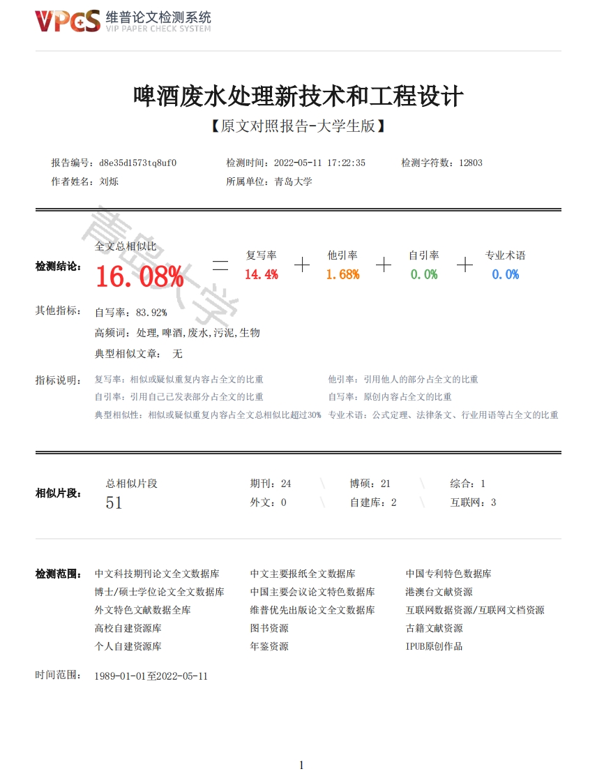 维普论文检测系统/IP PAPER CHECK SYSTEM啤酒废水处理新技术和工程设计【原文对照报告-大学生版】报告编号:d8e35dl573tq8uf0检测时间:202205-1117:22:35检测字符数:12803作者姓名:刘烁所属单位:青岛大学全文总相似比复写率他引率自引率专业术语检测结论:16.08%14.4%1.68%0.0%0.0%其他指标:自写率:83.92%高频词:处理,啤酒,废水,污泥,生物典型相似文章:无指标说明:复写率:相似或疑似重复内容占全文的比重他引率:引用他人的部分占全文的比重自引率:引用自己已发表部分占全文的比重自写率:原创内容占全文的比重典型相似性:相似或疑似重复内容占全文总相似比超过30%专业术语:公式定理、法律条文、行业用语等占全文的比重总相似片段期刊:24博硕:21综合:1相似片段:51外文:0自建库:2互联网:3检测范围:中文科技期刊论文全文数据库中文主要报纸全文数据库中国专利特色数据库博士/硕士学位论文全文数据库中国主要会议论文特色数据库港澳台文献资源外文特色文献数据全库维普优先出版论文全文数据库互联网数据资源/互联网文档资源高校自建资源库图书资源古籍文献资源个人自建资源库年鉴资源IPUB原创作品时间范围:1989-01-01至2022-05-11维普论文检测系统VIP PAPER CHECK SYSTEM原文对照颜色标注说明:■自写片段■复写片段(相似或疑似重复)■引用片段(引用)■专业术语(公式定理、法律条文、行业用语等)QINGDAO UNIVERSITY本科毕业论文(设计)啤酒废水处理新技术和工程设计New Technology and engineering design of brewery wastewater treatmen题目:啤酒废水处理新技术和工程设计学院:环境科学与工程学院专业:环境工程姓名:刘烁指导教师:李津2022年6月7日郑重声明本人呈交的学位论文(设计),是在指导教师的指导下,独立进行研究工作所取得的成果,所有数据、图片资料真实可靠。除文中已经注明引用的内容外,本学位论文(设计)的研究成果不包含他人享有著作权的内容。对本论文(设计)所涉及的研究工作做出贡献的其他个人和集体,均已在文中以明确的方式标明。本学位论文(设计)的知识产权归属于青岛大学。本人签名:日期:摘要结合国内外啤酒厂的研究现状、好氧生物处理和厌氧生物处理多种方法的优缺点以及进水水质,设计出一套较为合适的工艺流程。废水出水水质执行《啤酒工业污染物排放标准》(GB19821一2005),通过多方考虑,采用水力筛+UASB厌氧+生物接触氧化法对啤酒废水进行处理,处理流程如下:啤酒废水一废水集水池一水利弧形筛一初沉池一调节池一调配池一USB反应器一生物接触氧化池一絮凝反应池一二沉池一尾水排放池一出水。关键词活性污泥法生物接触氧化法UASB水利弧形筛ABSTRACT2维普论文检测系统VIP PAPER CHECK SYSTEMCombined with the research status of breweries at home and abroad,the advantages anddisadvantages of various methods of aerobic biological treatment and anaerobic biological treatment,and the quality of influent water,a more suitable technological process was designed.The effluent quality of the wastewater is in accordance with the "Beer Industry PollutantDischarge Standard"(GB19821-2005).Through various considerations,the brewery wastewater istreated by hydraulic sieve UASB anaerobic biological contact oxidation method.The treatmentprocess is as follows:Brewery wastewater -wastewater collection tank Hydraulic arc screenprimary sedimentation tank adjustment tank deployment tank UASB reactor biological contactoxidation tank flocculation reaction tank secondary sedimentation tank -tail water dischargetank effluent.Keywords Activated Sludge Method Biological Contact Oxidation Method UASB Hydraulic Curved Screen目录1.1研究背景1.2啤酒废水和来源和危害1.3国内外研究现状・・・第二章常用处理方法········2.1好氧生物处理···2.1.1活性污泥法····2.1.2生物膜法···2.1.3深井曝气法····2.2厌氧生物处理·····2.3啤酒废水处理工艺现状·第三章研究方法······3.1进水水质······12121213第四章各处理单元工艺说明··4.1废水集水池·······144.2水力弧形筛···4.4调节池·····4.5调配池···3