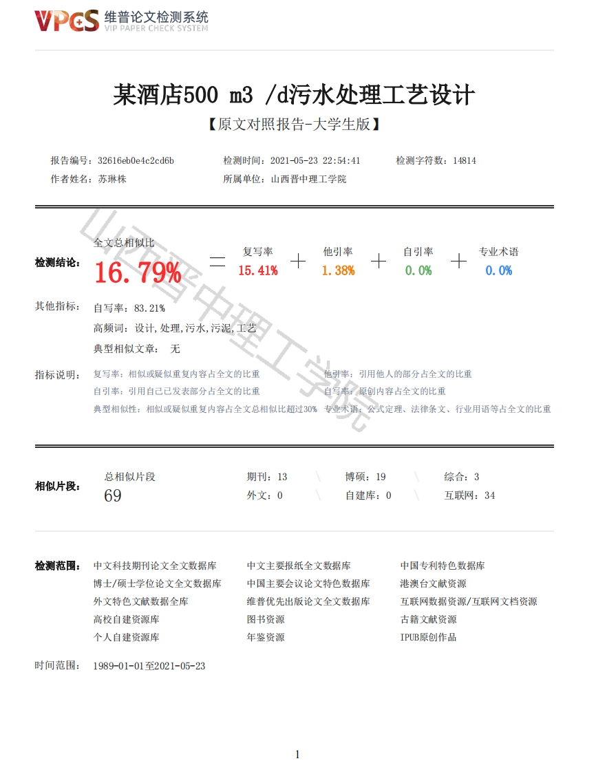维普论文检测系统VIP PAPER CHECK SYSTEM某酒店500m3/d污水处理工艺设计【原文对照报告-大学生版】报告编号:32616eb0e4c2cd6b检测时间:2021-05-2322:54:41检测字符数:14814作者姓名:苏琳株所属单位:山西晋中理工学院全文总相似比复写率他引率自引率专业术语检测结论:16.79%15.41%1.38%0.0%0.0%其他指标:自写率:83.21%高频词:设计,处理,污水,污泥,工艺典型相似文章:无指标说明:复写率:相似或疑似重复内容占全文的比重引用他人的部分占全文的比重自引率:引用自己已发表部分占全文的比重自写率:原创内容占全文的比重典型相似性:相似或疑似重复内容占全文总相似比超过30%专业术语:公式定理、法律条文、行业用语等占全文的比重总相似片段期刊:13博硕:19综合:3相似片段:69外文:0自建库:0互联网:34检测范围:中文科技期刊论文全文数据库中文主要报纸全文数据库中国专利特色数据库博士/硕士学位论文全文数据库中国主要会议论文特色数据库港澳台文献资源外文特色文献数据全库维普优先出版论文全文数据库互联网数据资源/互联网文档资源高校自建资源库图书资源古籍文献资源个人自建资源库年鉴资源IPUB原创作品时间范围:1989-01-01至2021-05-23维普论文检测系统VIP PAPER CHECK SYSTEM原文对照颜色标注说明:■自写片段■复写片段(相似或疑似重复)口引用片段(引用)■专业术语(公式定理、法律条文、行业用语等)中北大学信息商务学院毕业设计说明书某酒店500m3/d污水处理工艺设计系别:环境与安全工程系专业:环境工程指导教师:董慧清职称:中理工学院学生姓名:苏琳株学号:17040142432021年5月26日原创性声明本人郑重声明:所呈交的毕业设计说明书/毕业论文,是本人在指导教师的指导下,独立进行研究所取得的成果。除文中已经注明引用的内容外,本文不包含其他个人或集体已经发表或撰写过的科研成果。对本文的研究做出重要贡献的个人和集体均已在文中以明确方式标明。本声明的法律责任由本人承担。作者签名:日期:使用授权声明本人完全了解中北大学信息商务学院有关保管、使用毕业设计说明书/毕业论文的规定,其中包括:①学院有权保管、并向有关部门送交毕业设计说明书/毕业论文的原件与复印件:②学院可以采用影印、缩印或其它复制手段复制并保存毕业设计说明书/毕业论文:③学院可允许毕业设计说明书/毕业论文被查阅或借阅:④学院可以学术交流为目的,复制赠送和交换毕业设计说明书/毕业论文:⑤学院可以公布毕业设计说明书/毕业论文的全部或部分内容。作者签名:日期:导师签名:日期:某酒店500m3/d污水处理工艺设计摘要:本设计按照给定的原始数据、资料及国家法规、标准等相关要求,进行某酒店污水处理工艺设计。本设计污水处理量为500m3/d,进水水质为:C0D=600mg/L,B0D5=300mg/L,SS=260mg/L,NH3-=40mg/L,含油量=16g/L。本设计以SBR法为主体的污水处理工艺,配合以接触消毒过滤的深度污水处理工艺,使废水中的C0D、B0D5、SS、H3-N、含油量的去除率分别为90.0%、94.4%、93%、80.0%、80.0%,最后出水水质达到了《城镇污水处理厂污染物排放标准》(GB18918-2002)一级B标准。关键词:酒店污水;SBR工艺;设计计算Design of 500m3/d sewage treatment process for a hotelAbstract:This design according to the given original data,information and national regulations,2维普论文检测系统VIP PAPER CHECK SYSTEMstandards and other related requirements,a hotel sewage treatment process design.The designed sewagetreatment capacity is 500 m3/d,influent water quality:COD 600 mg/L,BOD5 300 mg/L,SS 260 mg/L,NH3-N=40 mg/L,oil content =16 mg/L.In this design,SBR process is the main sewage treatmentprocess,combined with contact disinfection and filtration of advanced sewage treatment process,Theremoval rates of COD,BOD5,SS,NH3-N and oil content in wastewater are 90.0%,94.4%,93%,80.0%,80.0%,respectively,Finally,the effluent water quality reached the level B standard of "PollutantDischarge Standard for Urban Wastewater Treatment Plant"(GB18918-2002).Key words:hotel sewage:SBR process:design calculation目录摘要IAbstractII目录III1前言12本设计的规模、任务、工艺选择32.1规模32.2任务32.3设计依据32.4工艺对选及工艺最终确定33工艺中构筑物的说明设计和计算63.1格栅的设计计算63.1.1设计说明63.1.2设计计算63.2隔油调节池的设计计算83.2.1设计说明83.2.2设计计算8中理工学院3.3反应沉淀池的设计计算103.3.1设计说明103.3.2设计计算103.3.3出水水质133.4配水池的设计计算133.4.1设计说明133.4.2设计计算143.5贮泥池的设计计算153.5.1设计说明153.5.2设计计算153.6SBR反应池的设计计算163.6.1设计说明163.6.2设计计算183.7快滤池的设计计算213.7.1设计说明223.7.2设计计算223.8消毒池的设计计算233.8.1设计说明233.8.2设计计算234结论265平面布置27参考文献283