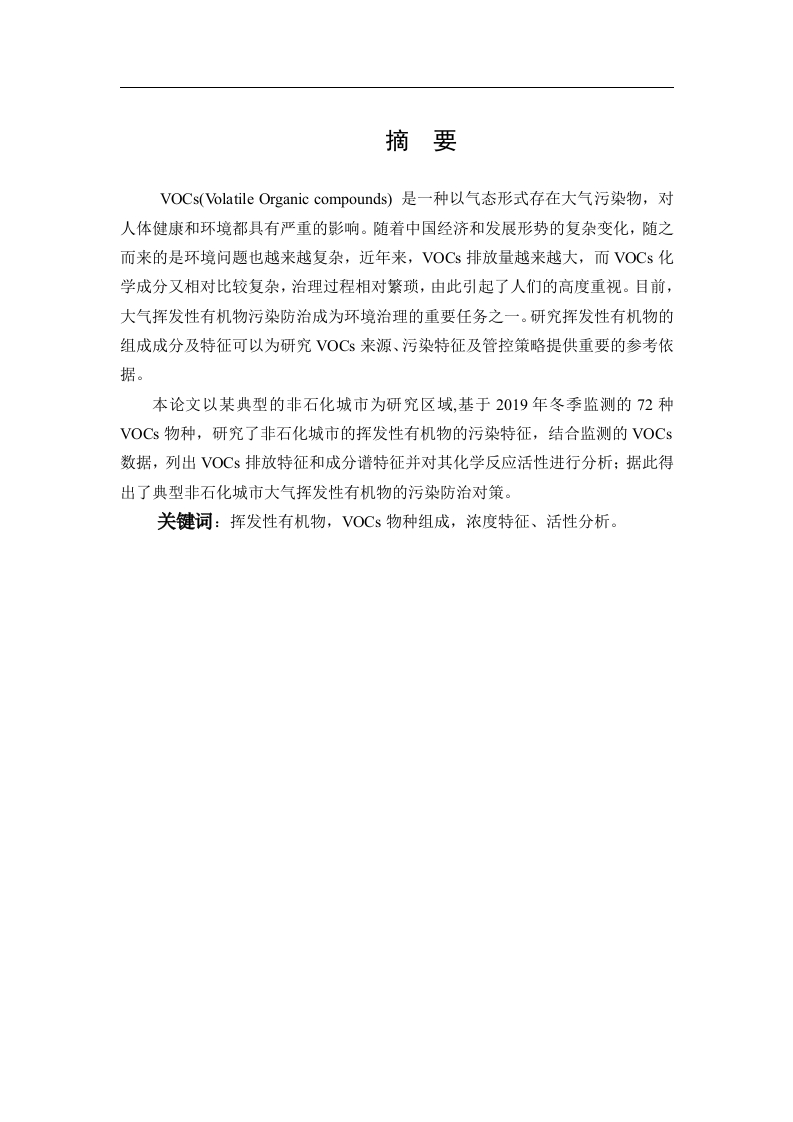 摘要VOCs(olatile Organic compounds)是一种以气态形式存在大气污染物,对人体健康和环境都具有严重的影响。随着中国经济和发展形势的复杂变化,随之而来的是环境问题也越来越复杂,近年来,VOCs排放量越来越大,而VOCs化学成分又相对比较复杂,治理过程相对繁琐,由此引起了人们的高度重视。目前,大气挥发性有机物污染防治成为环境治理的重要任务之一。研究挥发性有机物的组成成分及特征可以为研究VOCs来源、污染特征及管控策略提供重要的参考依据。本论文以某典型的非石化城市为研究区域,基于2019年冬季监测的72种VOCs物种,研究了非石化城市的挥发性有机物的污染特征,结合监测的VOCs数据,列出VOCs排放特征和成分谱特征并对其化学反应活性进行分析:据此得出了典型非石化城市大气挥发性有机物的污染防治对策。关键词:挥发性有机物,VOCs物种组成,浓度特征、活性分析。AbstractVOCs (volatile organic compounds)is a kind of air pollutants in the form of gas,which has a serious impact on human health and the environment.With the complexchanges of China's economy and development situation,the environmental problemsare becoming more and more complex.In recent years,the VOCs emissions areincreasing,and the chemical composition of VOCs is relatively complex,and thegovernance process is relatively complicated,which has attracted people's attention.At present,the prevention and control of VOC pollution has become one of theimportant tasks of environmental governance.The study on the composition andcharacteristics of VOCs can provide important reference for the study of VOCssources,pollution characteristics and control strategies.This paper takes a typical non petrochemical city as the research area,Based on72 VOCs species monitored from2019 in winter,the pollution characteristics of VOCsin non Petrochemical cities and the source analysis of VOCs in the atmosphere arestudied.In this paper,the receptor model method is used to analyze the sourceanalysis results of VOCs and compare them with other cities.Combined with theVOCs data monitored,the VOCs emission characteristics and composition spectrumcharacteristics are listed.The pollution control measures of VOCs in typical nonPetrochemical cities are put forward.Key words:VOCs,VOCs species composition,activation analysis.目录第1章引言1.1大气挥发性有机物(VOCs)概述..11.1.2VOCs的来源及危害1.2研究背景与意义1.3研究内容和技术关键…1.4技术路线4第2章样品采集方法…2.1VOCs样品采集方法.2.1.1采样地点52.1.2采样时间.…2.1.3采样方法.2.1.4质量体系保证制度.5第3章VOCs物种组成特征及成分谱特征73.1VOCs物种组成.…3.2VOCs物种检出率103.3VOCs整体浓度情况3.4VOCS排放源成分谱特征3.4.1工艺过程源成分谱特征3.4.2移动源成分谱特征143.4.3溶剂使用源成分谱特征.183.5本章小结…第4章某非石化城市V0Cs活性特征分析.…234.1V0Cs化学反应活性分析方法.234.2典型行业VOCs活性特征244.2.1陶瓷(日用陶瓷)行业VOCs活性特征..24